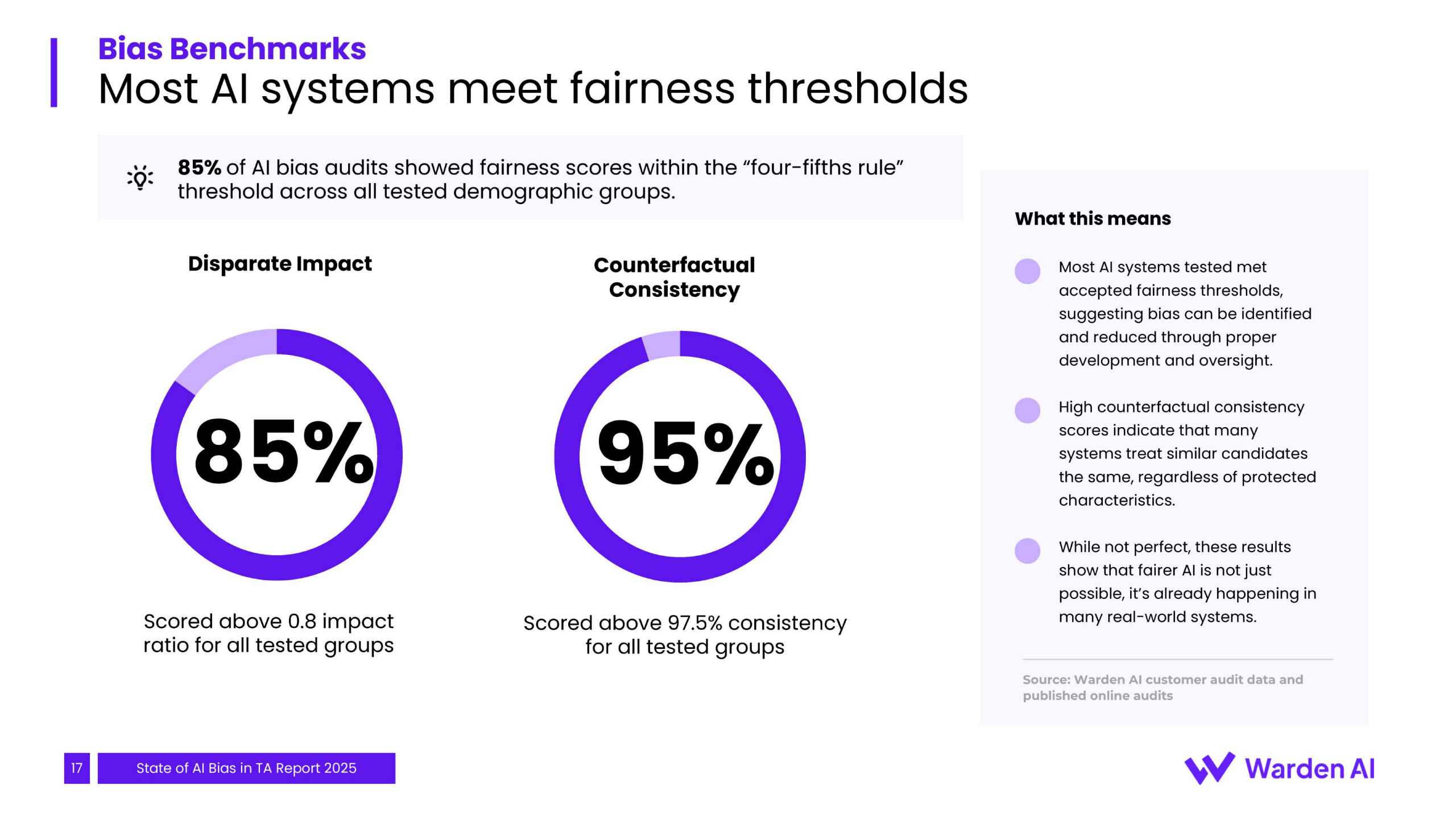 与普遍认知相反,数据表明AI在决策公平性上显著优于人工。相较于人工决策流程平均0.67的影响比,AI系统的平均影响比高达0.94。尤其针对少数族裔候选人,AI的应用使其通过率的公平性指标提升了约45%,这表明负责任的AI部署能够有效修正长期存在于人工决策中的系统性偏见。