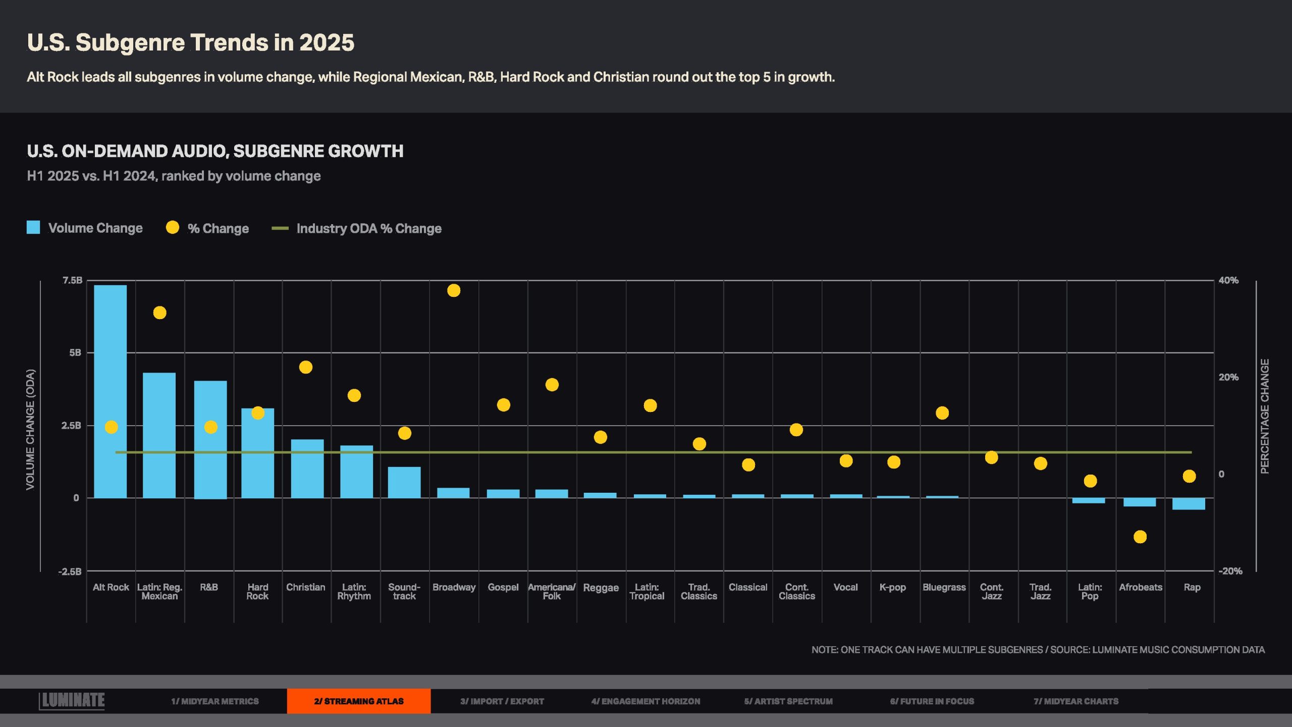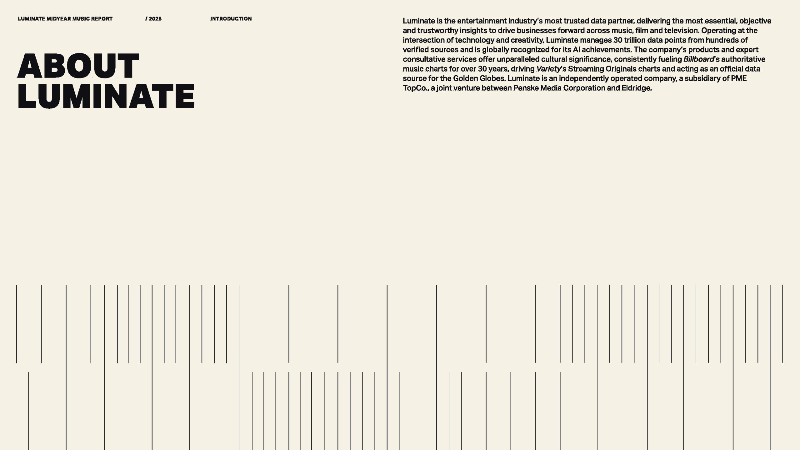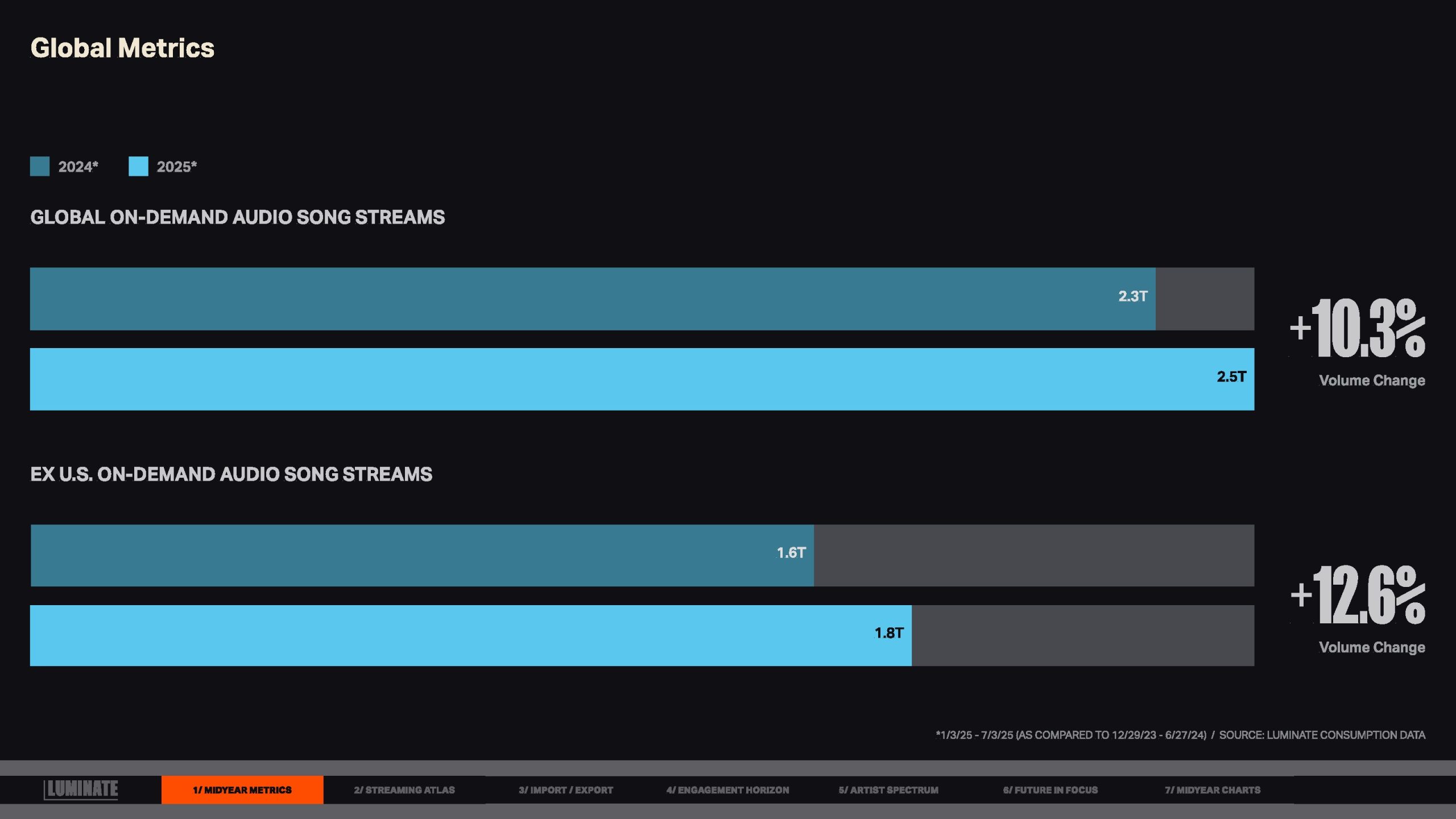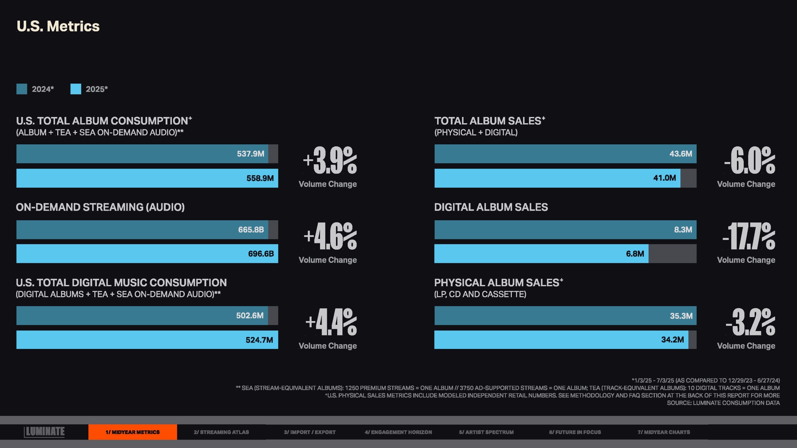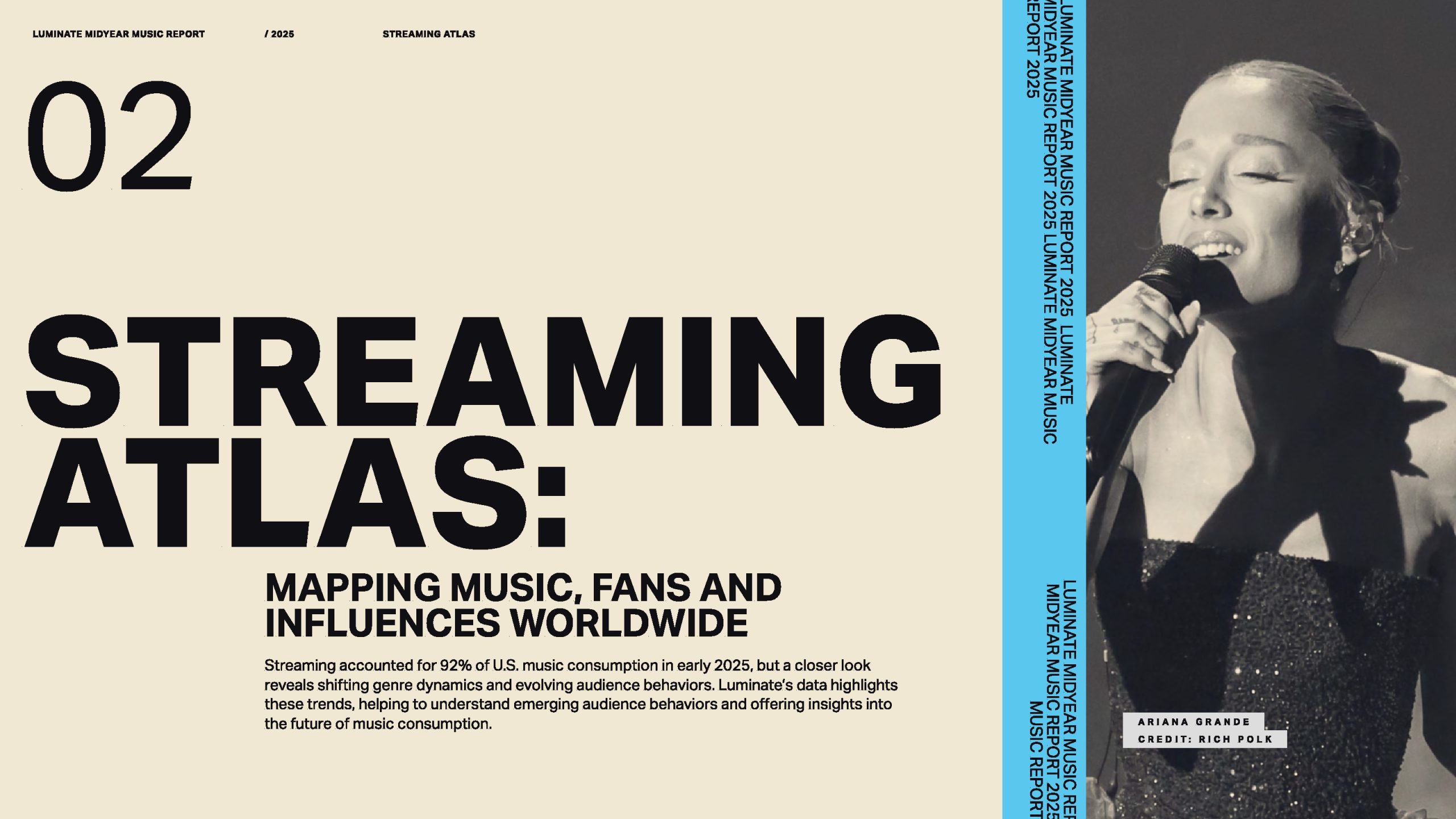 Luminate发布了“2025年年中音乐报告”,将关注焦点坚定锁定在音乐行业增长与颠覆的交汇点。过去六个月已在这两方面呈现丰富动态。