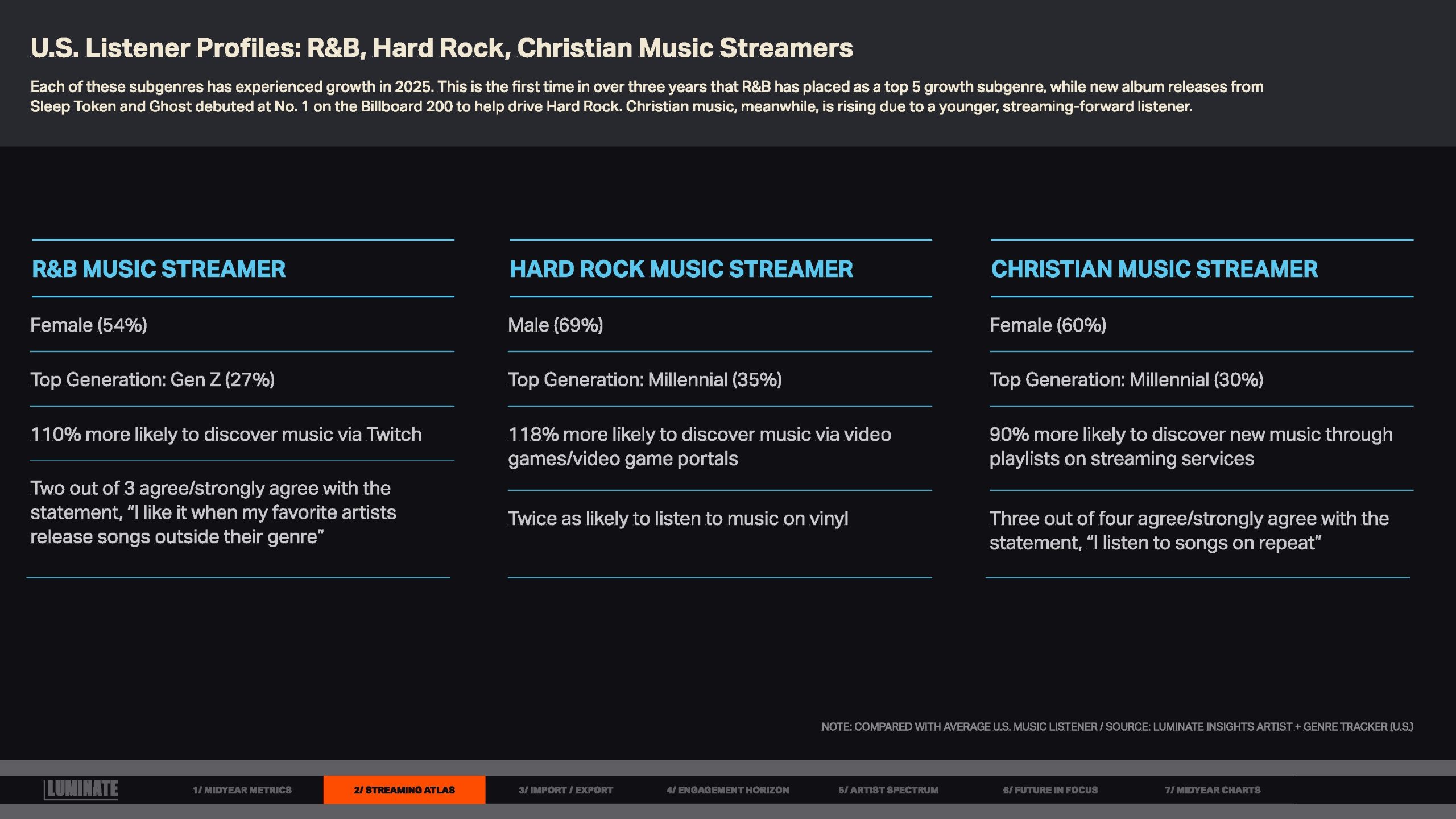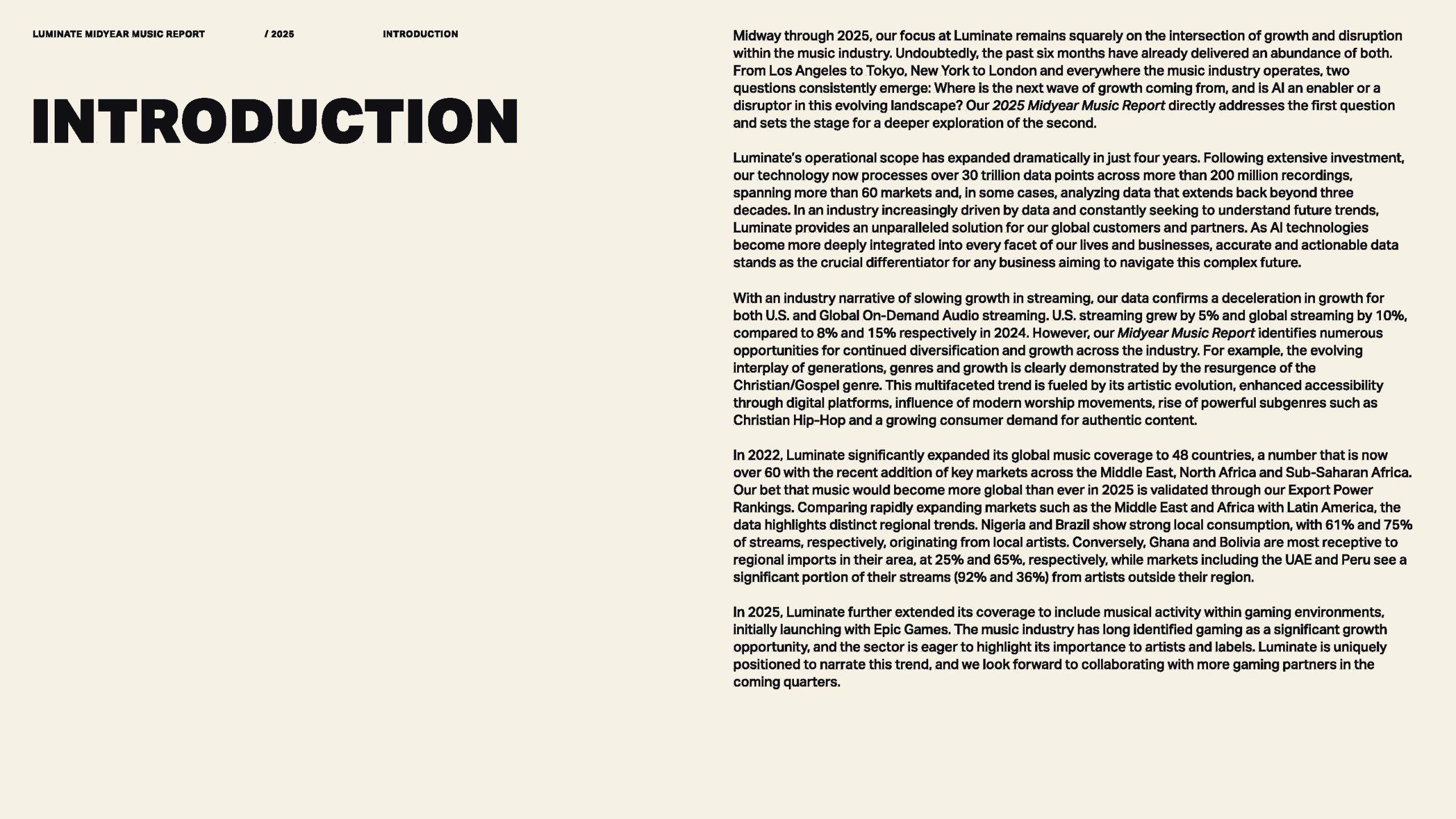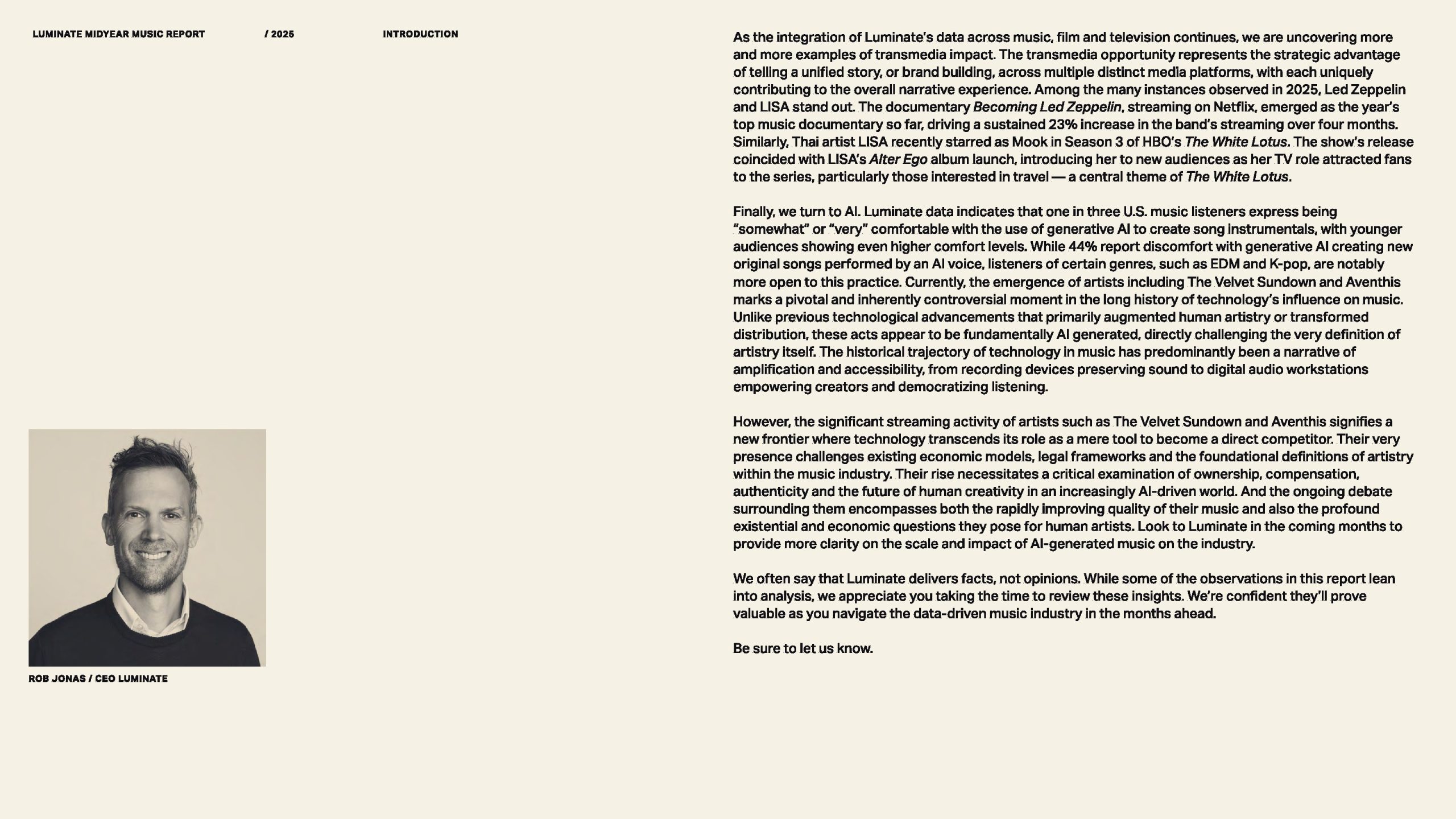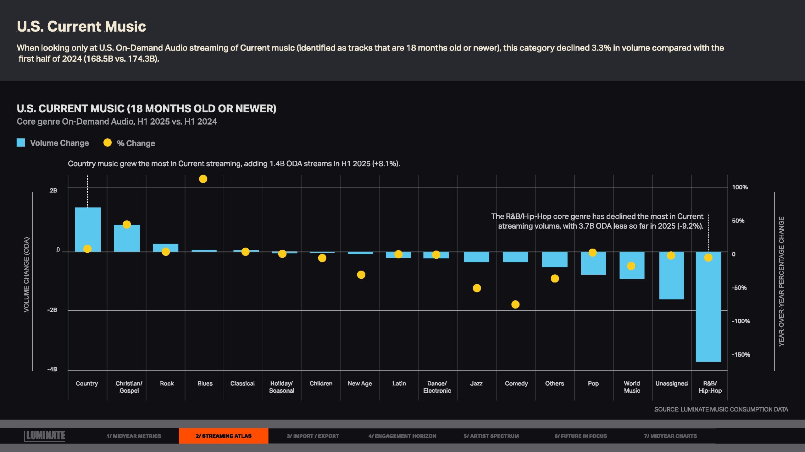 Luminate发布了“2025年年中音乐报告”,将关注焦点坚定锁定在音乐行业增长与颠覆的交汇点。过去六个月已在这两方面呈现丰富动态。