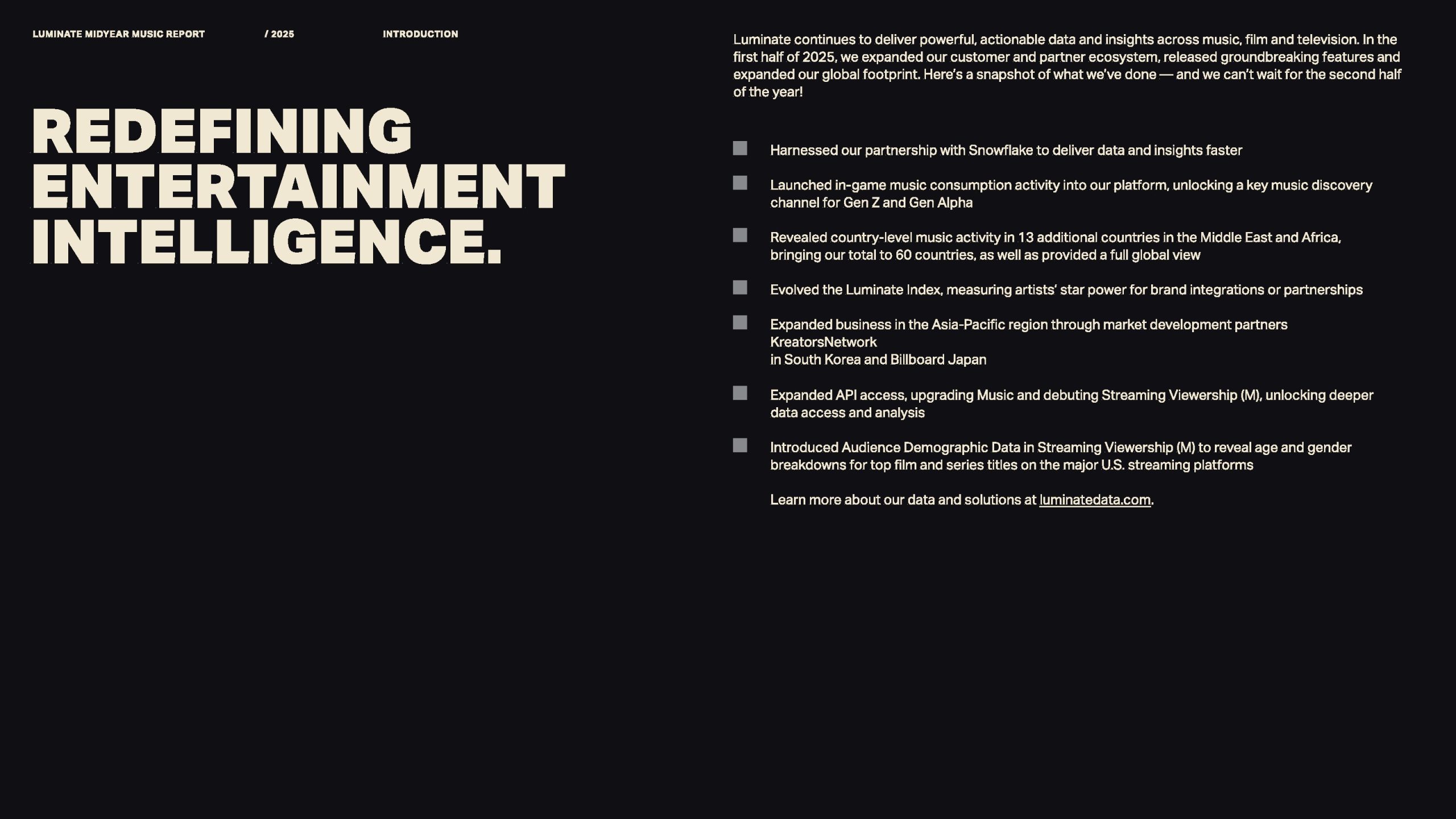 Luminate的业务范围现已处理超过30万亿数据点,覆盖逾2亿首录音作品,横跨60多个市场,部分数据甚至可追溯至三十多年前。
