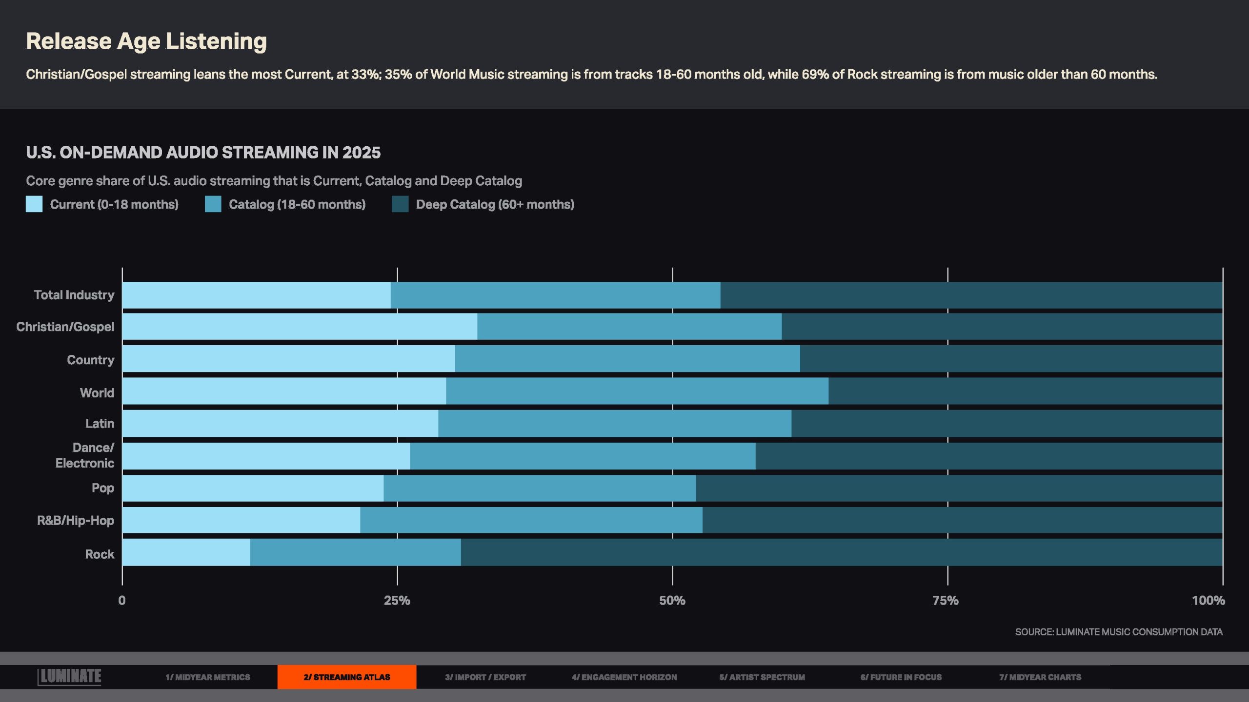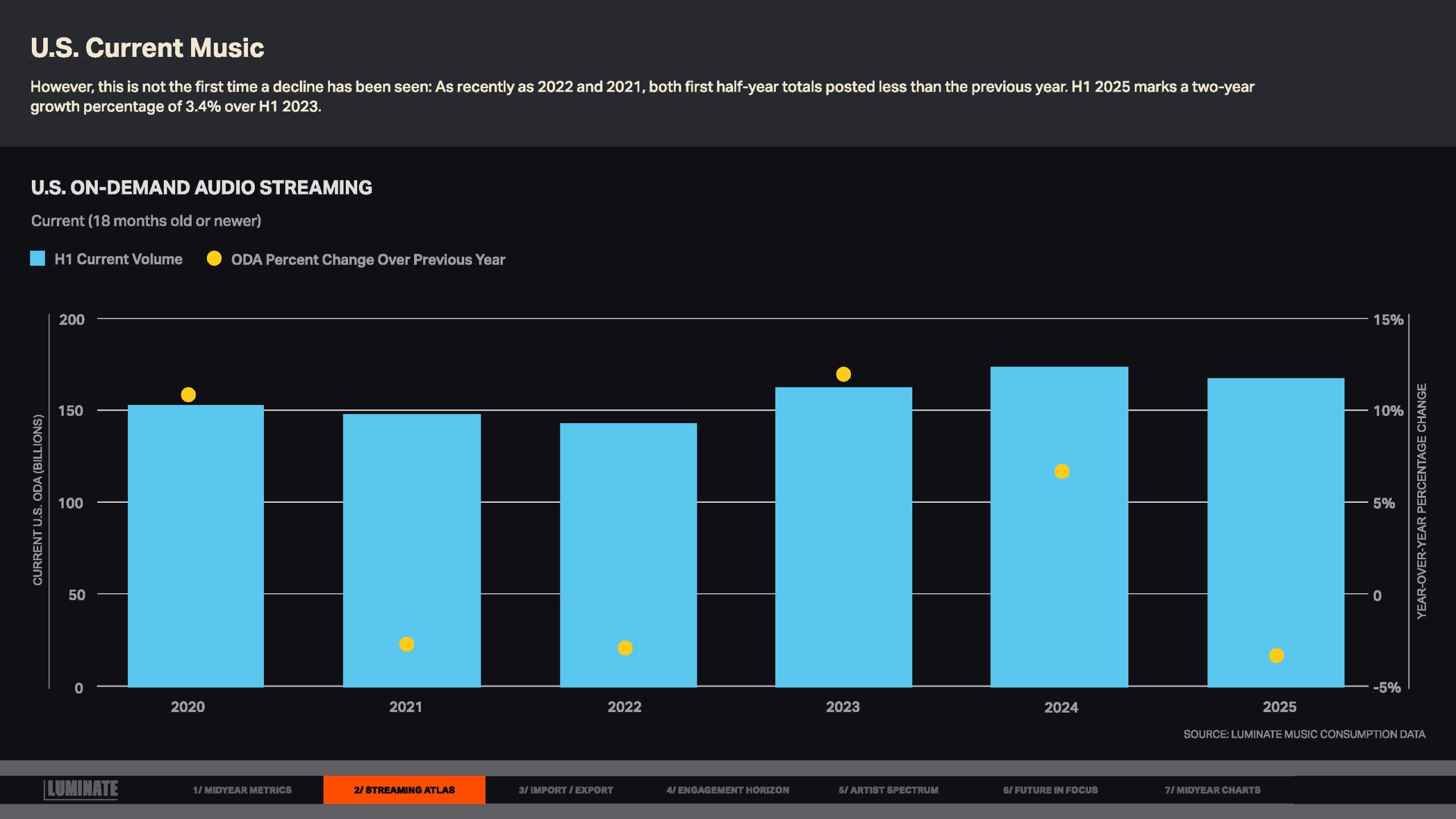 在行业普遍谈论流媒体增长放缓的背景下,数据证实美国和全球音频点播流媒体增速确实放缓:美国音乐流媒体增长5%,全球增长10%(2024年分别为8%和15%)。但年中报告同时揭示了行业持续多元化发展的众多机遇。