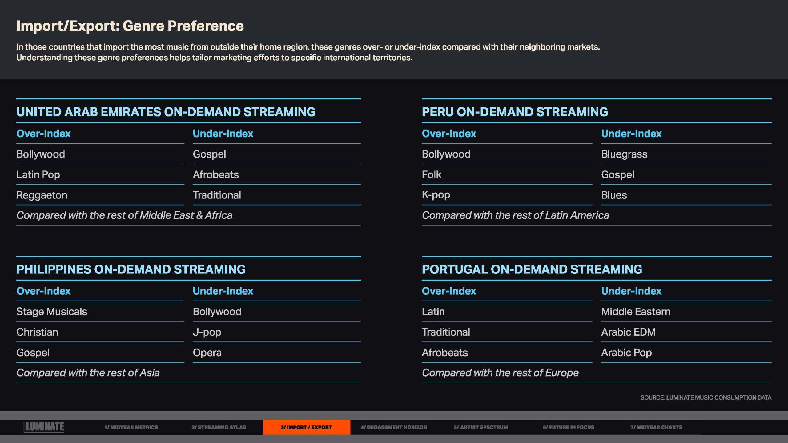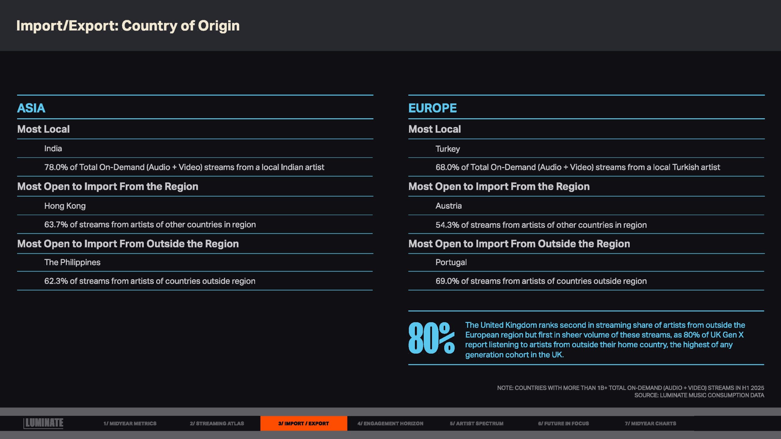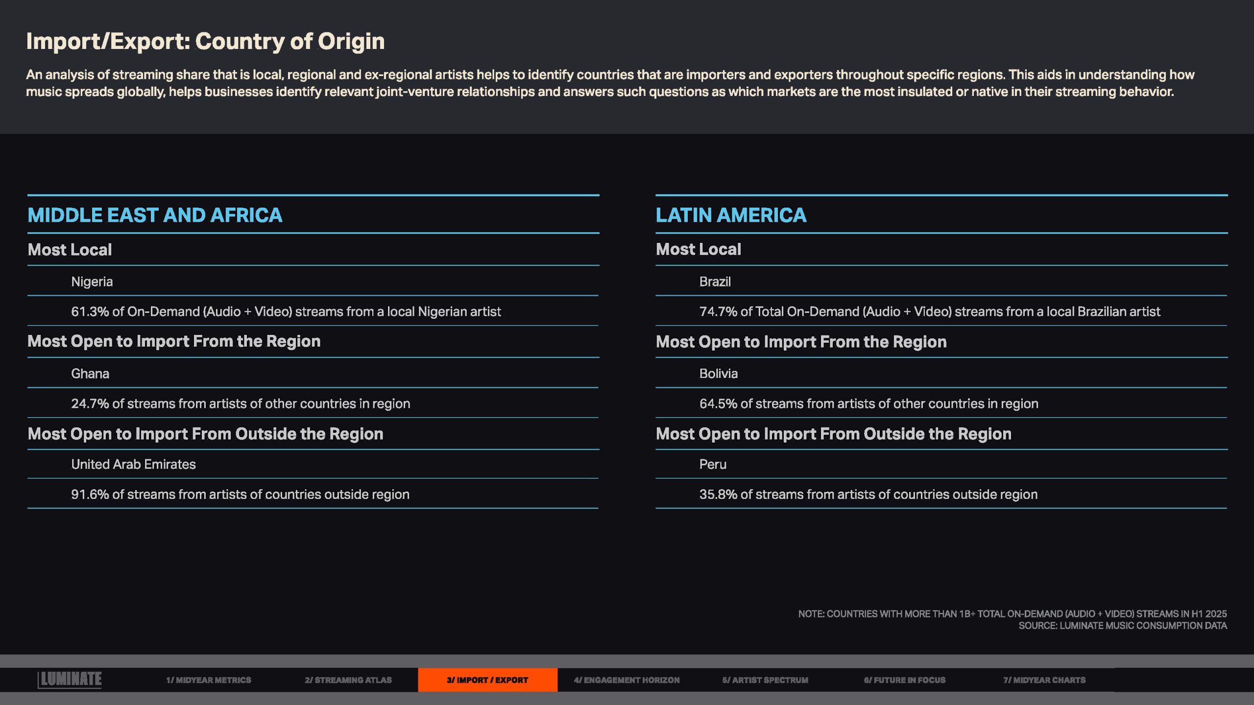 2022年Luminate将全球音乐覆盖范围大幅扩展至48个国家,随着近期新增中东、北非和撒哈拉以南非洲关键市场,现已突破60国。关于”2025年音乐将比以往更具全球化特征”的预判,正通过“出口实力排行榜”得到验证。将中东、非洲等快速扩张市场与拉丁美洲对比,数据凸显出鲜明的地域特征:尼日利亚和巴西本土消费强劲(分别有61%和75%流媒体来自本土艺人),而加纳和玻利维亚对本区域外来作品接受度最高(分别为25%和65%),阿联酋和秘鲁等市场则有显著比例流量来自域外艺人(分别达92%和36%)。