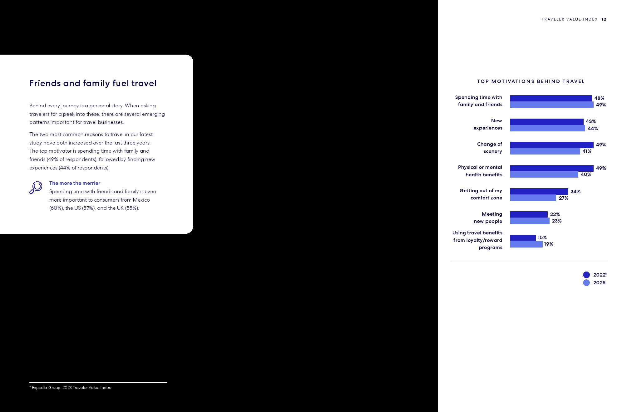 我们最新研究显示,近三年来最常见的两大旅行动机均呈现上升趋势。首要动机是与亲友共度时光(49%受访者选择),其次是寻求新体验(44%受访者选择)。