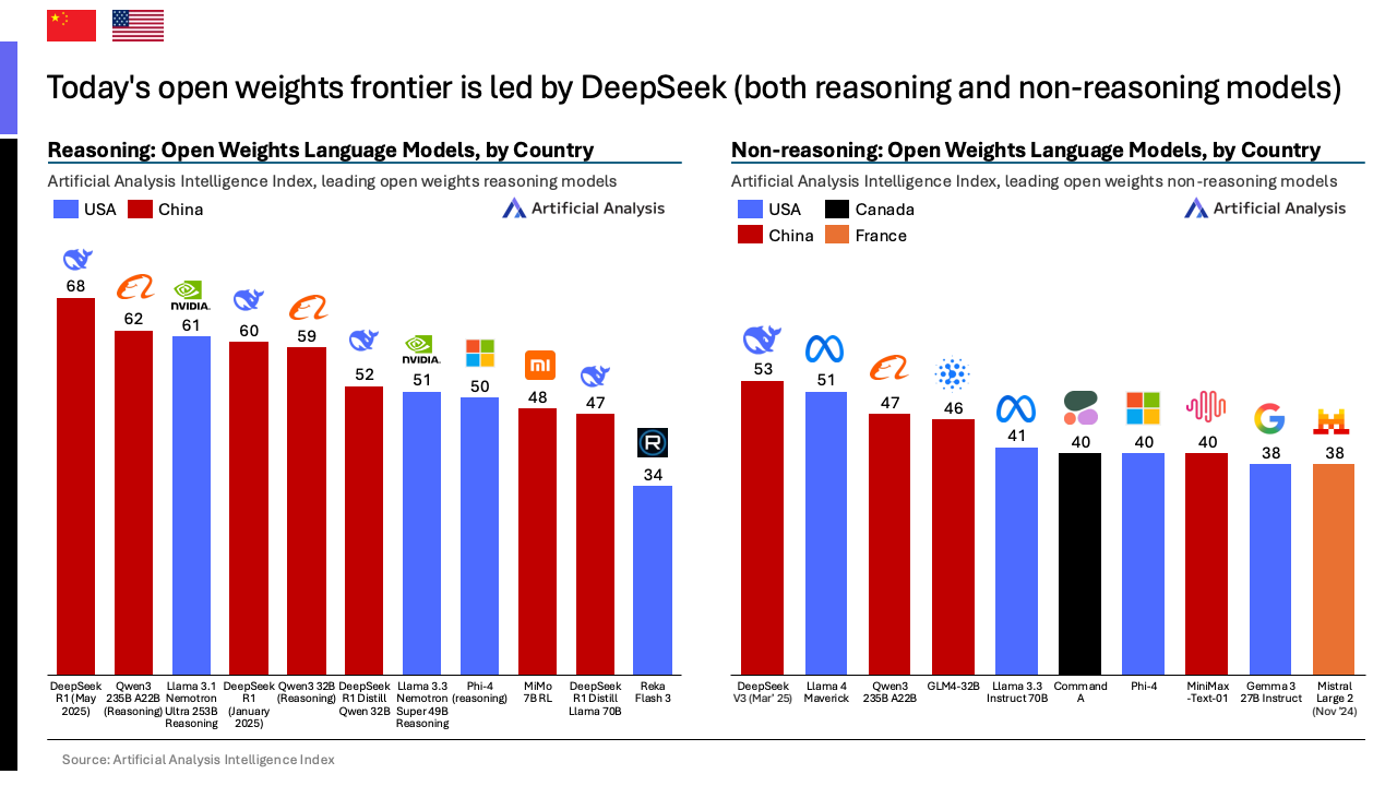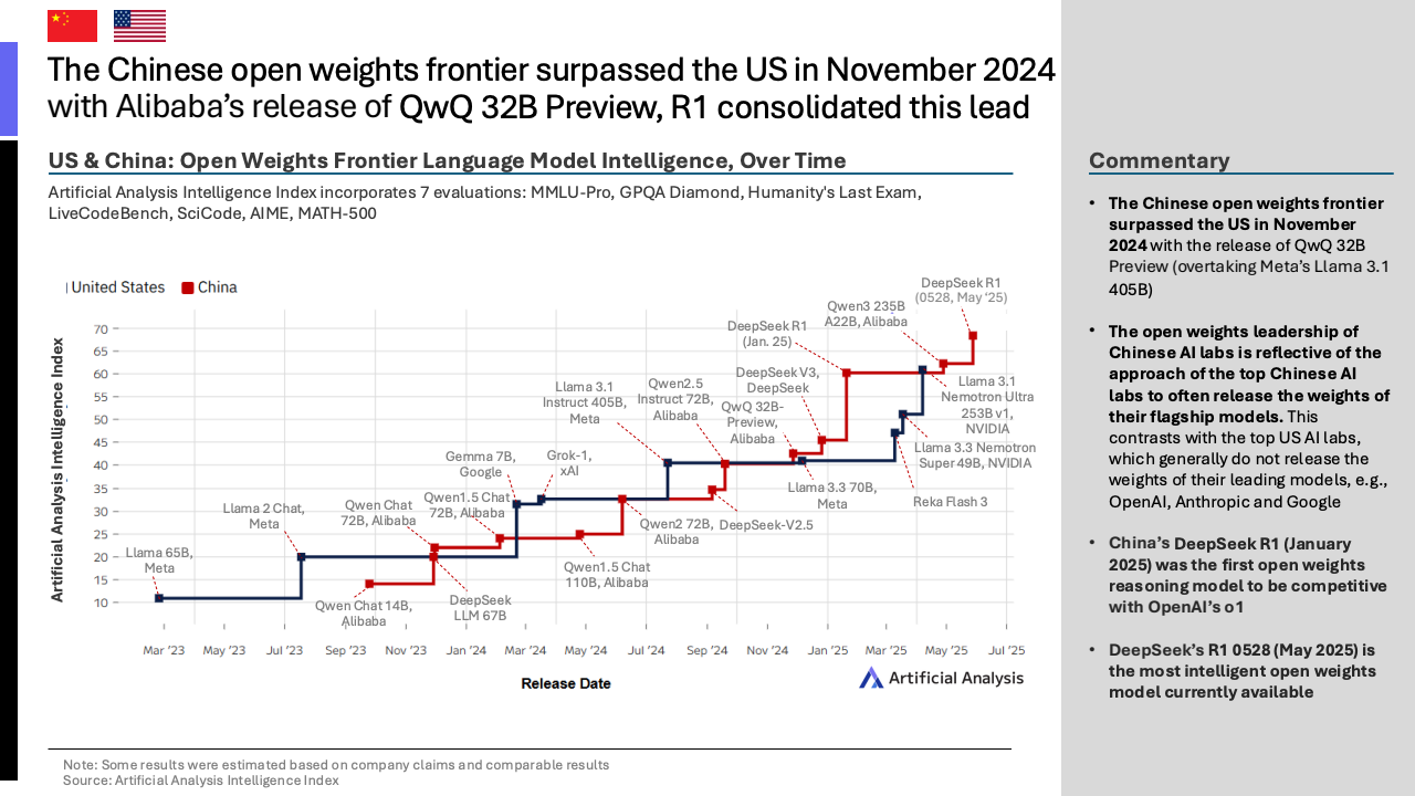 然而,在开源模型领域,中国已实现战略性超越。自2024年11月阿里巴巴发布QwQ 32B模型,首次在开源权重前沿超越美国Meta公司的Llama 3.1后,中国便在该领域确立了领先地位。目前,DeepSeek的R1 0528模型是全球性能最强的开源模型。这种领先反映了中美AI战略的根本差异:中国头部实验室倾向于开源其旗舰模型以构建生态,而美国顶级实验室如OpenAI和谷歌则普遍采取闭源策略。