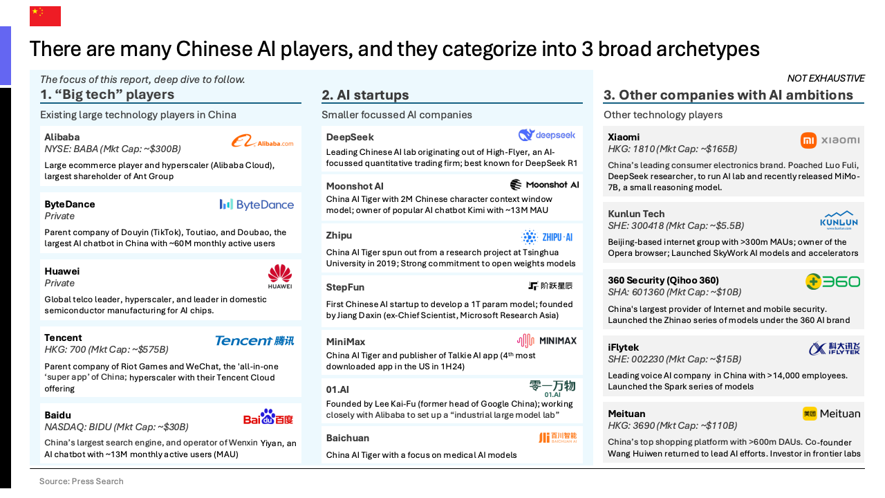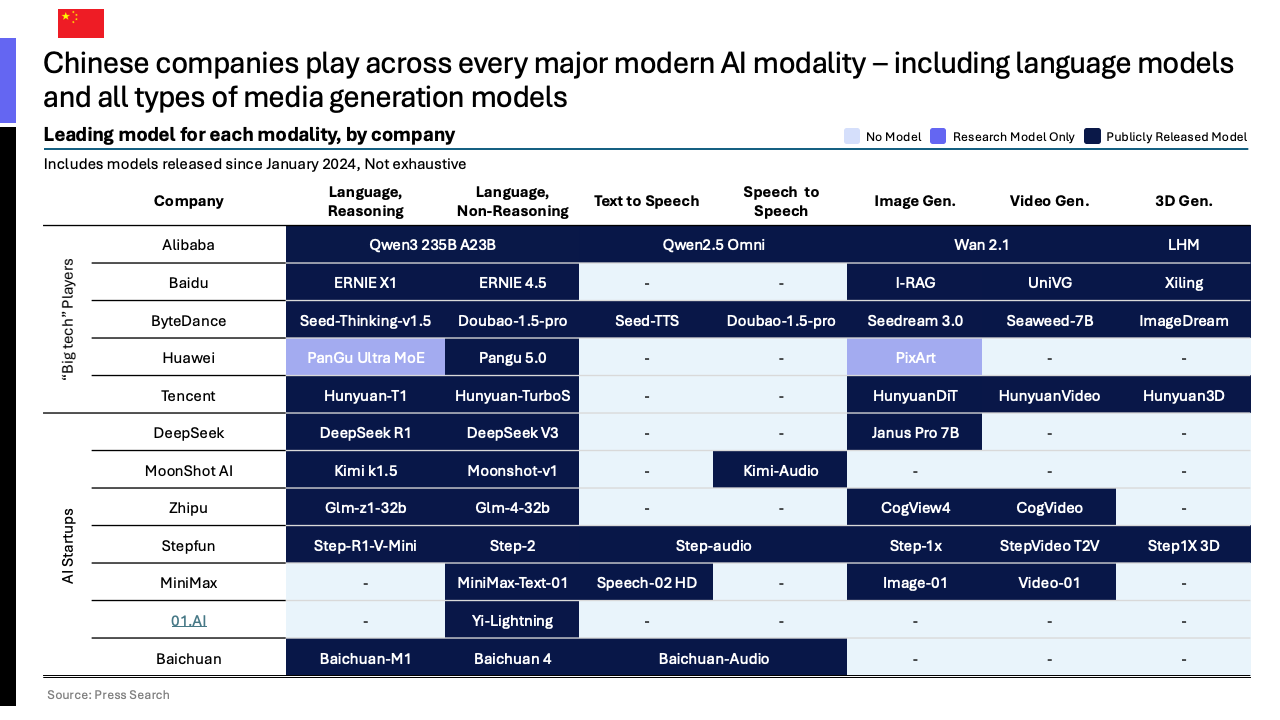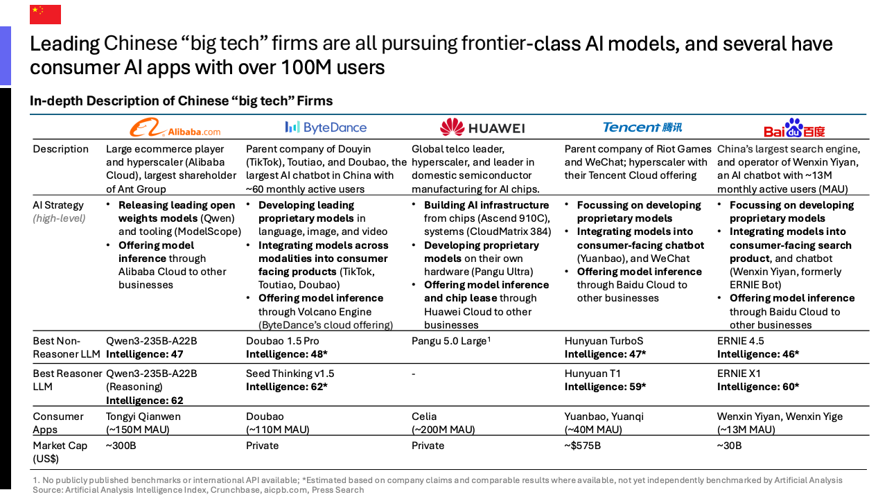 中国人工智能的快速崛起,得益于一个由科技巨头、初创企业和跨界公司构成的多元化且资本雄厚的生态系统。阿里巴巴、腾讯等巨头利用其庞大的用户基础和云服务推动AI应用,其AI聊天机器人的月活跃用户数分别达到约1.5亿和4000万。同时,像月之暗面(融资约16亿美元)和智谱AI(融资约11亿美元)等初创公司,在巨头资本的支持下,正以惊人的速度进行技术迭代。