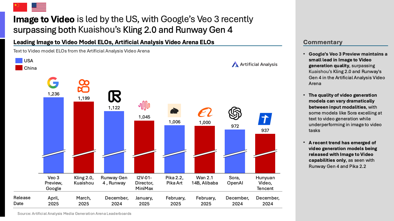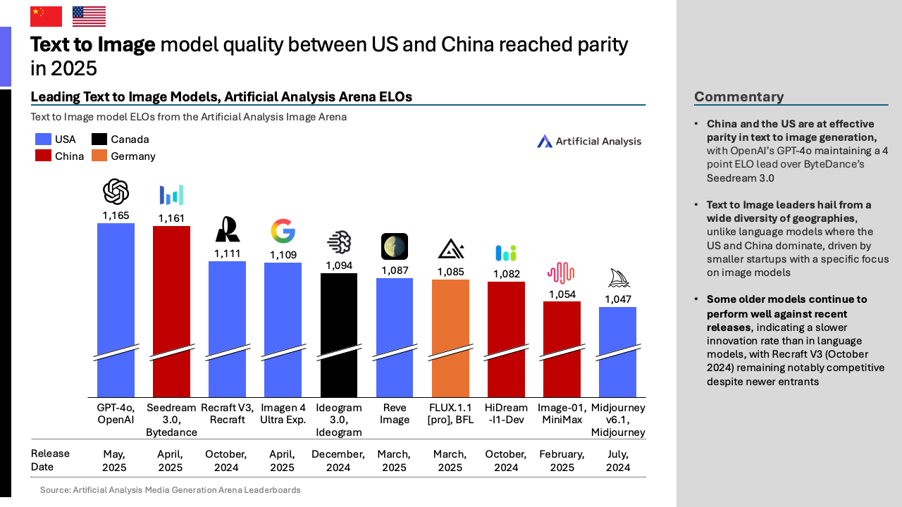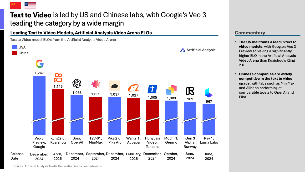 竞争的维度已从语言模型扩展至多模态能力。在文生图领域,中美已基本实现均势,OpenAI的GPT-4o与字节跳动的Seedream 3.0模型在ELO评分上仅相差4分。但在文生视频领域,美国凭借谷歌的Veo 3模型(ELO评分1247)仍保持明显优势,领先于中国快手的Kling 2.0(ELO评分1113)。这表明,尽管整体差距在缩小,但在特定细分赛道上,技术优势依然存在差异。