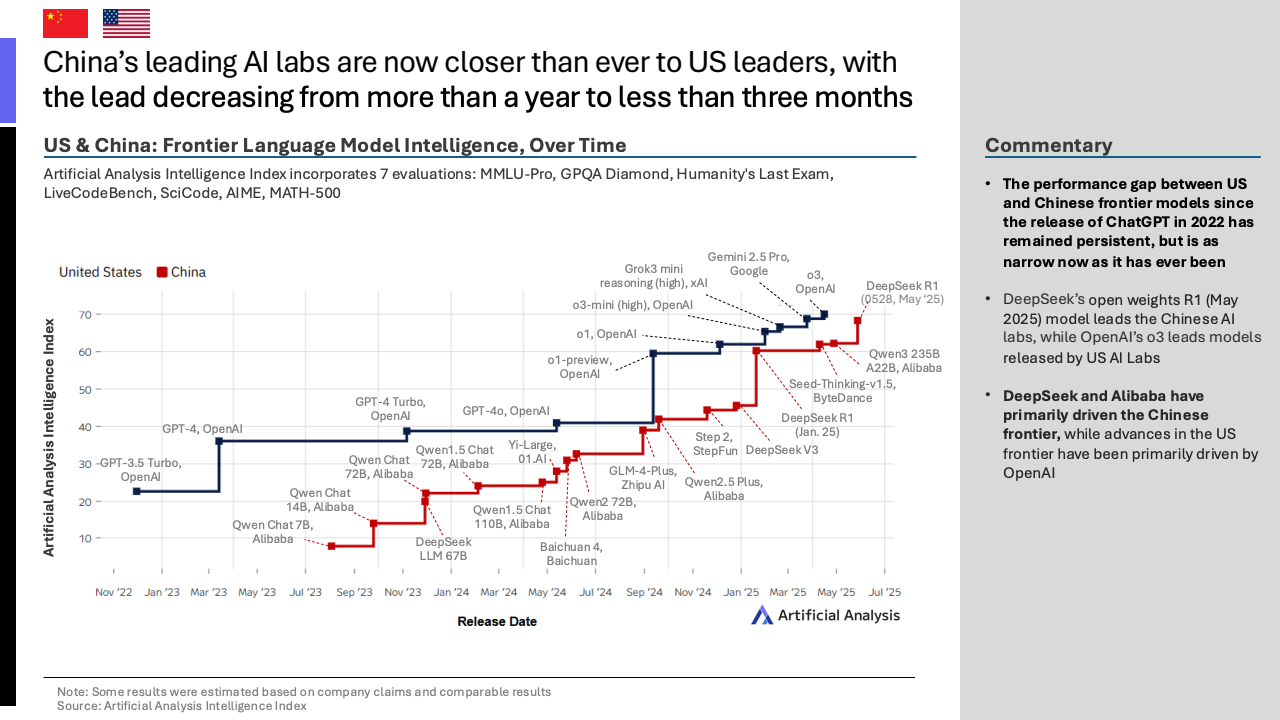 全球人工智能竞赛的格局正在发生深刻转变。根据Artificial Analysis最新数据,中美在前沿大语言模型领域的智能差距已从超过一年急剧收窄至不足三个月,标志着中国人工智能实力进入了新的发展阶段。这一变化预示着全球技术版图的重塑,竞争焦点也从单向追赶演变为多维度的战略博弈。