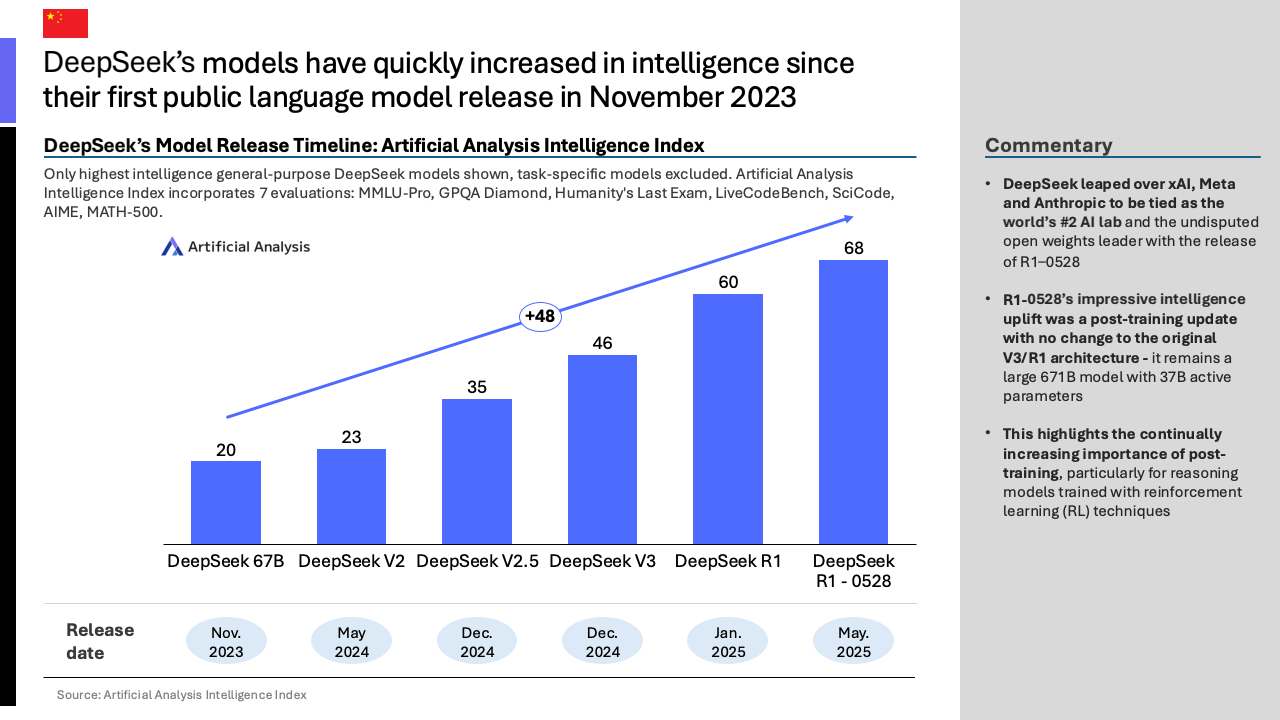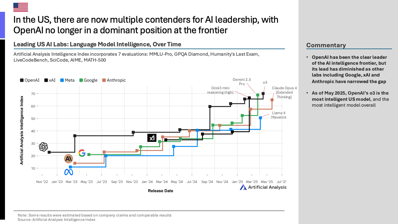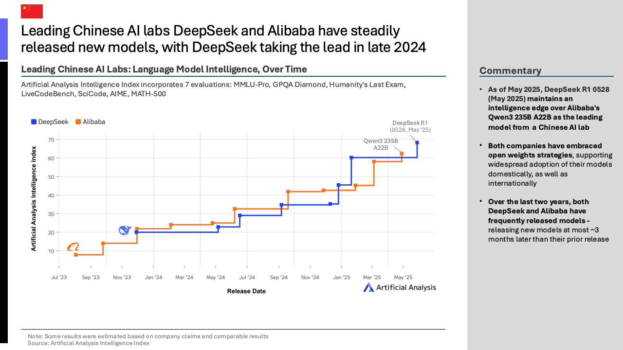在代表顶尖性能的前沿模型领域,竞争已趋白热化。截至2025年5月,OpenAI的o3模型以微弱优势领先,其在综合智能指数上得分接近70分。紧随其后的是中国DeepSeek公司发布的R1模型,得分高达68分,与谷歌的Gemini 2.5 Pro并驾齐驱。这背后是中国科技巨头与新兴力量的协同发力,其中阿里巴巴与DeepSeek是推动中国模型能力边界的主要贡献者,而美国的技术进步则主要由OpenAI引领。