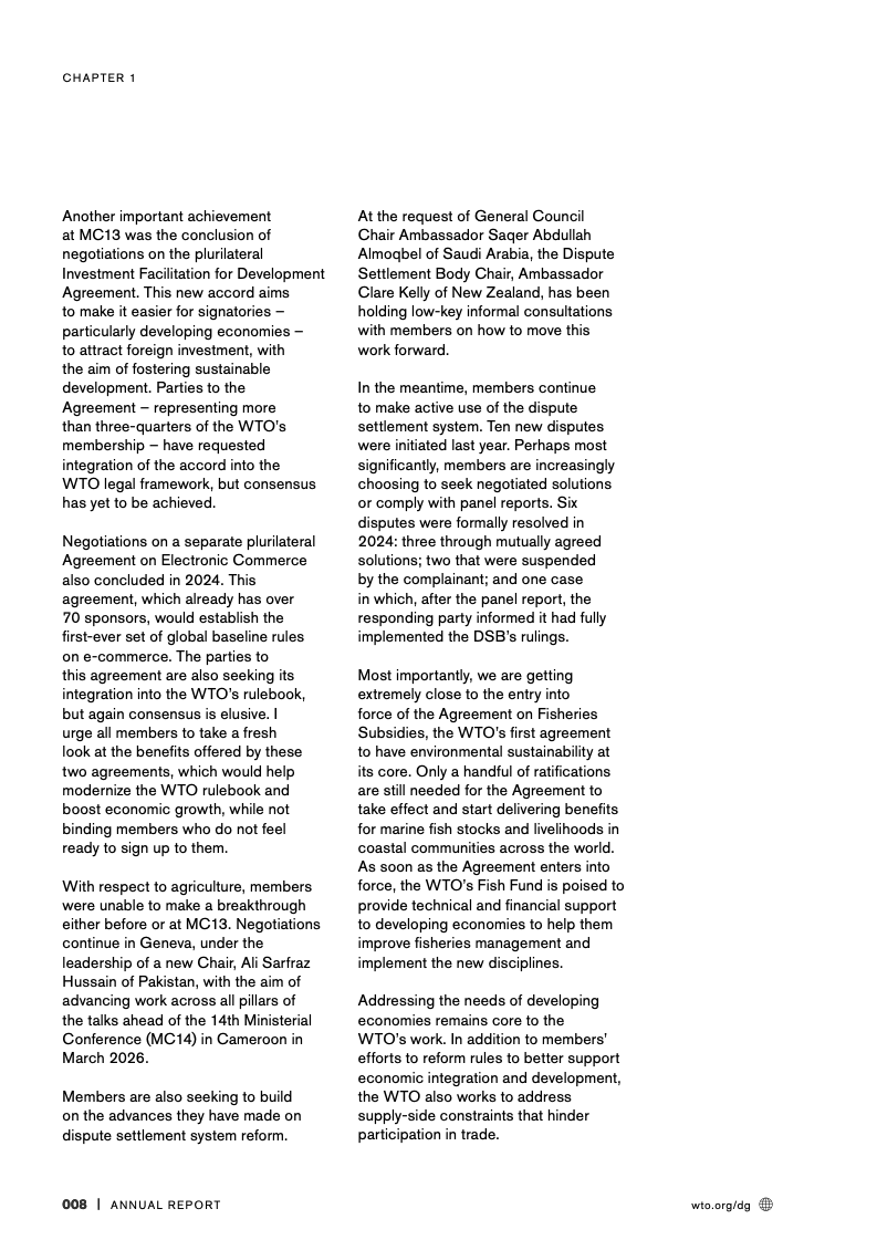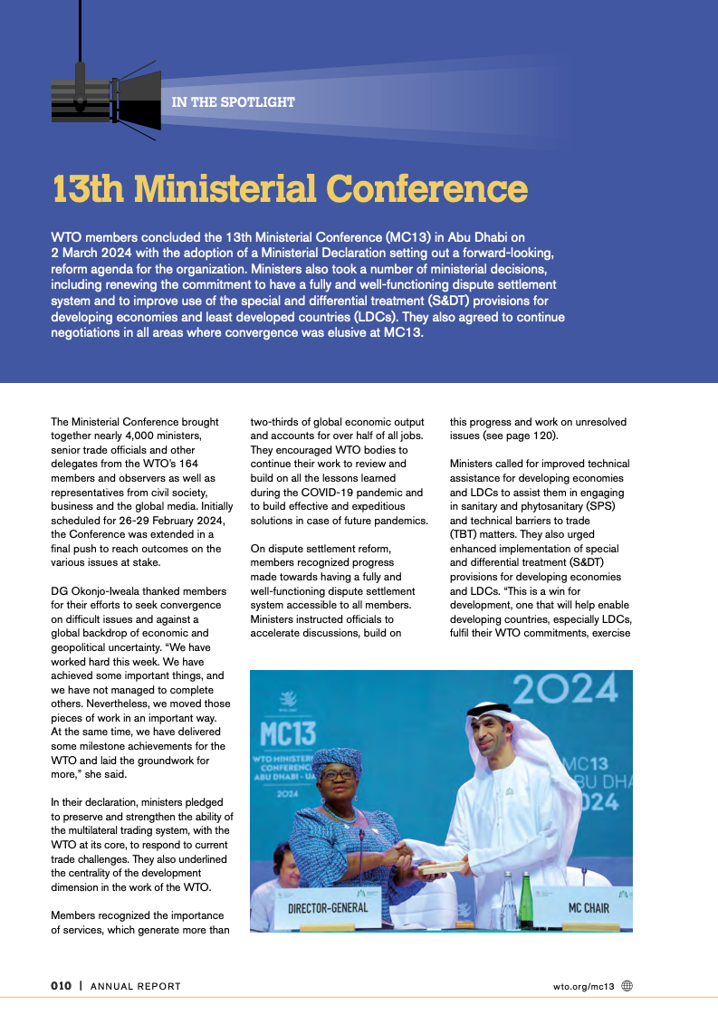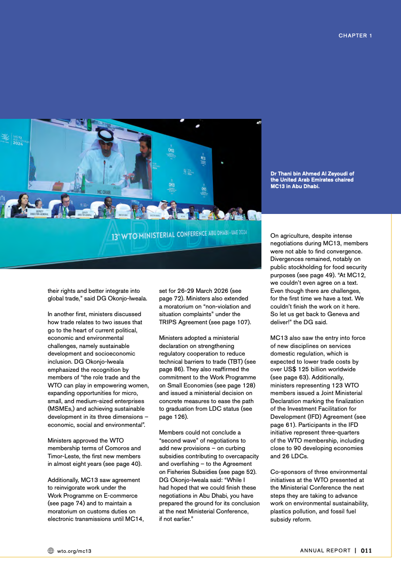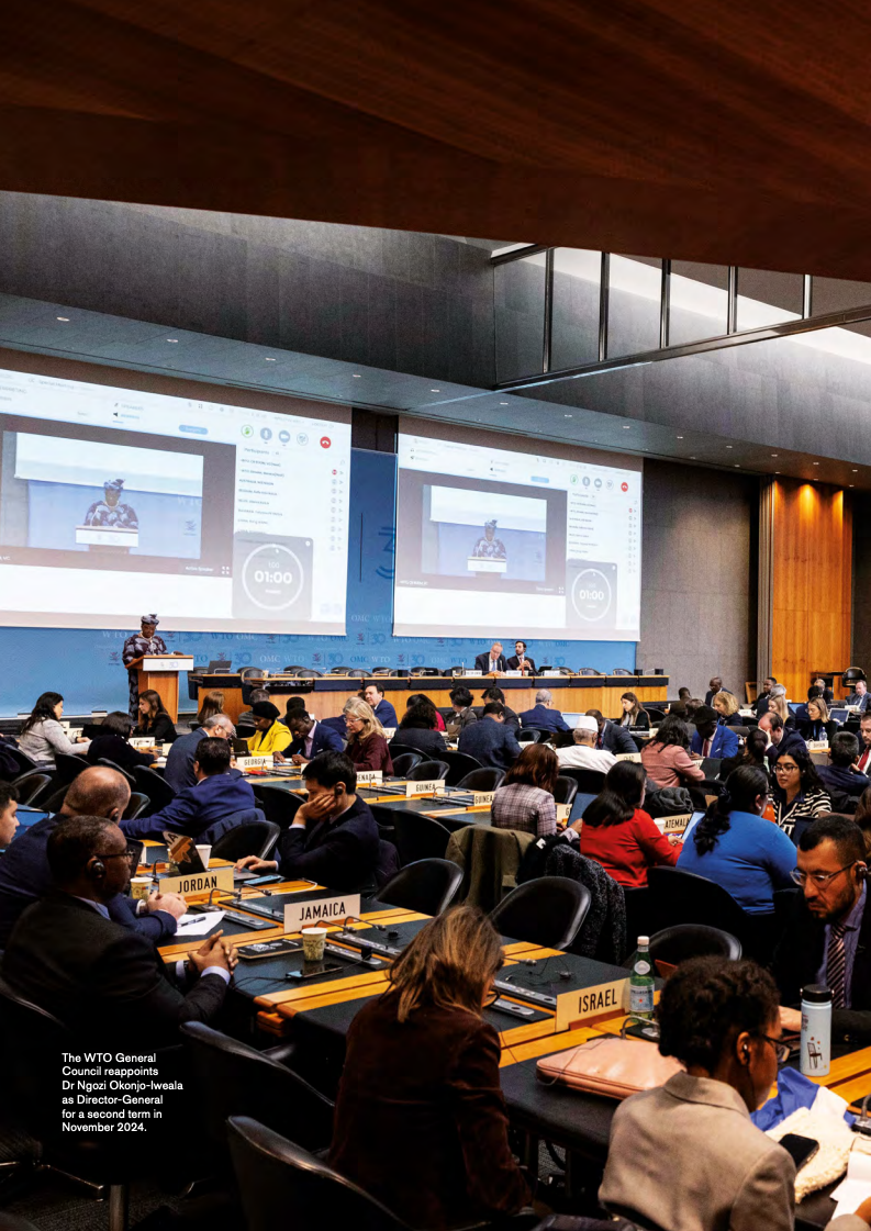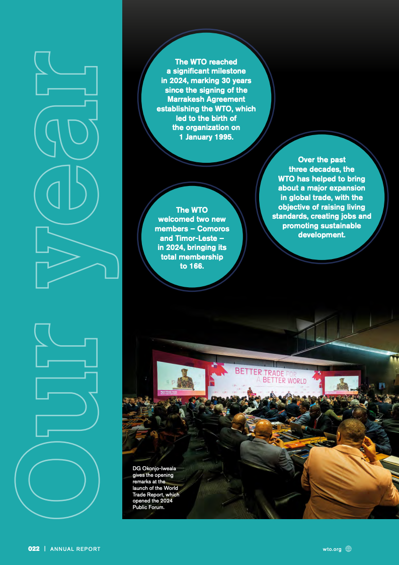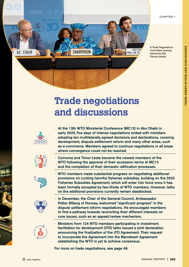 WTO在2024年取得了多项重要进展。科摩罗和东帝汶在2024年加入WTO,使成员总数达到166个,覆盖全球98%的贸易额,这是自2016年以来的首次扩员。第13届部长级会议(MC13)通过了十项多边协议和宣言,涵盖发展、争端解决改革和电子商务等领域。其中,投资便利化促进发展协议(IFD)已获得超过四分之三成员(包括近90个发展中经济体和26个最不发达国家)的支持,成员数量已增至近130个。