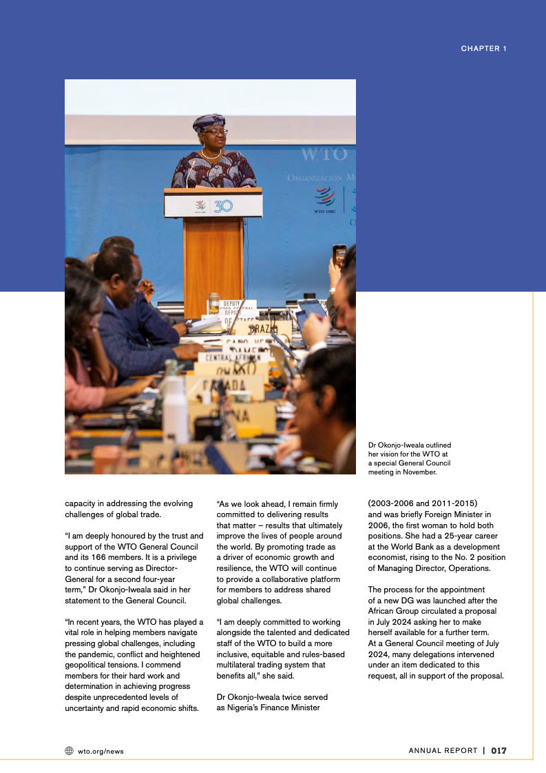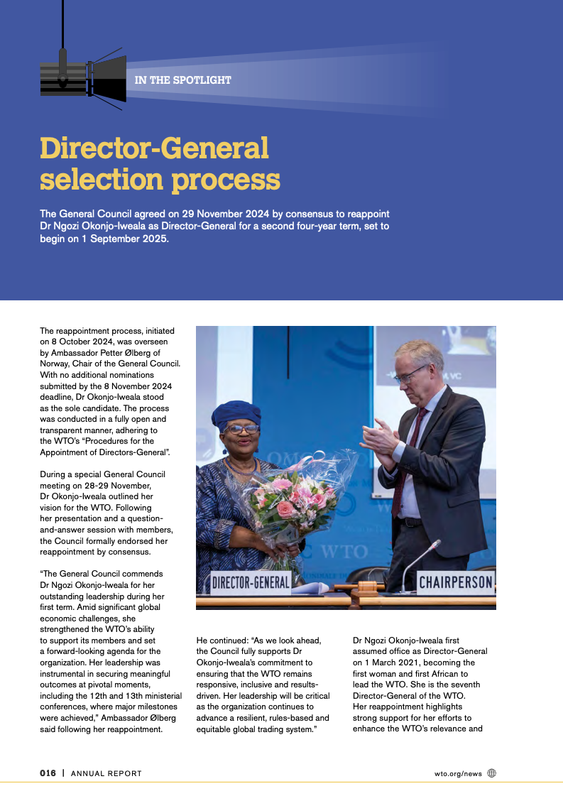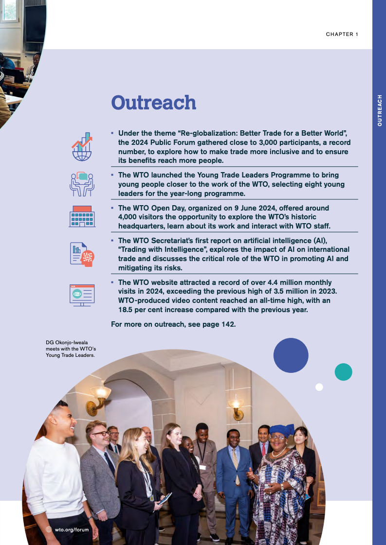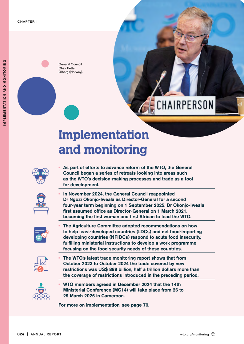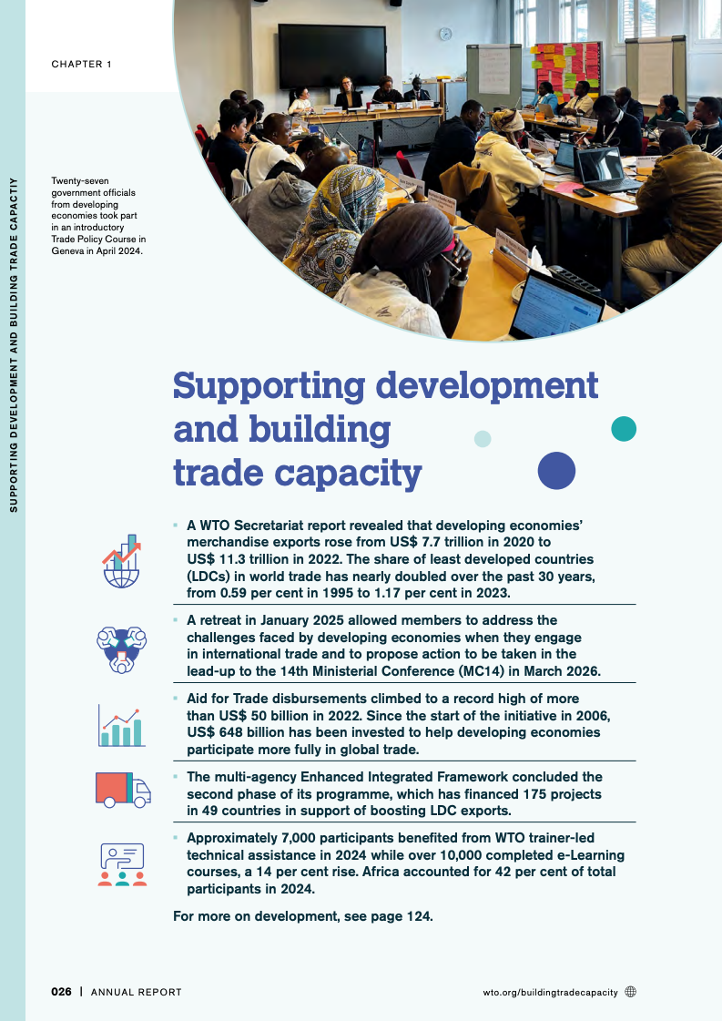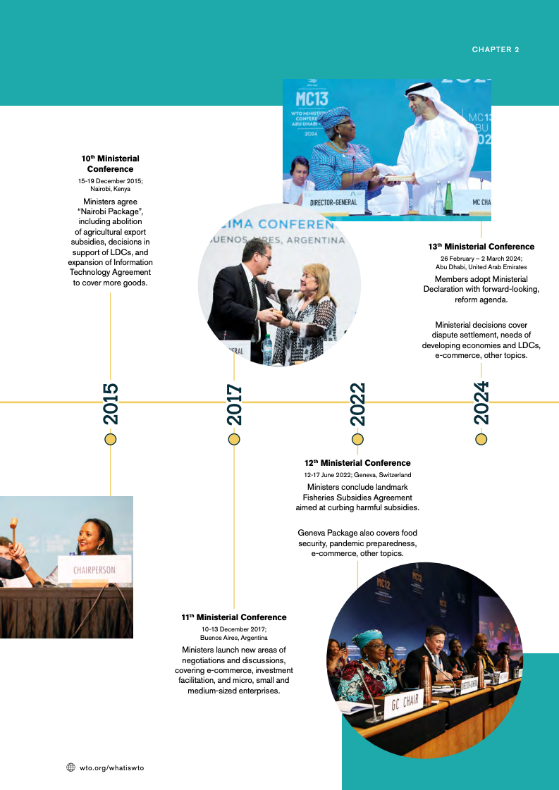 WTO在2024年取得了多项重要进展。科摩罗和东帝汶在2024年加入WTO,使成员总数达到166个,覆盖全球98%的贸易额,这是自2016年以来的首次扩员。第13届部长级会议(MC13)通过了十项多边协议和宣言,涵盖发展、争端解决改革和电子商务等领域。其中,投资便利化促进发展协议(IFD)已获得超过四分之三成员(包括近90个发展中经济体和26个最不发达国家)的支持,成员数量已增至近130个。