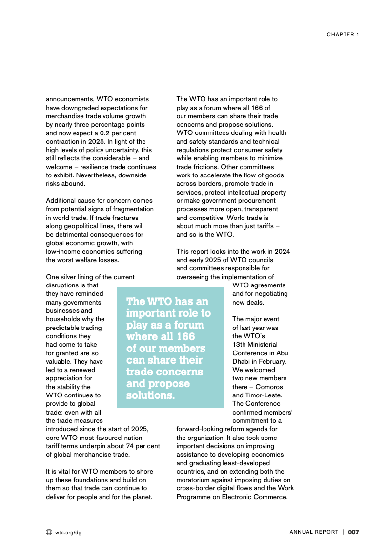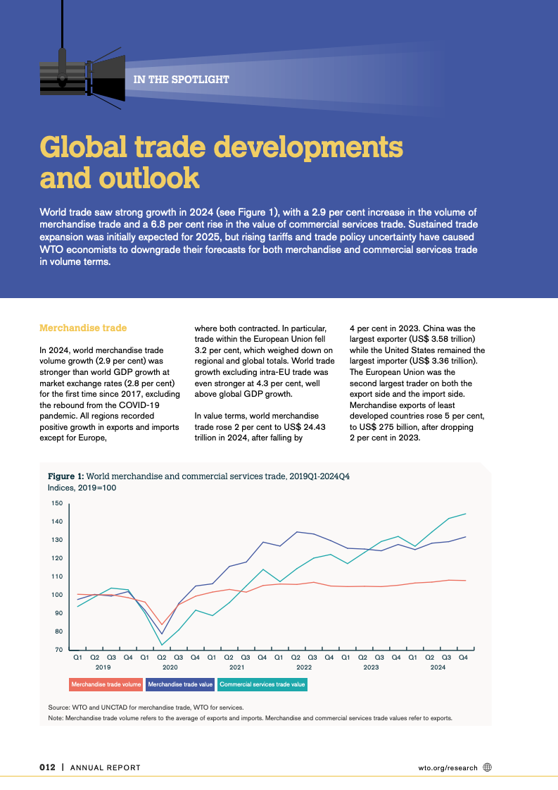 展望未来,全球贸易体系正处于一个关键的十字路口。地缘政治紧张局势和单边贸易保护主义措施,如关税壁垒的增加,正对全球贸易增长构成下行风险。WTO经济学家已将2025年商品贸易量增长预期下调至0.2%的收缩,这预示着全球贸易环境将更加复杂和充满挑战。然而,报告也强调了贸易体系的韧性,以及通过多边合作、技术援助和能力建设来应对挑战的潜力。未来,WTO将继续致力于推动贸易自由化、可预测性和包容性,以应对全球经济碎片化的风险,并确保贸易能够持续为全球人民和地球带来福祉。