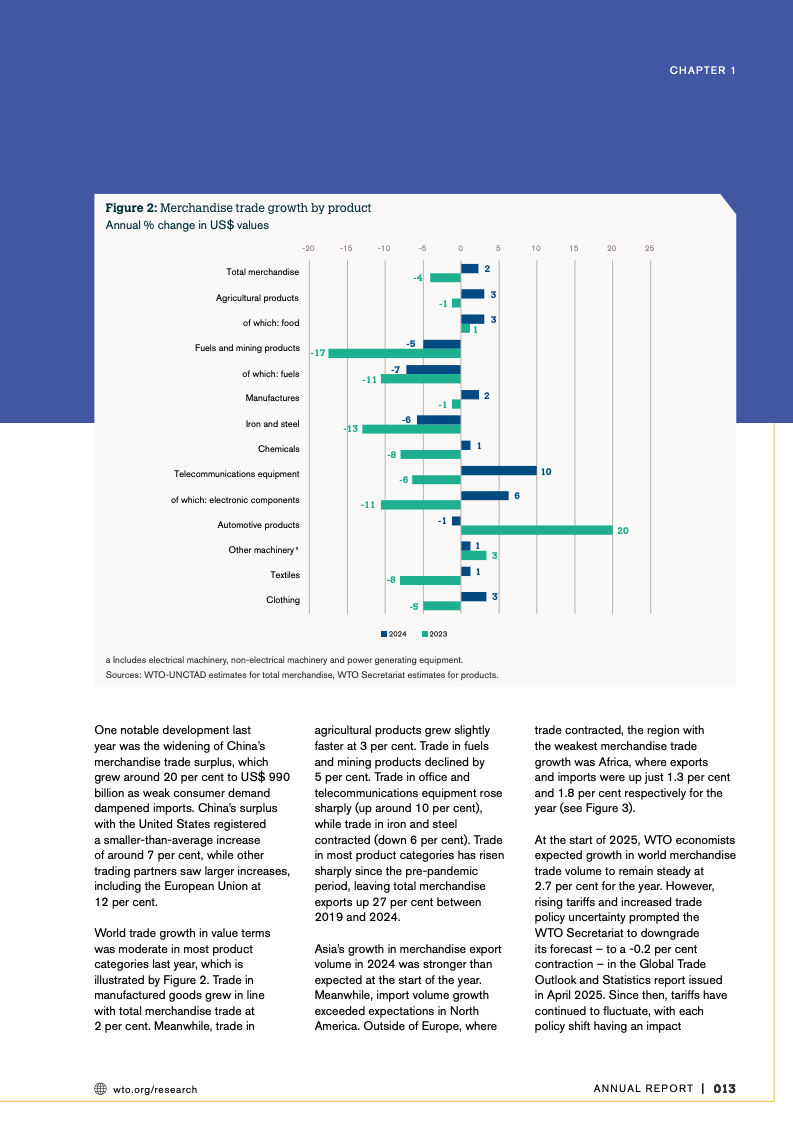 在贸易结构方面,2024年制造业商品贸易增长与整体商品贸易增速持平,均为2%。农产品贸易增速略快,达到3%。燃料和采矿产品贸易则下降5%。值得注意的是,办公和电信设备贸易大幅增长约10%,而钢铁贸易则萎缩6%。自2019年以来,全球商品出口总额已累计增长27%,显示出贸易在疫情后期的强劲复苏。