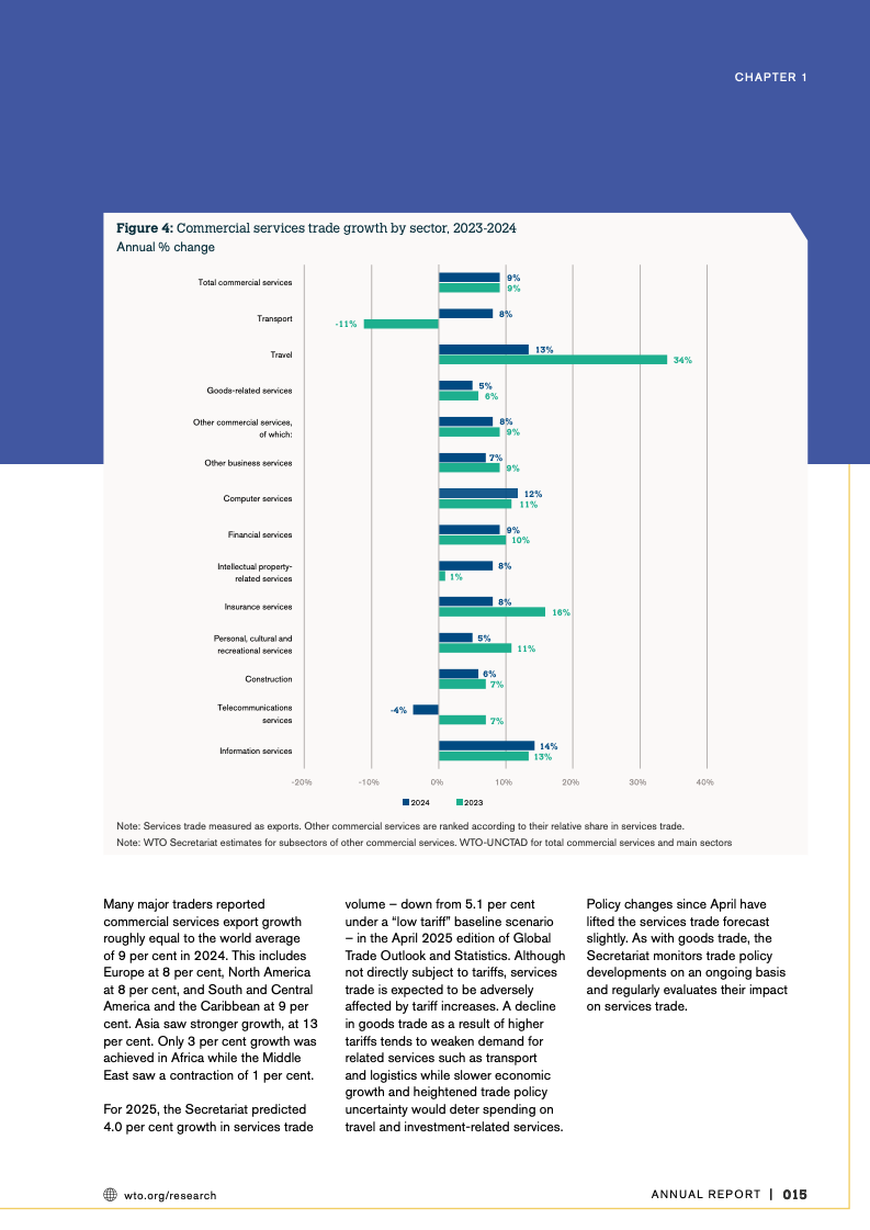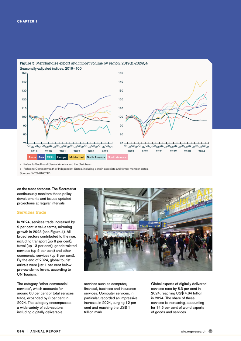 服务贸易表现尤为亮眼,2024年服务贸易额增长9%,与2023年增速持平。所有主要服务部门均实现增长,其中运输业增长8%,旅游业增长13%,商品相关服务增长5%,其他商业服务增长8%。到2024年底,全球旅游业入境人数已恢复至疫情前水平的99%。数字交付服务出口增长8.3%,达到4.64万亿美元,占全球商品和服务出口总额的14.5%,凸显数字经济在贸易中的日益重要性。