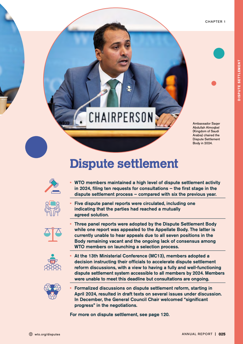 争端解决机制在2024年保持活跃,共启动了10起新的磋商请求,高于2023年的6起。同时,有6起争端在2024年正式解决,其中3起通过双方同意的解决方案,2起由申诉方中止,1起在专家组报告后被应诉方完全执行裁决。然而,由于上诉机构所有七个职位空缺,导致上诉程序停滞。