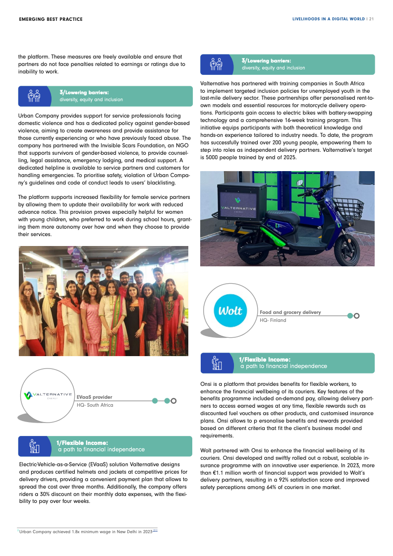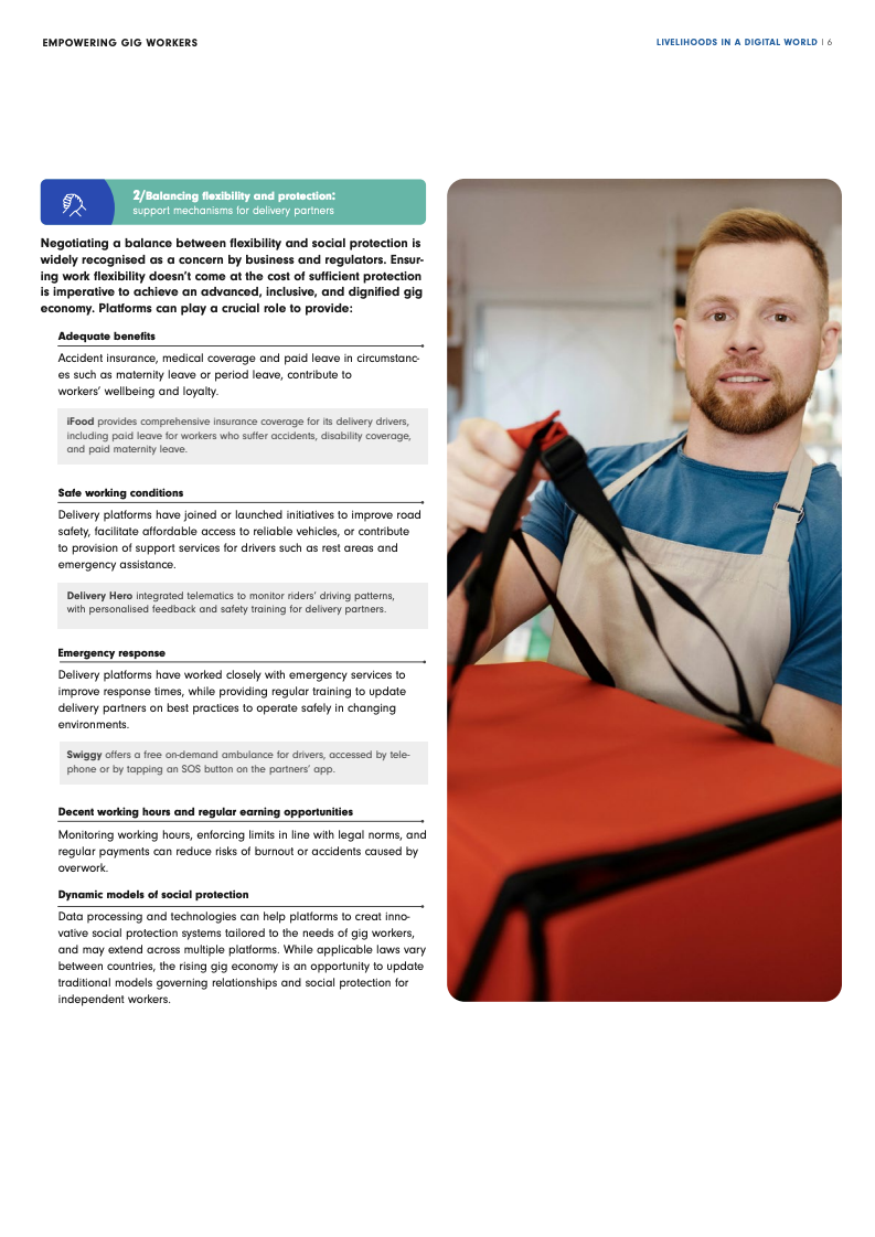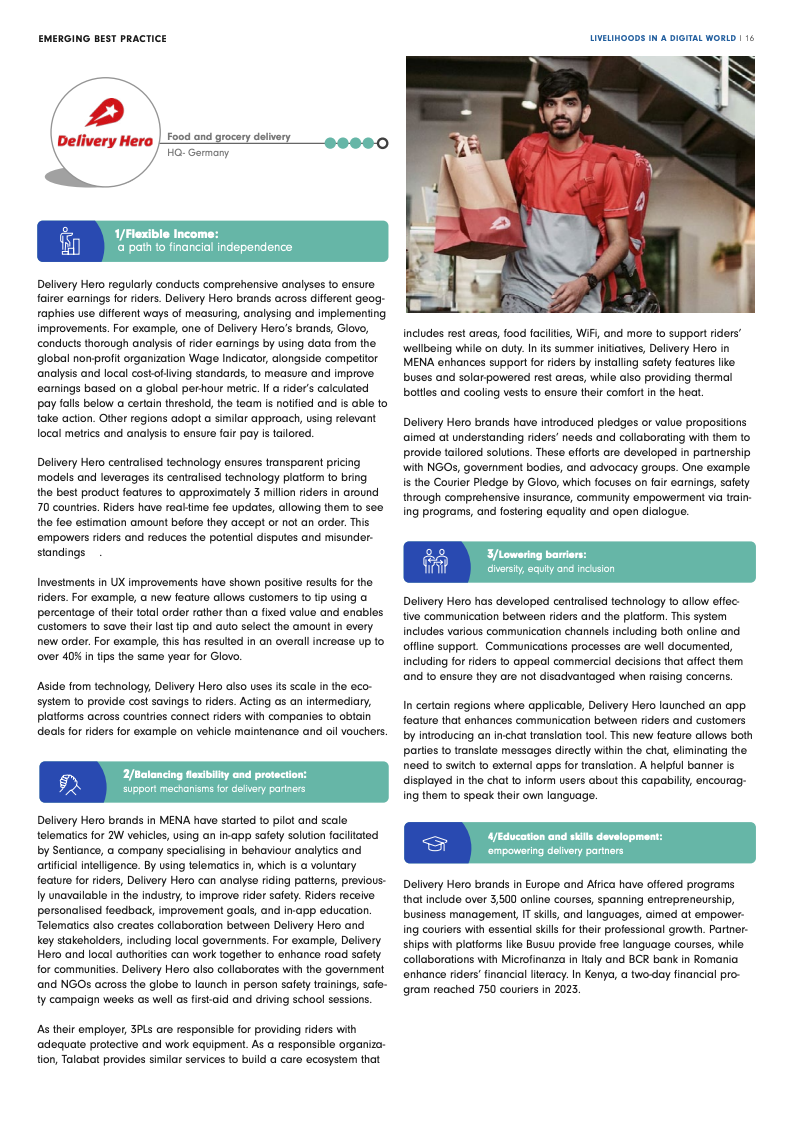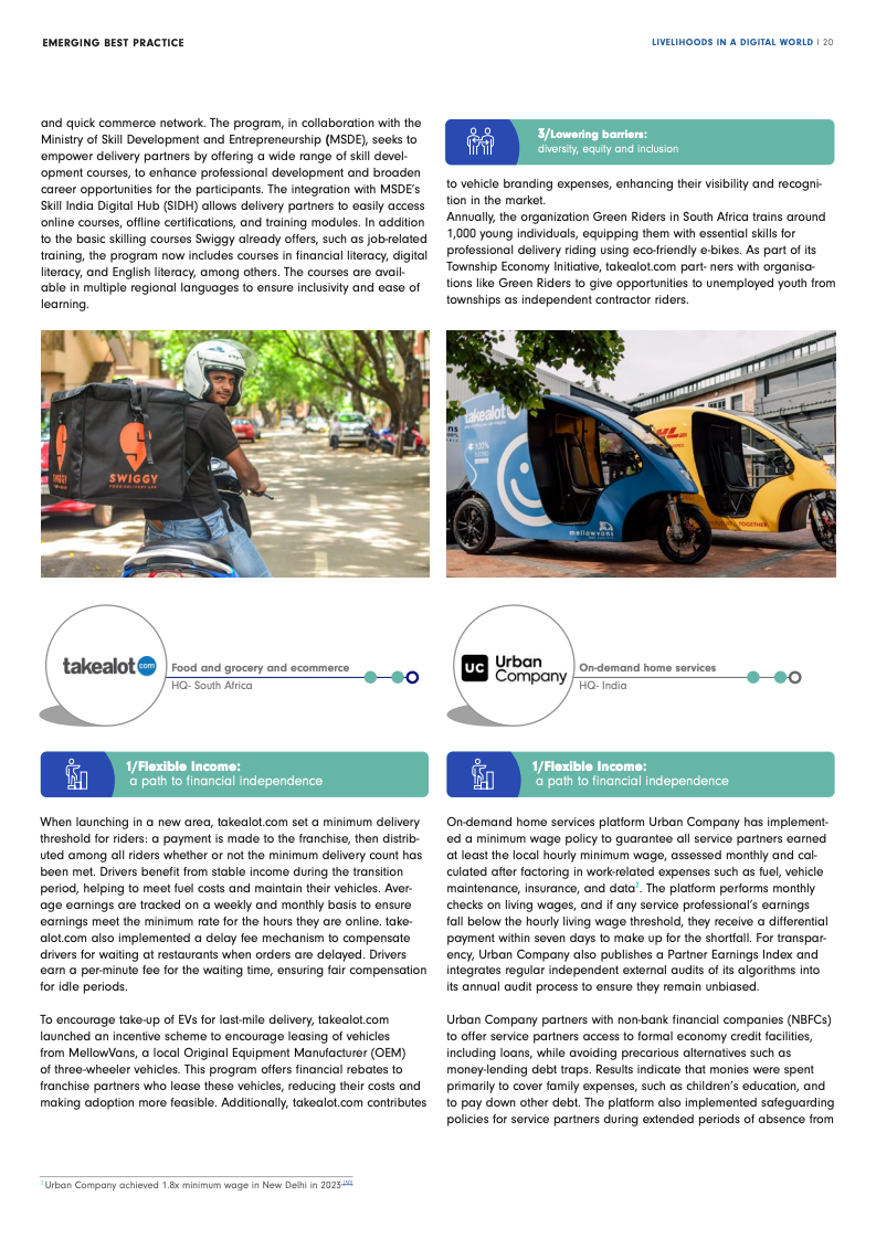 灵活性与保障之间的平衡,是零工经济的核心议题。平台企业正从单纯的技术中介,转向更积极的生态建设者。例如,印度Urban Company推行了保障最低时薪的政策,而Swiggy则提供多语言合同以提升透明度。此外,提供保险、技能培训(如Delivery Hero的在线课程)和职业发展路径,正成为平台留住劳动力的关键差异化策略。