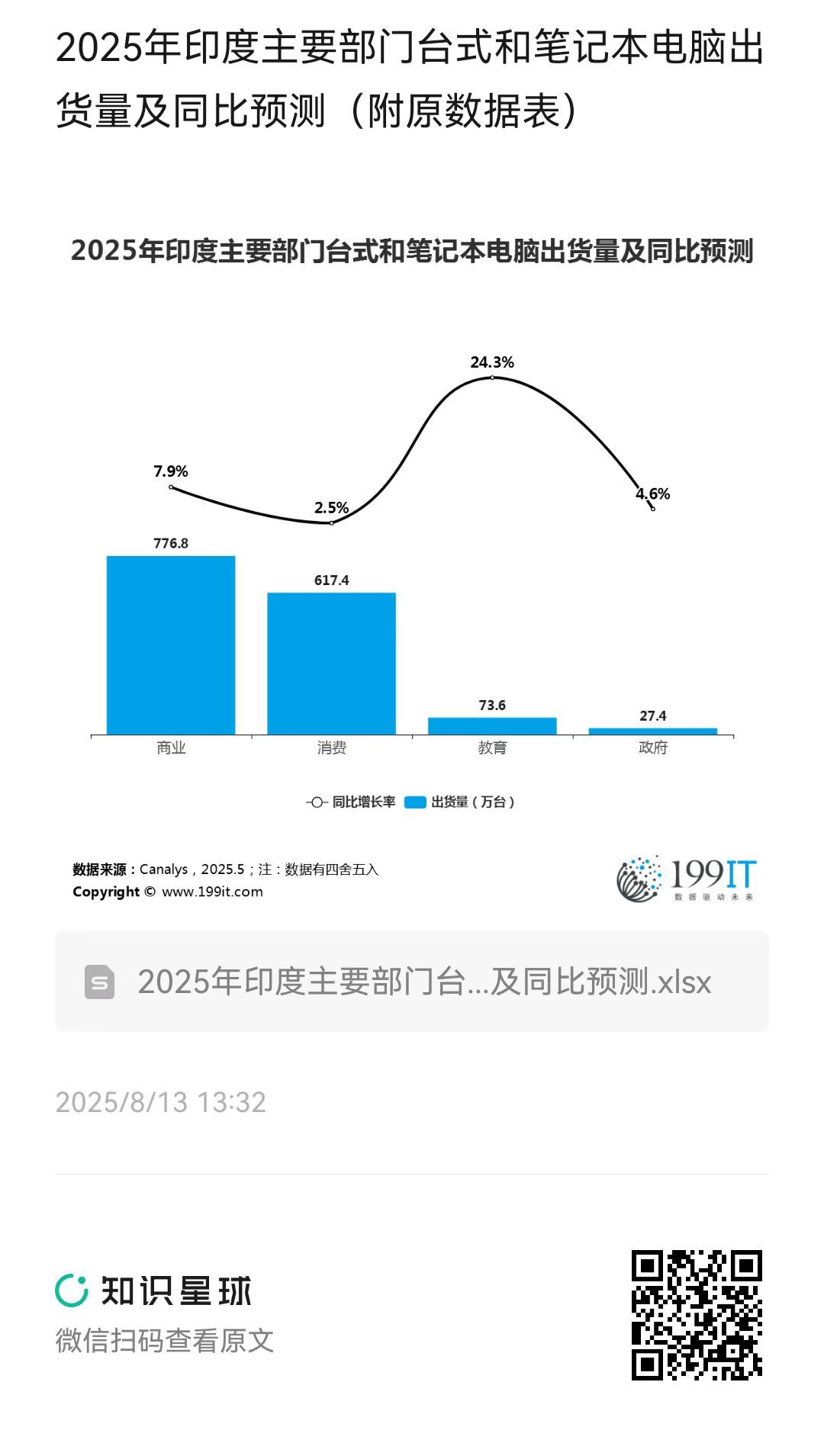 2025年印度主要部门台式和笔记本电脑出货量及同比预测(附原数据表) ​​​