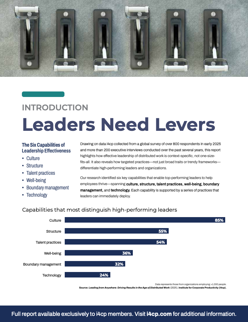 深入分析发现,卓越领导力的关键分野并非技术工具,而是组织的核心要素。数据显示,在区分高绩效领导者的六大能力中,“文化”以85%的压倒性优势位居榜首,远超“结构”(55%)和“人才实践”(54%)。与之形成鲜明对比的是,“技术”能力的重要性仅为24%。这表明,过度依赖技术解决方案而忽视组织文化与结构性支持,是导致领导力失效的核心症结。