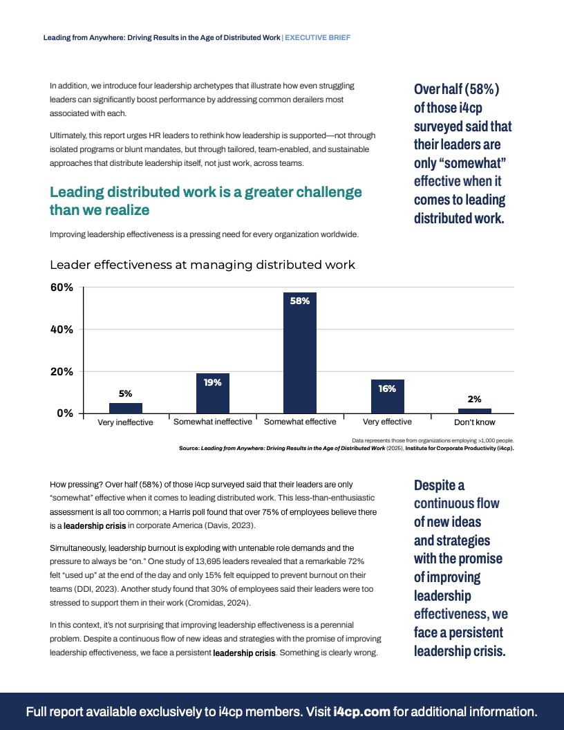在分布式工作成为新常态的背景下,全球领导力正面临一场深刻的效能危机。一项覆盖逾800名受访者的全球调研数据显示,高达58%的领导者在管理分布式团队方面仅被评为“一般有效”,而认为其“非常有效”的比例仅为16%。这一数据揭示了一个普遍存在的管理困境,即多数企业尚未找到驾驭新型工作模式的有效领导力密码。