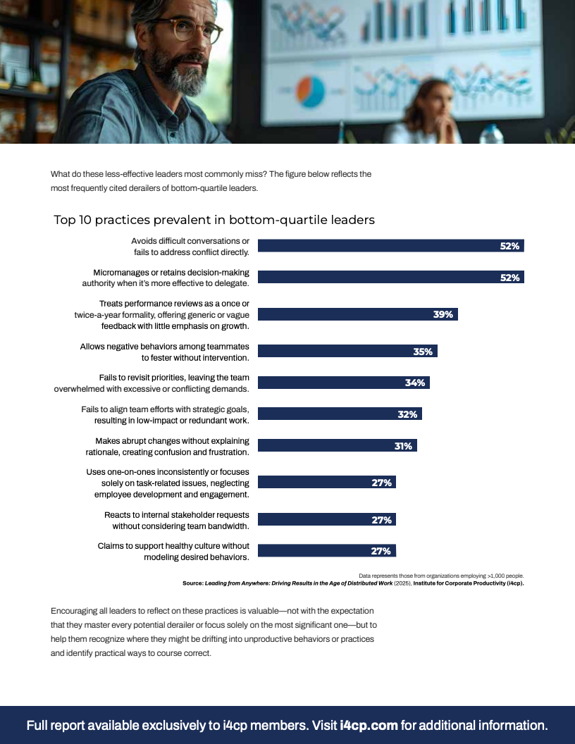 表现欠佳的领导者往往陷入相似的行为误区。数据显示,底层四分位的领导者中最普遍的两大问题是“回避棘手对话或冲突”(52%)以及“过度集权或微观管理”(52%)。此外,“将绩效评估流于形式”(39%)和“放任团队中的负面行为”(35%)等问题也极为突出。这些行为直接侵蚀了团队的信任基础、自主性与战略执行力,造成了巨大的无形绩效损失。