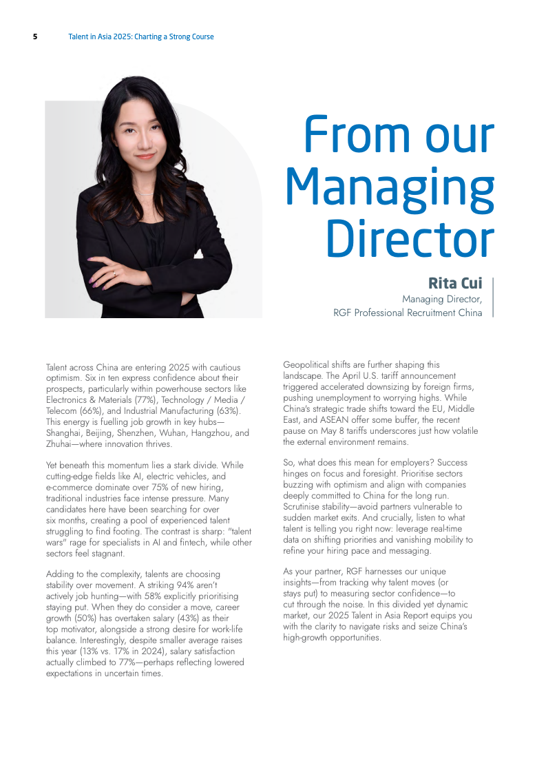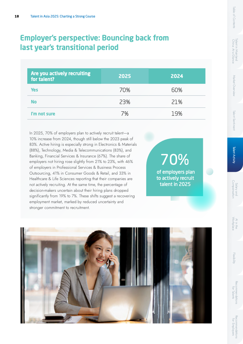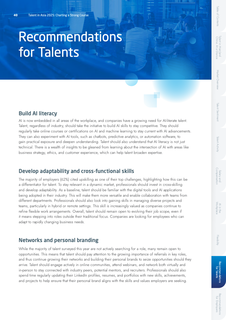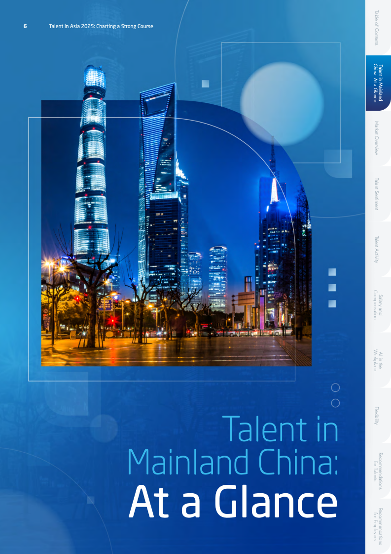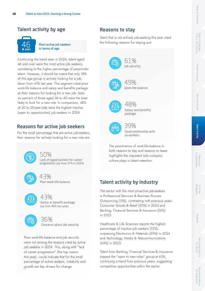 人才流动性显著降低,凸显出市场避险情绪的升温。主动求职者比例从2024年的21%骤降至6%,而58%的在职人员明确表示倾向于留任,该比例高于2024年的44%。在跳槽动机方面,职业发展(50%)已取代薪酬(43%),成为驱动人才流动的首要因素。