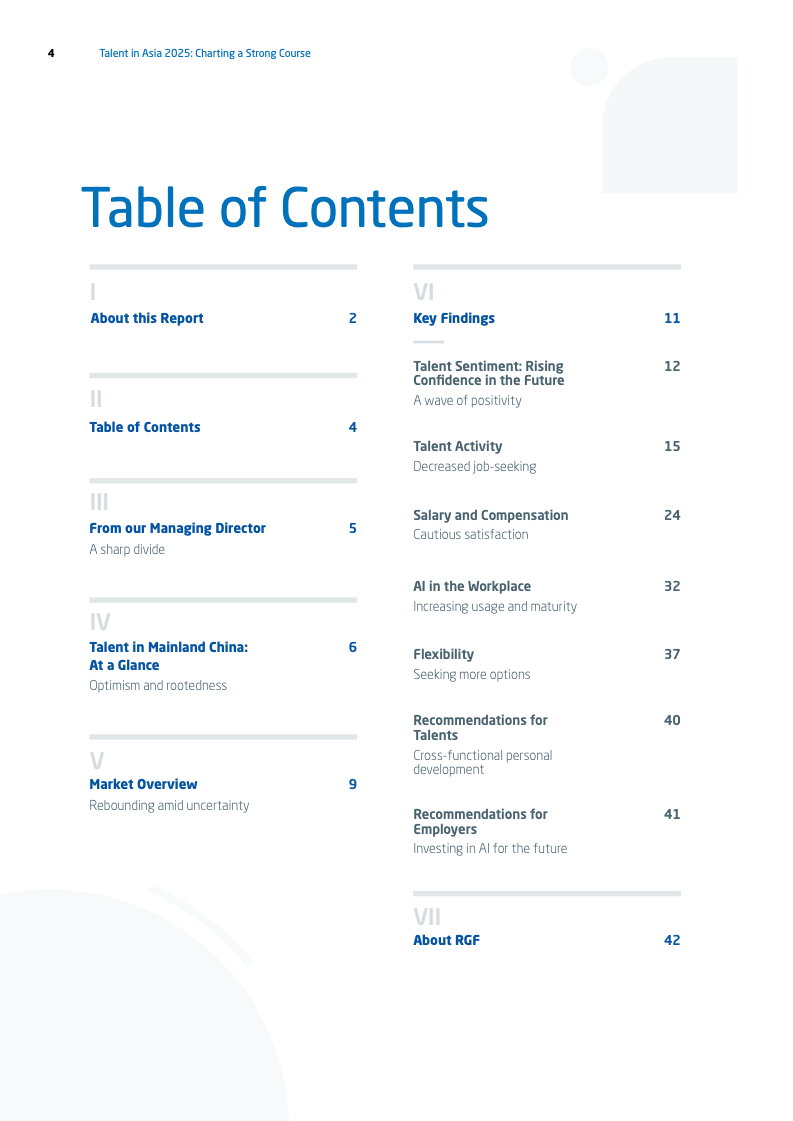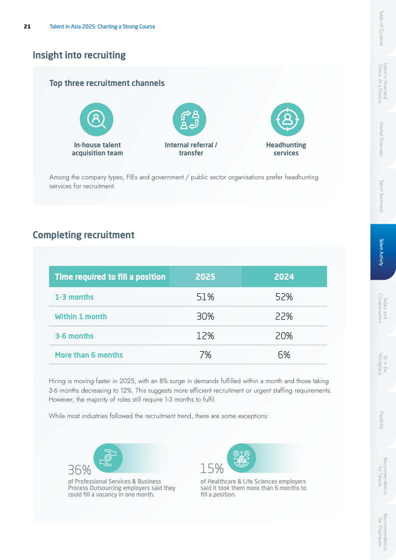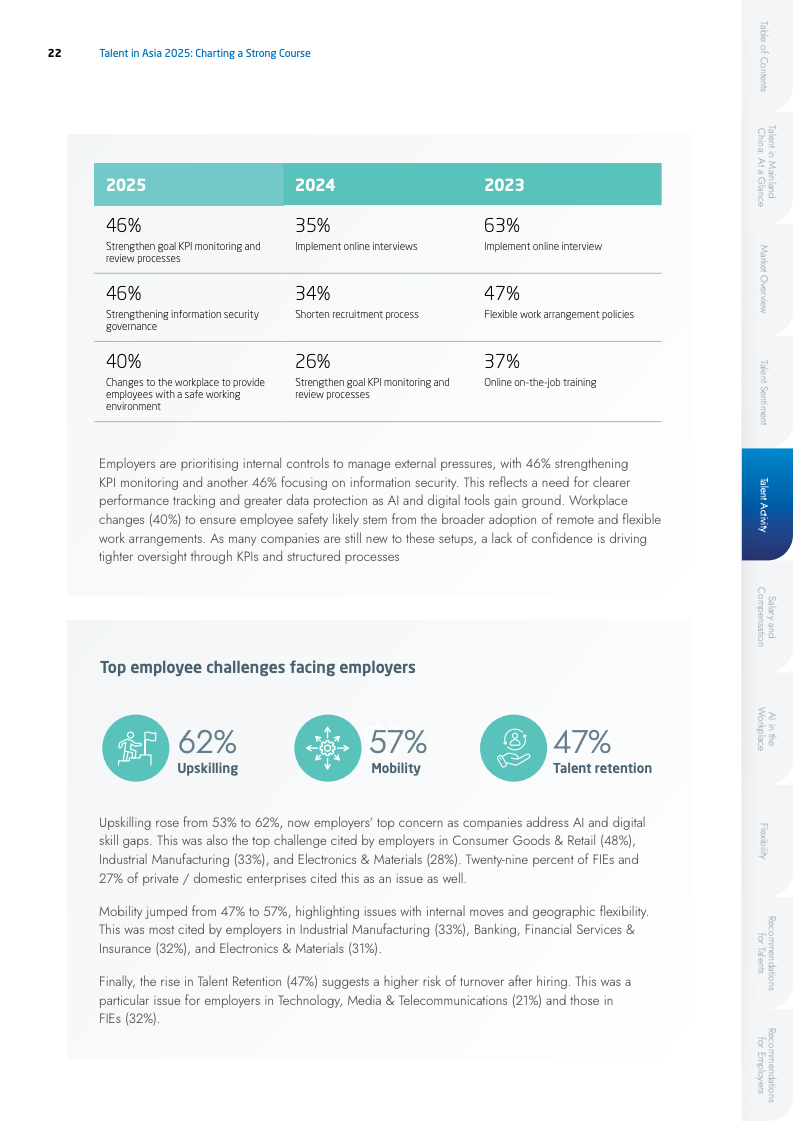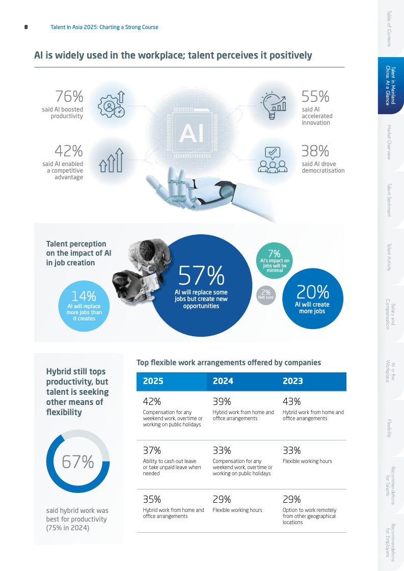 人才流动性显著降低,凸显出市场避险情绪的升温。主动求职者比例从2024年的21%骤降至6%,而58%的在职人员明确表示倾向于留任,该比例高于2024年的44%。在跳槽动机方面,职业发展(50%)已取代薪酬(43%),成为驱动人才流动的首要因素。