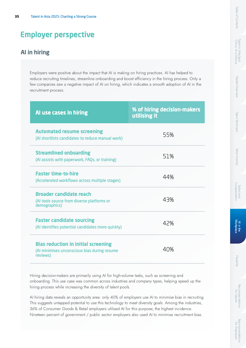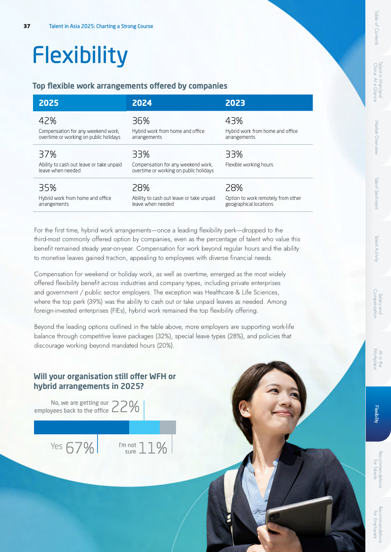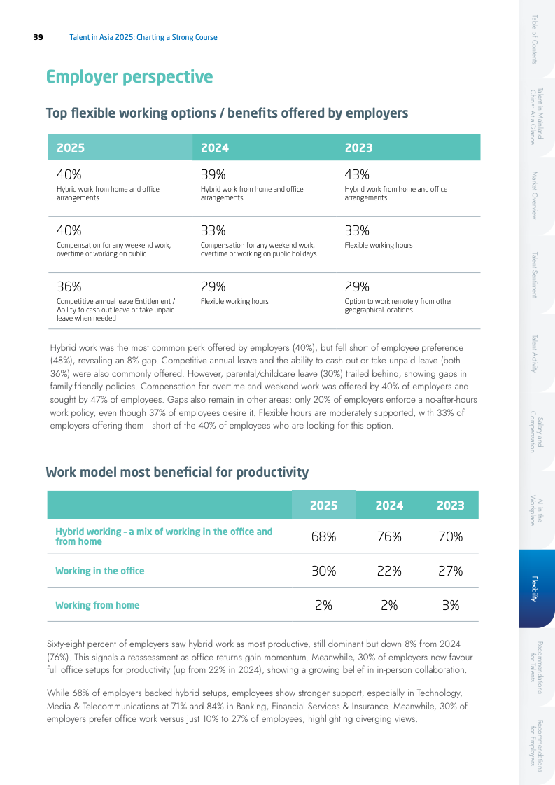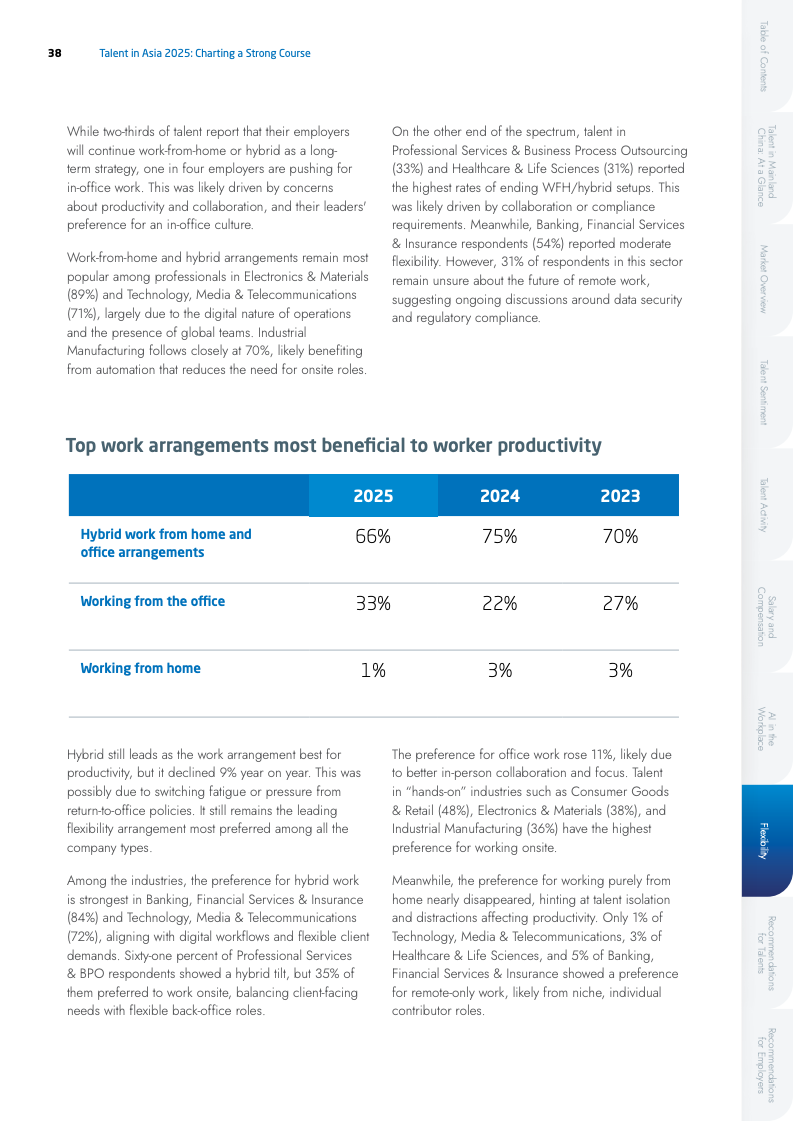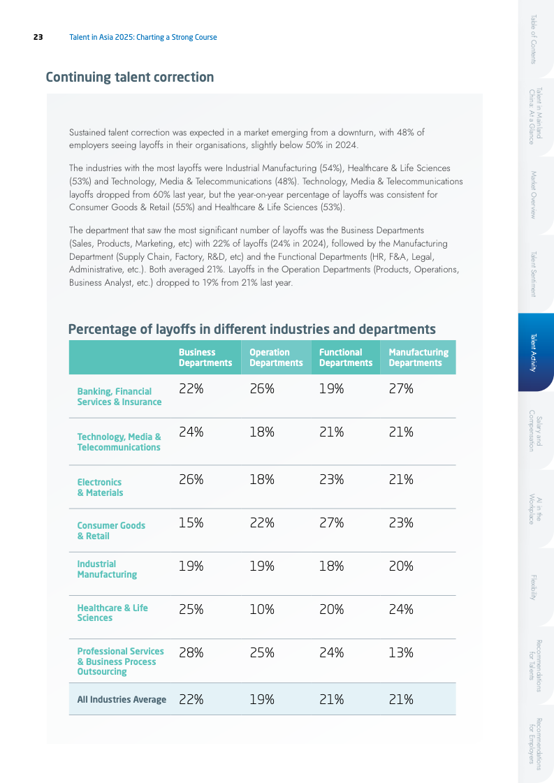人才流动性显著降低,凸显出市场避险情绪的升温。主动求职者比例从2024年的21%骤降至6%,而58%的在职人员明确表示倾向于留任,该比例高于2024年的44%。在跳槽动机方面,职业发展(50%)已取代薪酬(43%),成为驱动人才流动的首要因素。