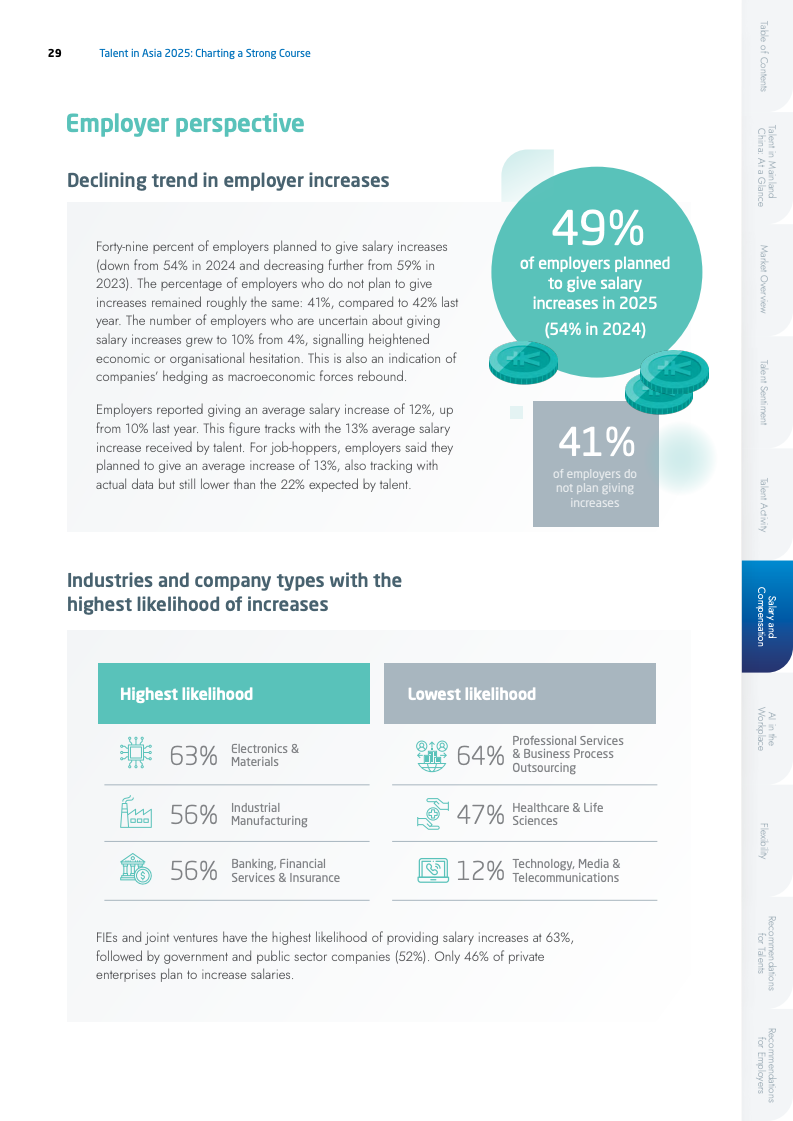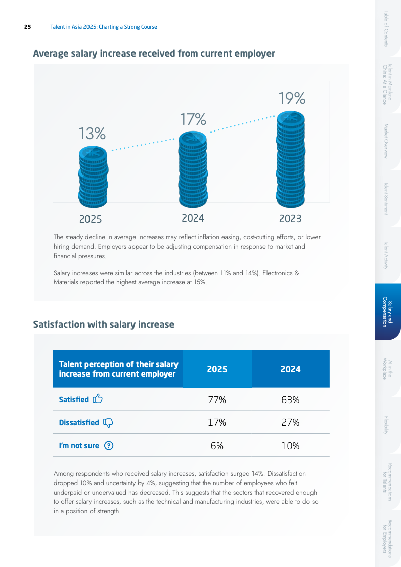 薪酬市场呈现出增长放缓但满意度提升的矛盾现象。2025年平均加薪幅度由17%降至13%,但薪酬满意度却逆势上升至77%。这反映出在不确定的经济环境下,人才的薪酬期望趋于理性。行业间薪资增幅差异拉大,电子行业以15%领跑,而专业服务业仅为7%。