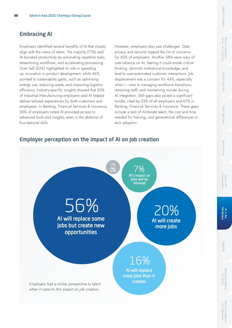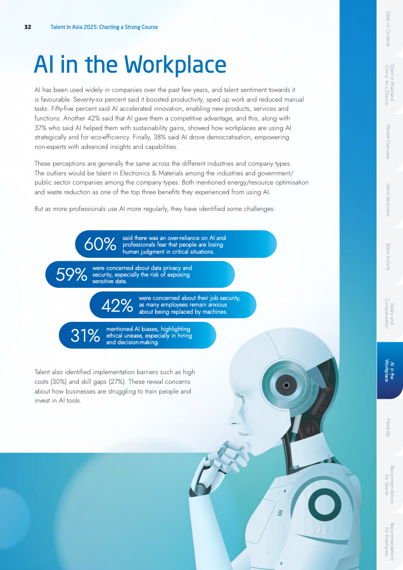 人工智能技术在工作场所的整合已成为常态,其影响利弊共存。76%的受访者认可AI提升了生产力,55%认为其加速了创新。但与此同时,对AI的过度依赖(60%)、数据隐私与安全(59%)以及对岗位安全的担忧(42%)成为员工普遍面临的核心挑战。