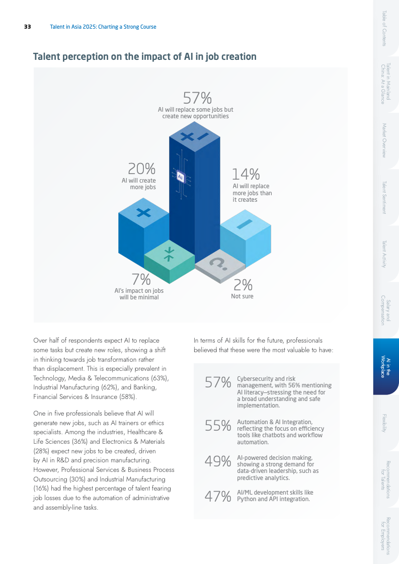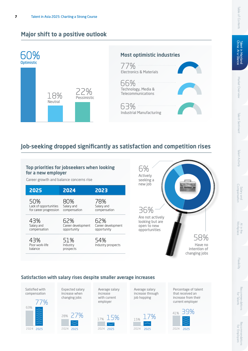 2025年中国大陆人才市场呈现谨慎乐观态势,60%的受访者对职业前景表示乐观,尤其在电子与材料(77%)及科技行业(66%)信心更足。然而市场分化显著,人工智能、电动汽车等新兴领域占据超过75%的新增招聘需求,传统行业则面临人才冗余与岗位缩减的双重压力。
