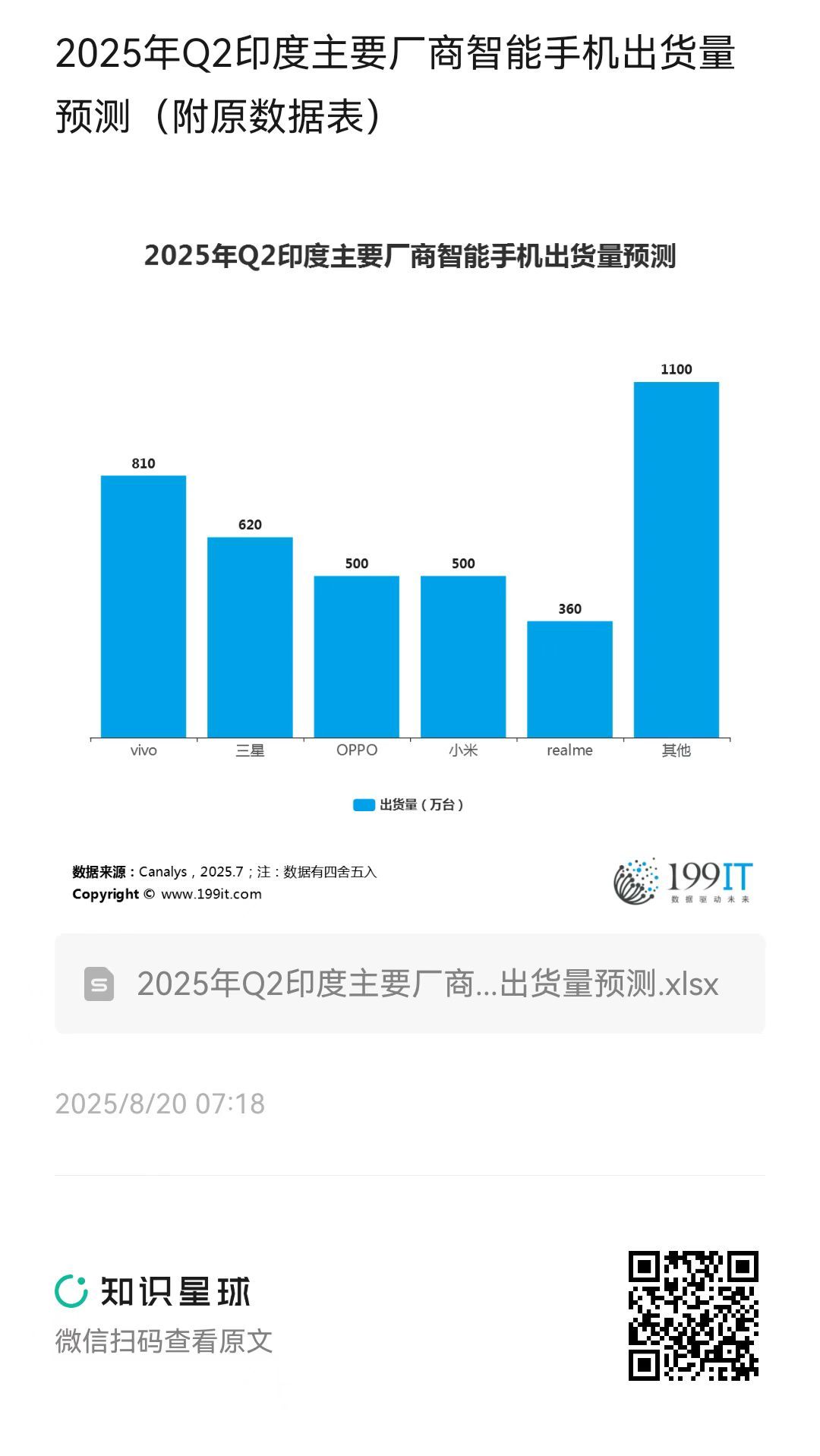 2025年Q2印度主要厂商智能手机出货量预测(附原数据表) ​​​