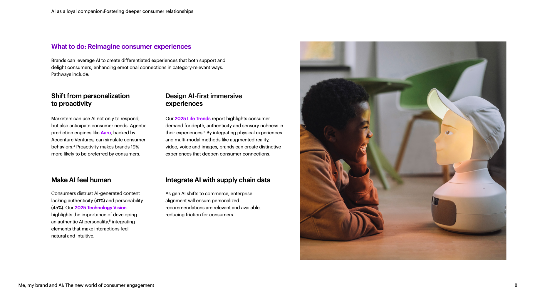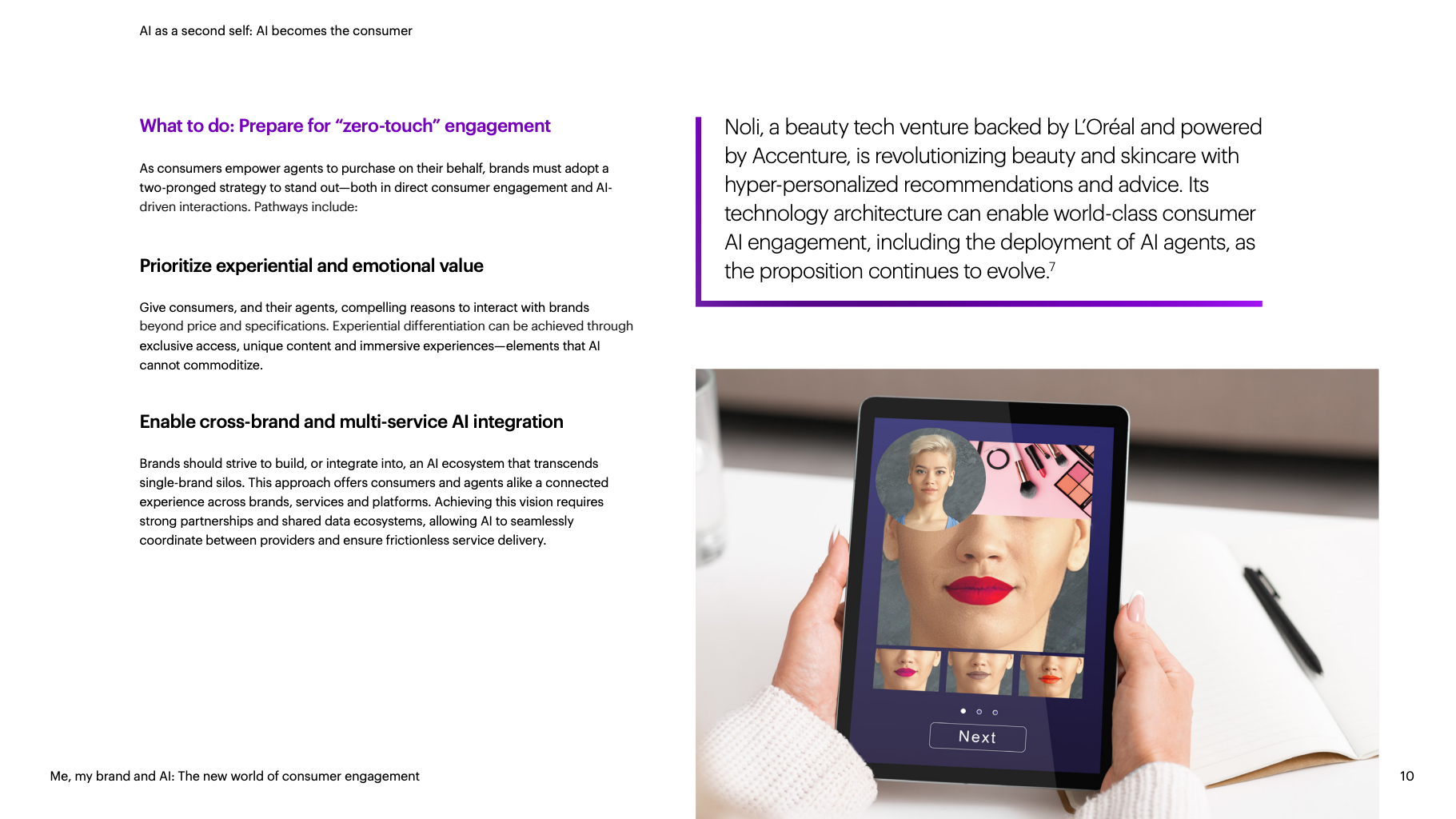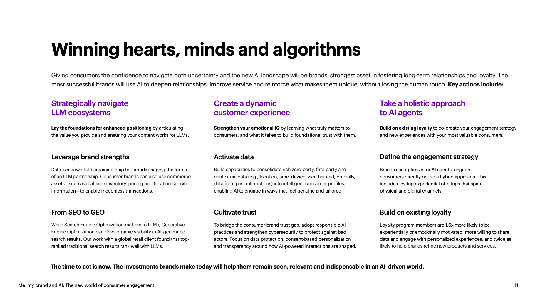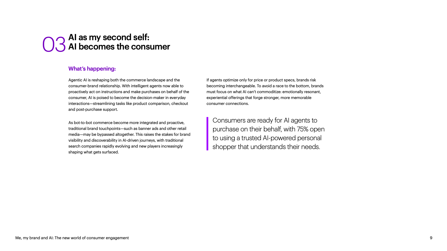 未来的关键趋势在于代理式AI的兴起,它将代表消费者自主执行任务。这将推动商业模式从“影响决策”向“服务算法”的范式转移。品牌竞争的核心将不再是争夺消费者的注意力,而是确保自身的产品与服务能够被消费者的AI代理优先选择与集成。