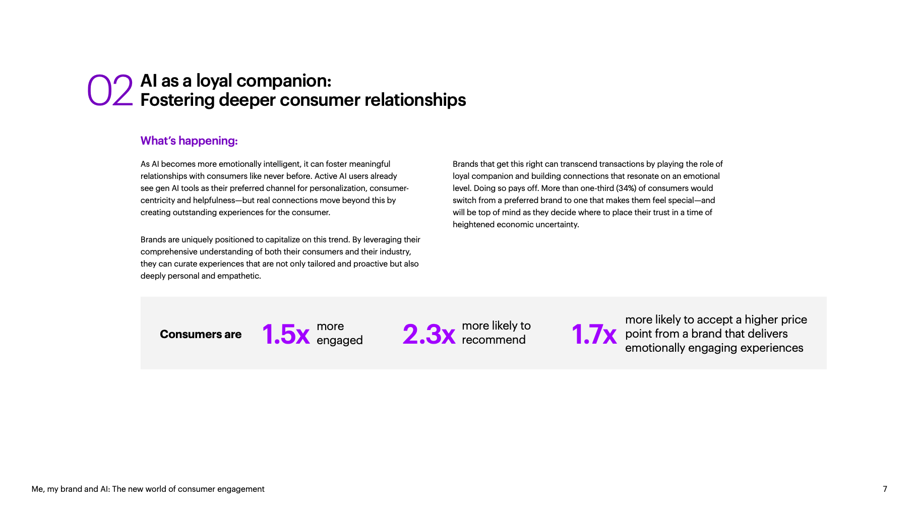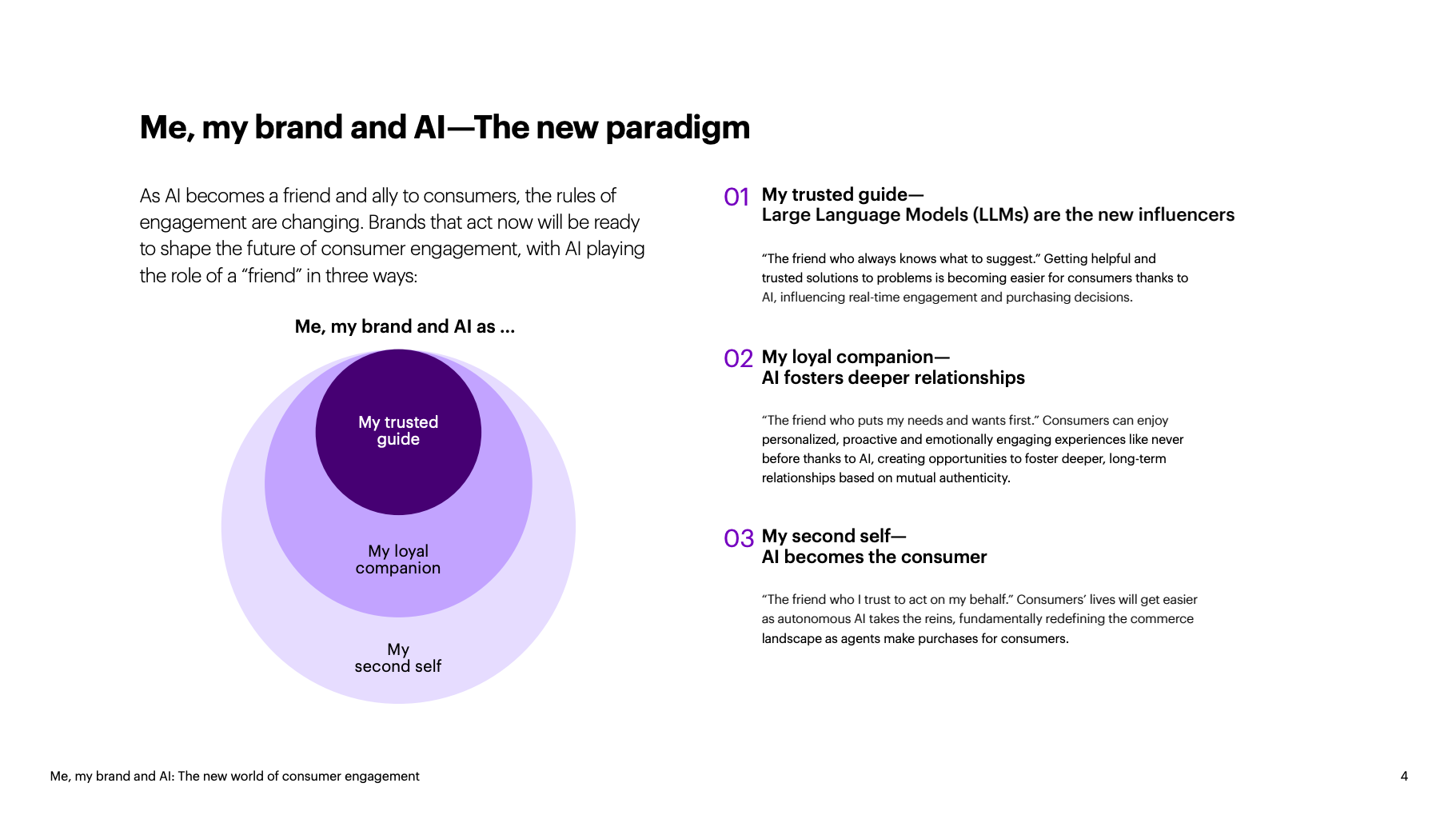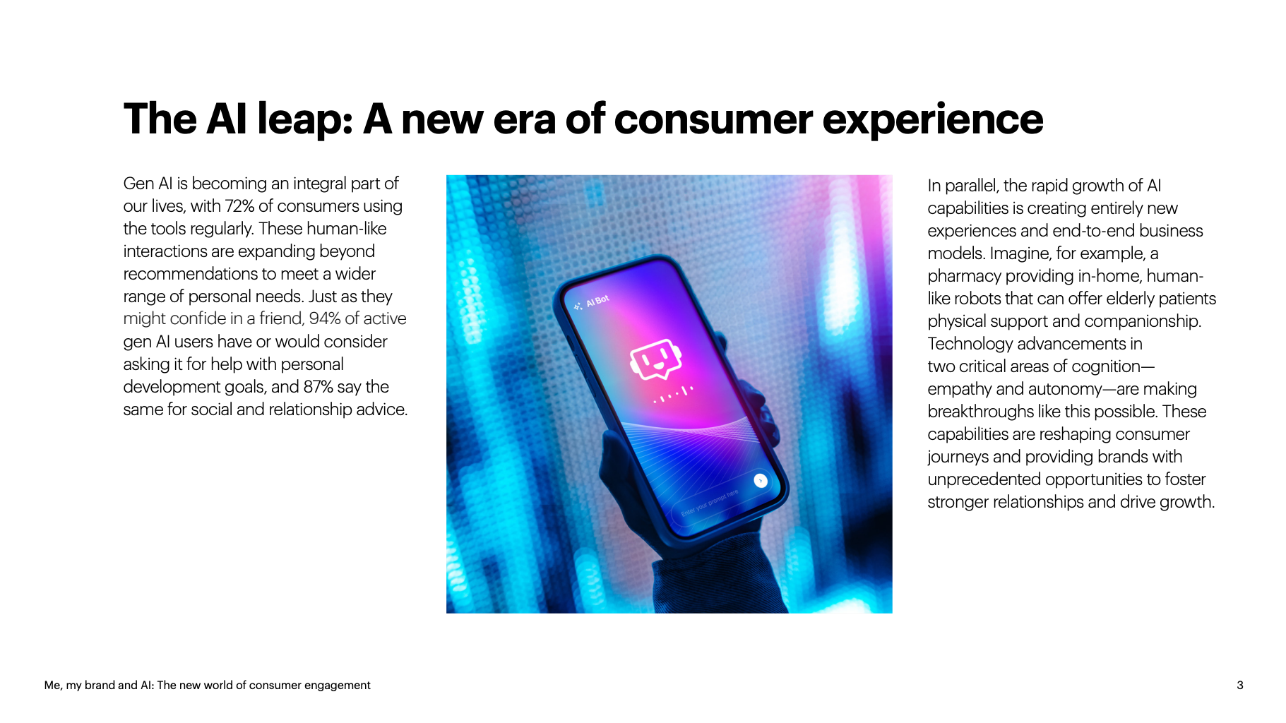 AI的角色已超越工具范畴,向情感伴侣演进。36%的活跃用户将其视为“好朋友”,更有94%的用户愿向其咨询个人发展建议。这种深层信任关系意味着,品牌若无法提供同等的情感共鸣,将面临用户流失风险,已有34%的消费者因此转换品牌。