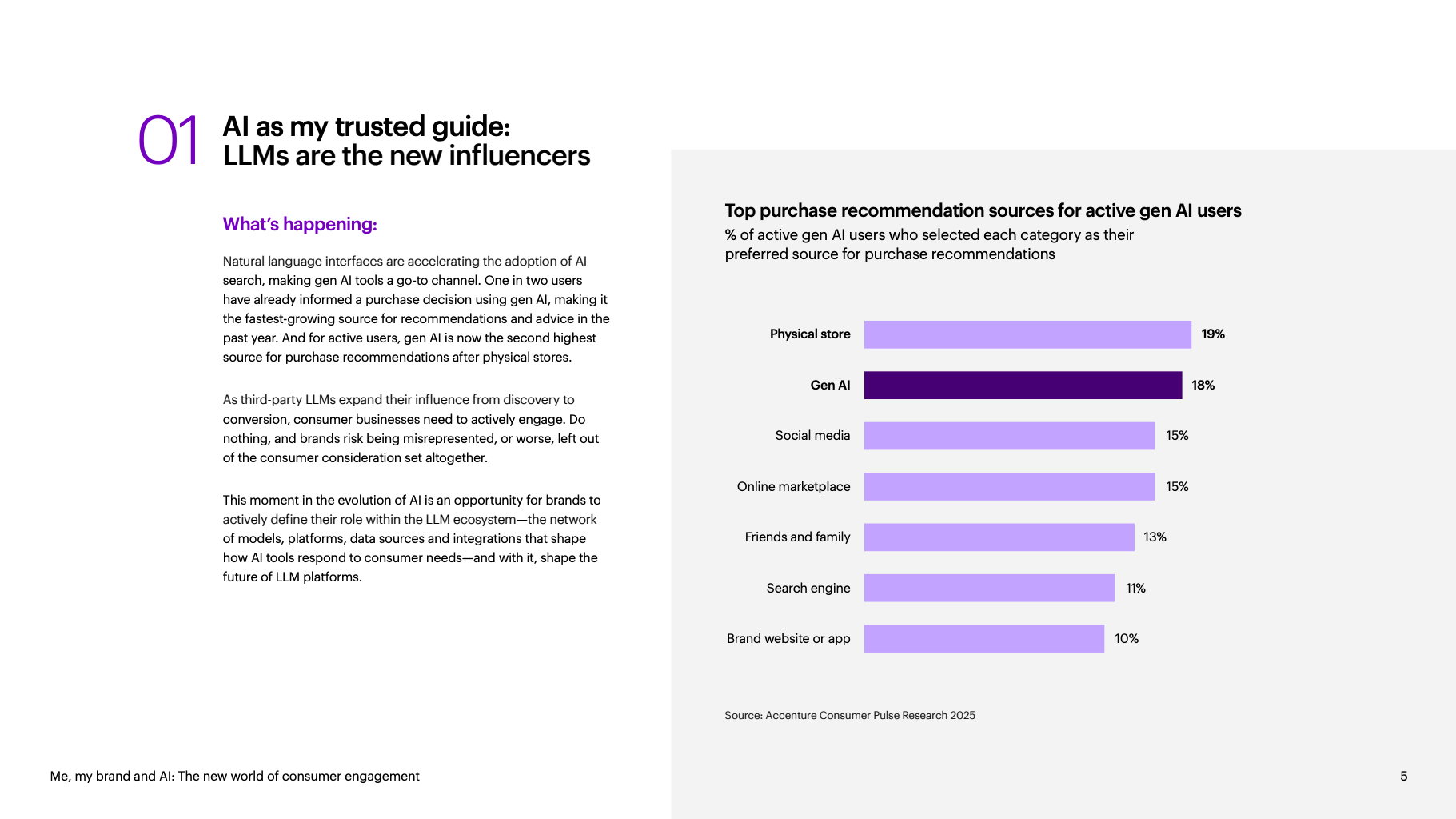 AI在消费决策中的影响力正被量化。已有近半数用户借助生成式AI进行购买决策,使其成为过去一年中增长最快的产品推荐来源。更有近十分之一的消费者视其为最可信赖的建议来源,这对传统营销渠道构成了直接挑战。