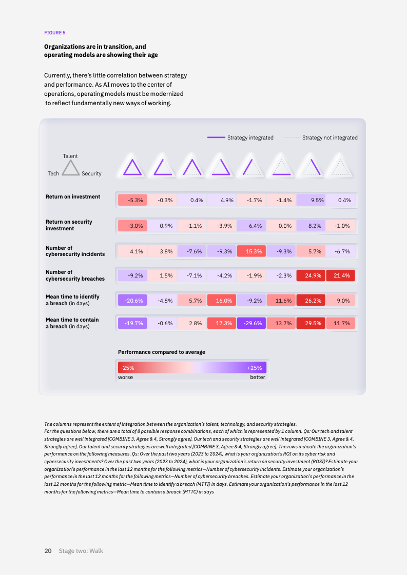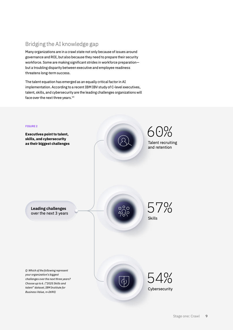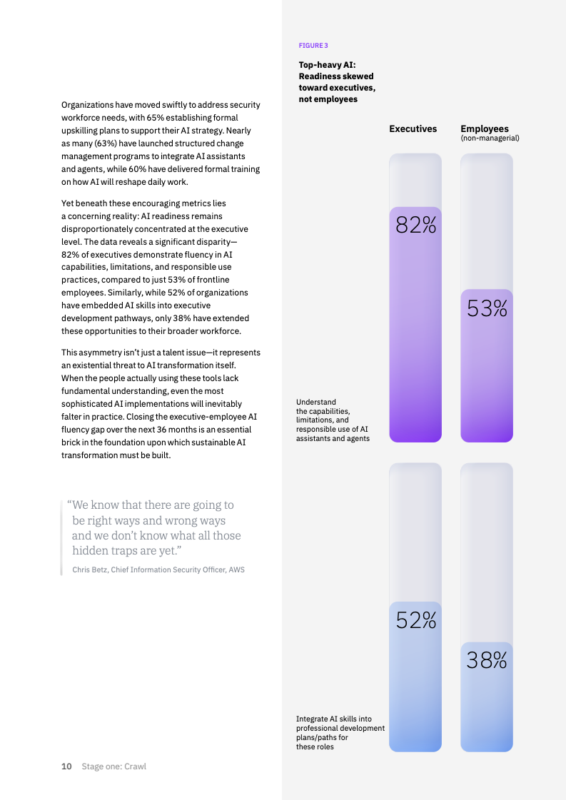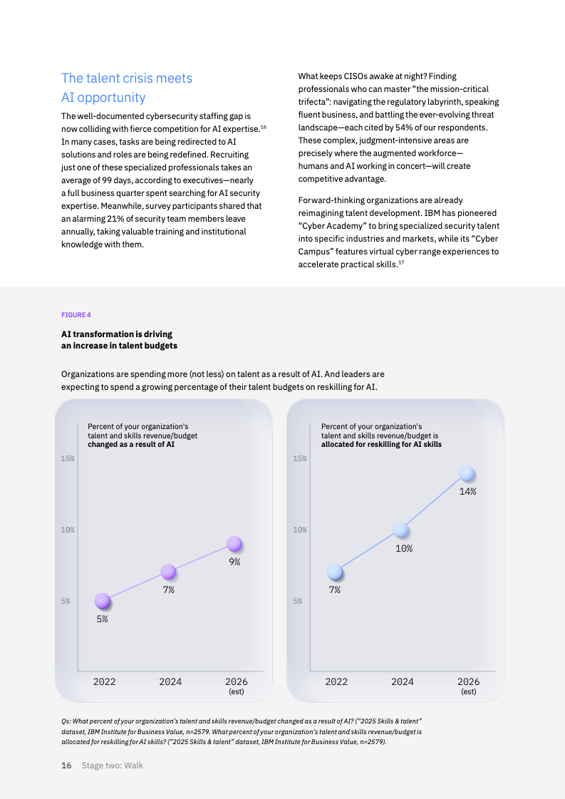 人才与运营成为制约AI安全效能的关键瓶颈。数据显示,高管与一线员工的AI素养差距显著(82%对53%)。同时,招聘一名AI安全专家平均耗时99天,团队年流失率高达21%。仅有24%的组织实现了人才、技术与安全战略的有效对齐,这直接影响了投资回报与运营效率。