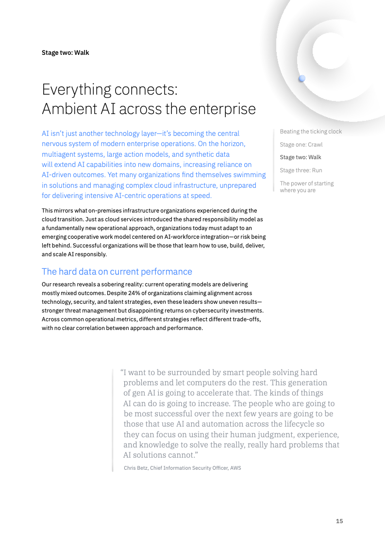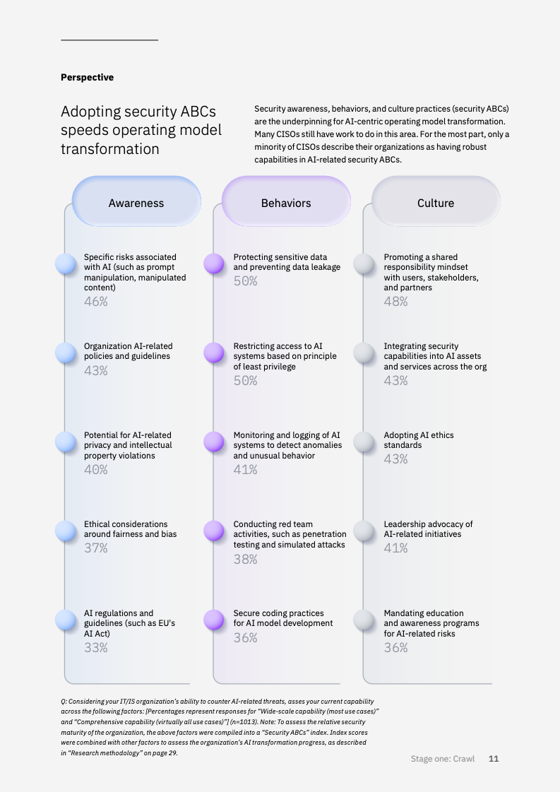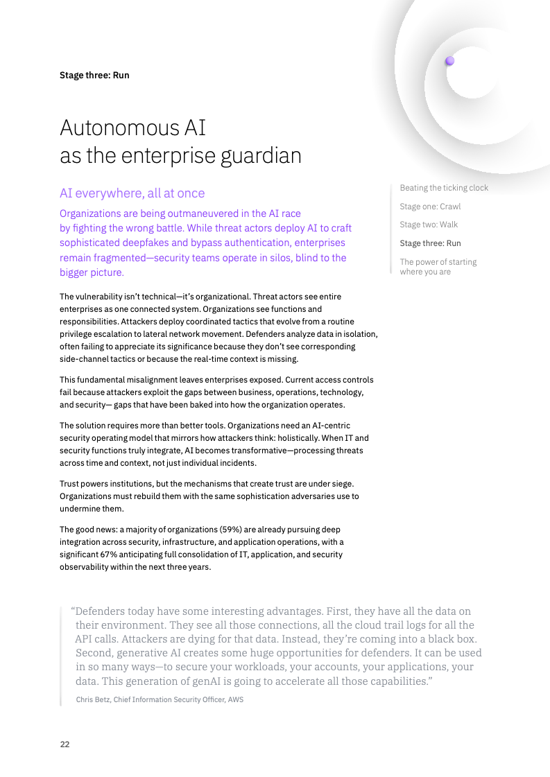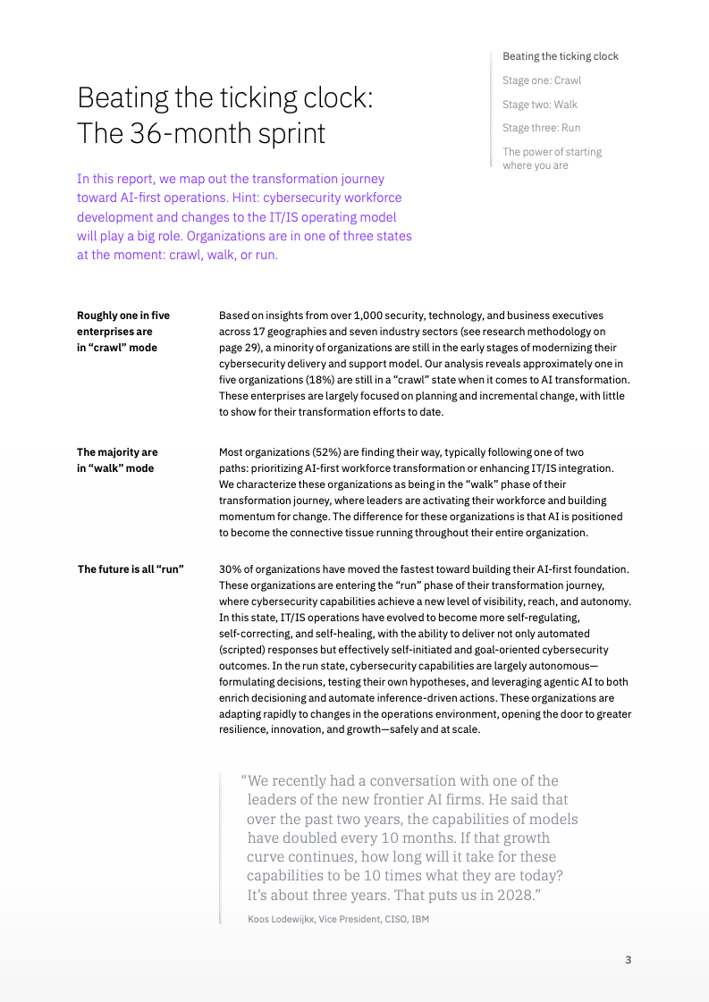 人工智能正重塑网络安全格局,未来36个月将是关键分水岭。调研数据显示,企业在AI安全应用上呈现三级分化:18%的企业处于“爬行”阶段,AI应用零散;52%进入“行走”阶段,开始系统性整合;而30%的领跑者已迈入“奔跑”阶段,构建了高度自治的安全运营体系。这一结构揭示了市场成熟度的不均衡分布。