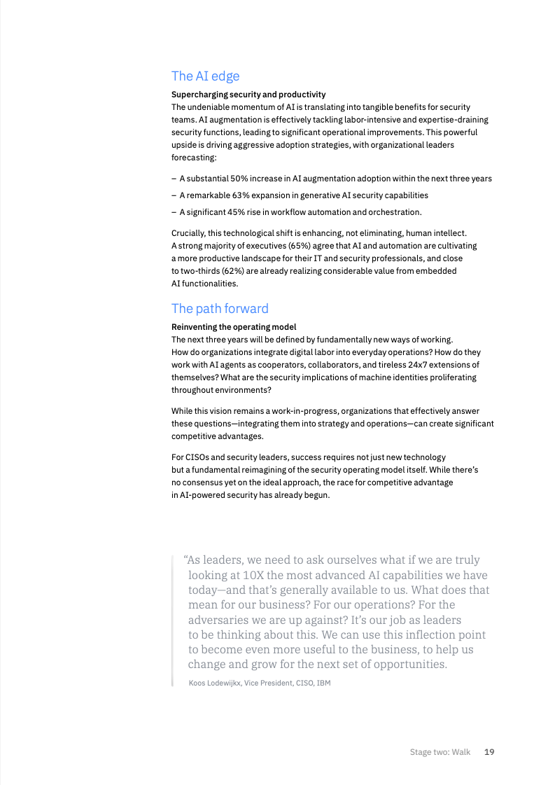 未来网络安全的竞争焦点正从被动防御转向自主智能运营。数据预示,企业安全模式将从以人为核心转向以AI代理为核心,实现威胁的自主预测、决策与响应。领跑企业与追赶者之间的差距,将取决于其能否将AI从战术工具提升为战略核心,构建能够自我修复和进化的集成化风险抵御体系。