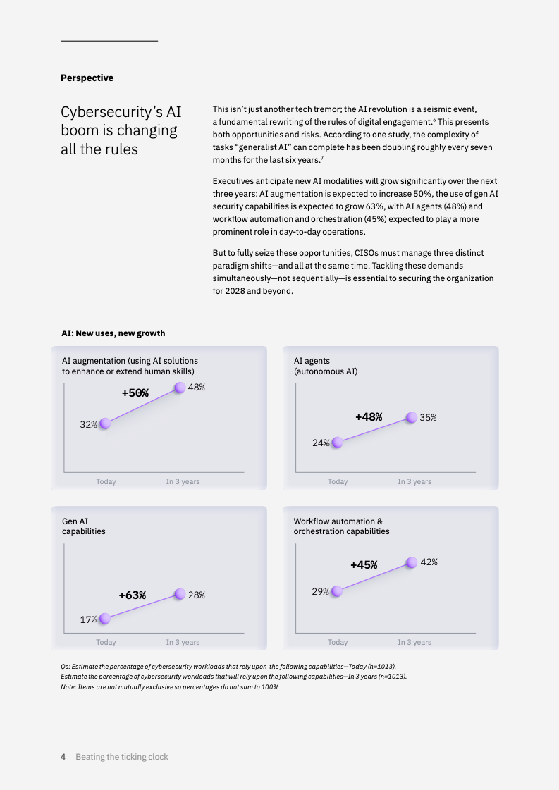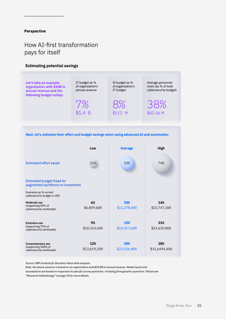 尽管挑战重重,AI在安全领域的价值已获数据验证。65%的高管确认AI提升了团队生产力,未来三年AI增强型应用预计增长50%,生成式AI安全能力将扩张63%。财务模型显示,年营收200亿美元的企业全面采用AI可节省10%至20%的安全预算,若实现100%工作负载由AI接管,则可释放高达2256万美元的资金用于战略再投资。