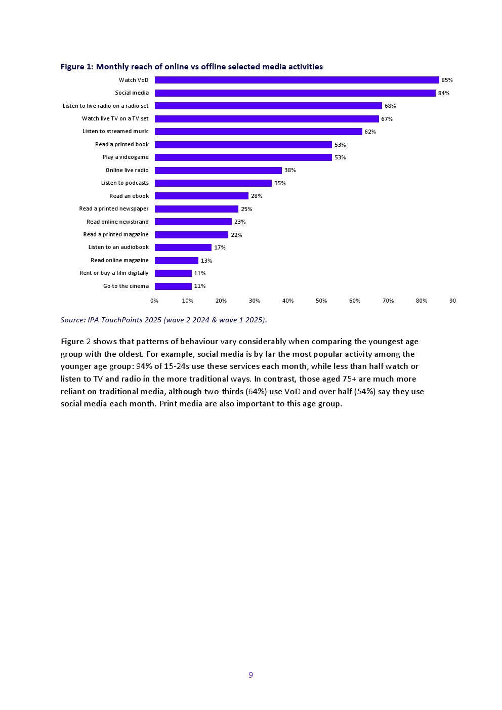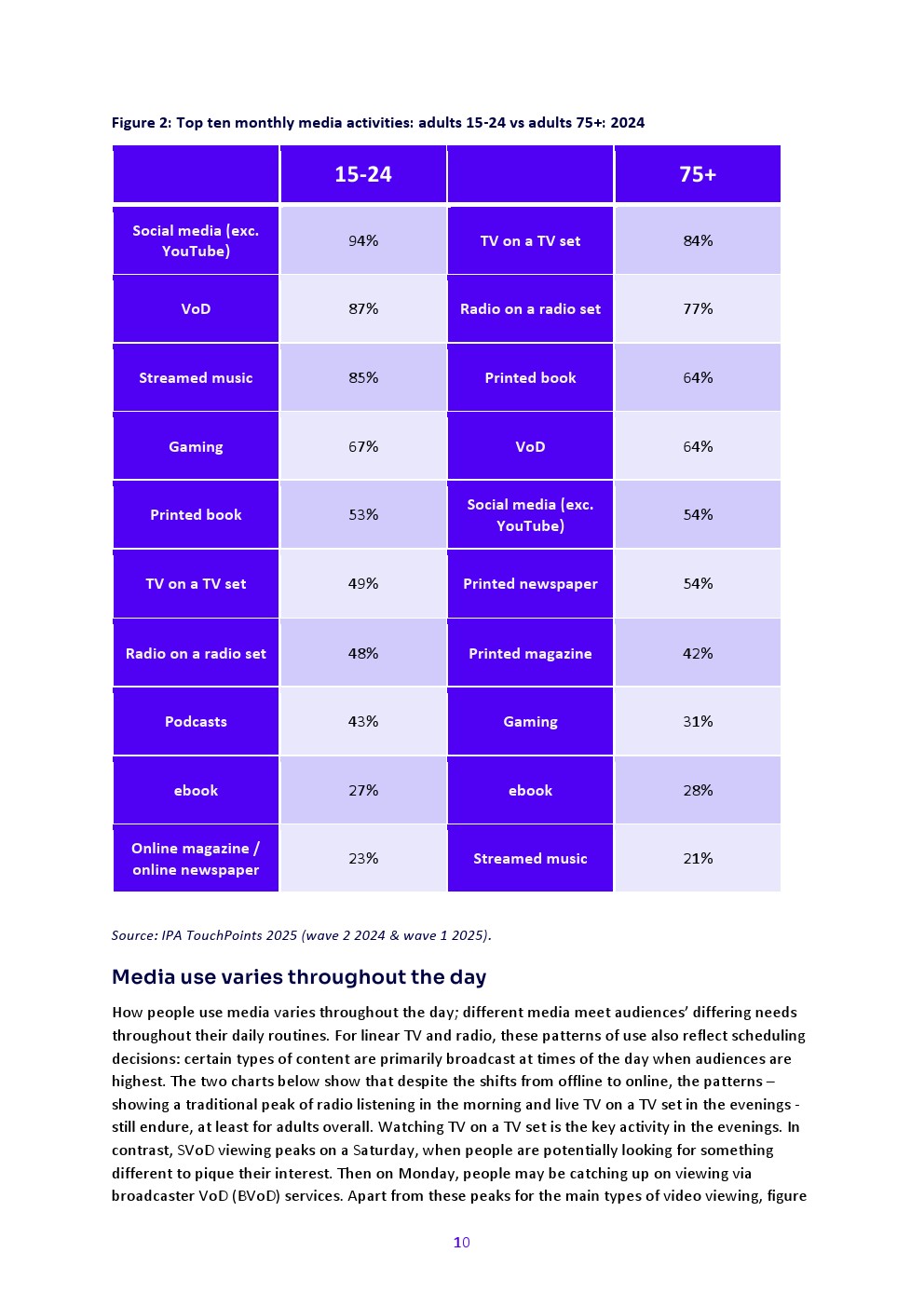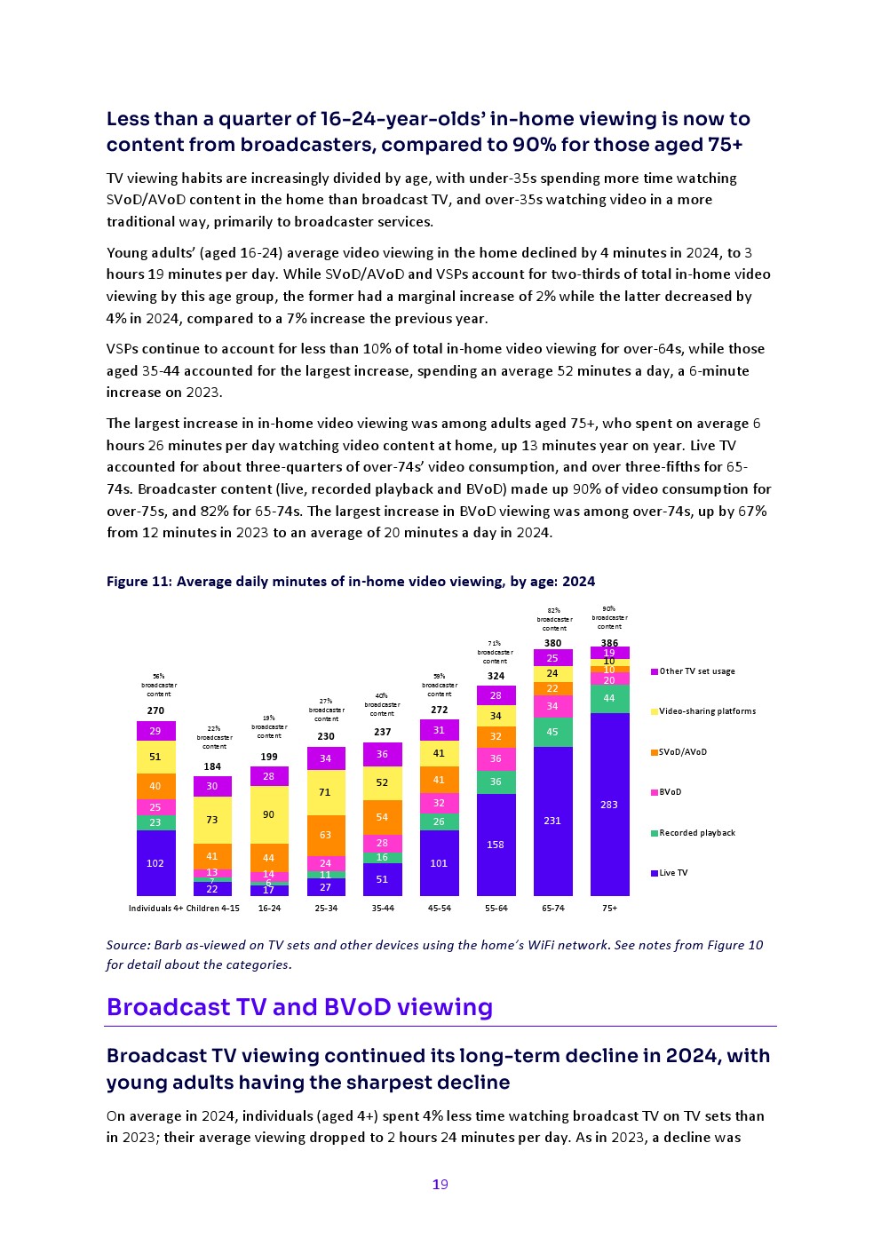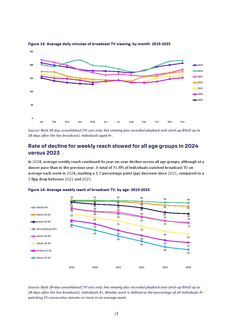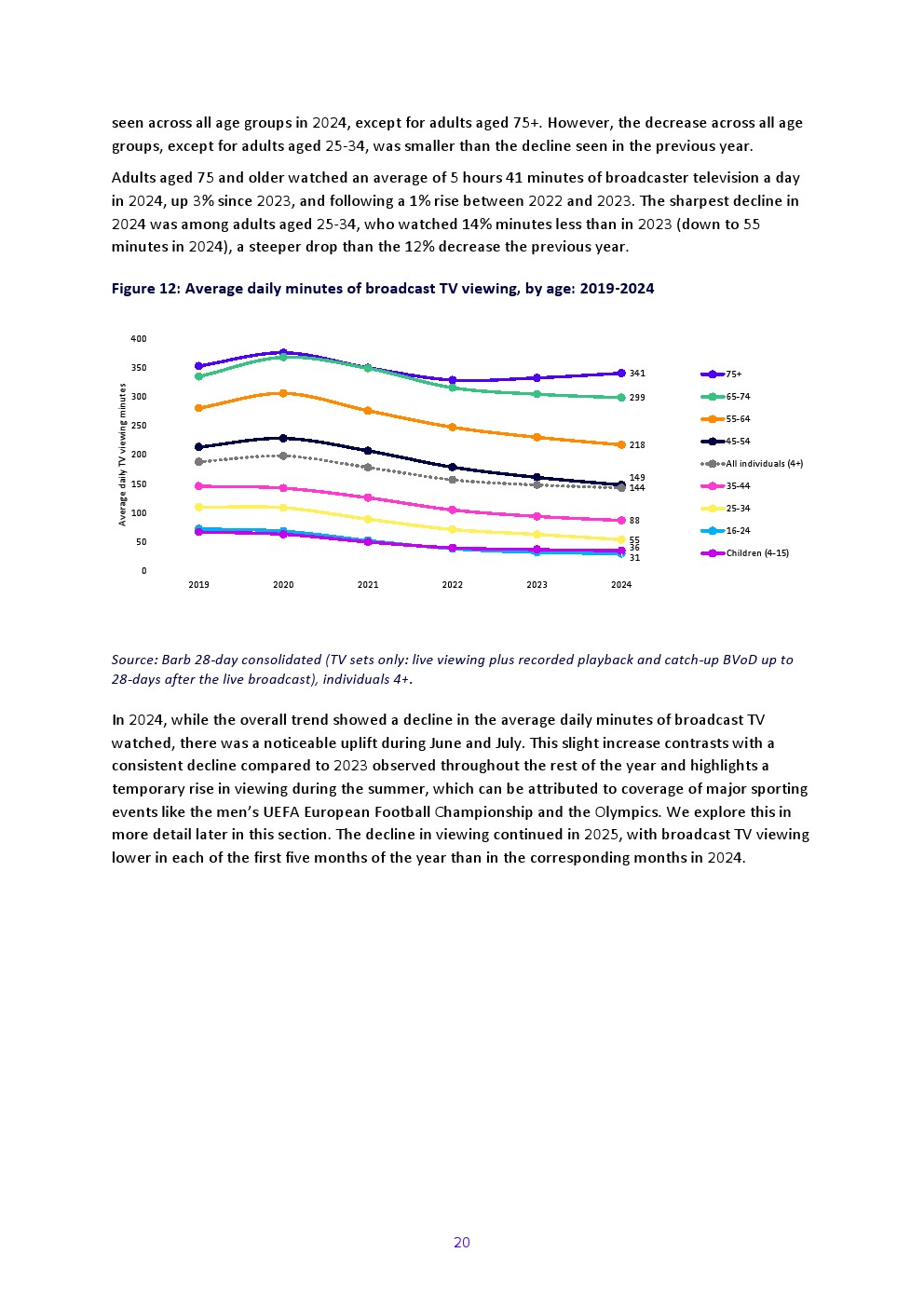 2024年广播电视观看量持续长期下滑,尤其在年轻成年人中。个人(4岁以上)日均通过电视机观看广播电视的时长较2023年减少4%,降至2小时24分钟。与2023年相同,除75岁以上群体外所有年龄段均出现下降,但除25-34岁成年人外,各年龄段降幅均小于上年。