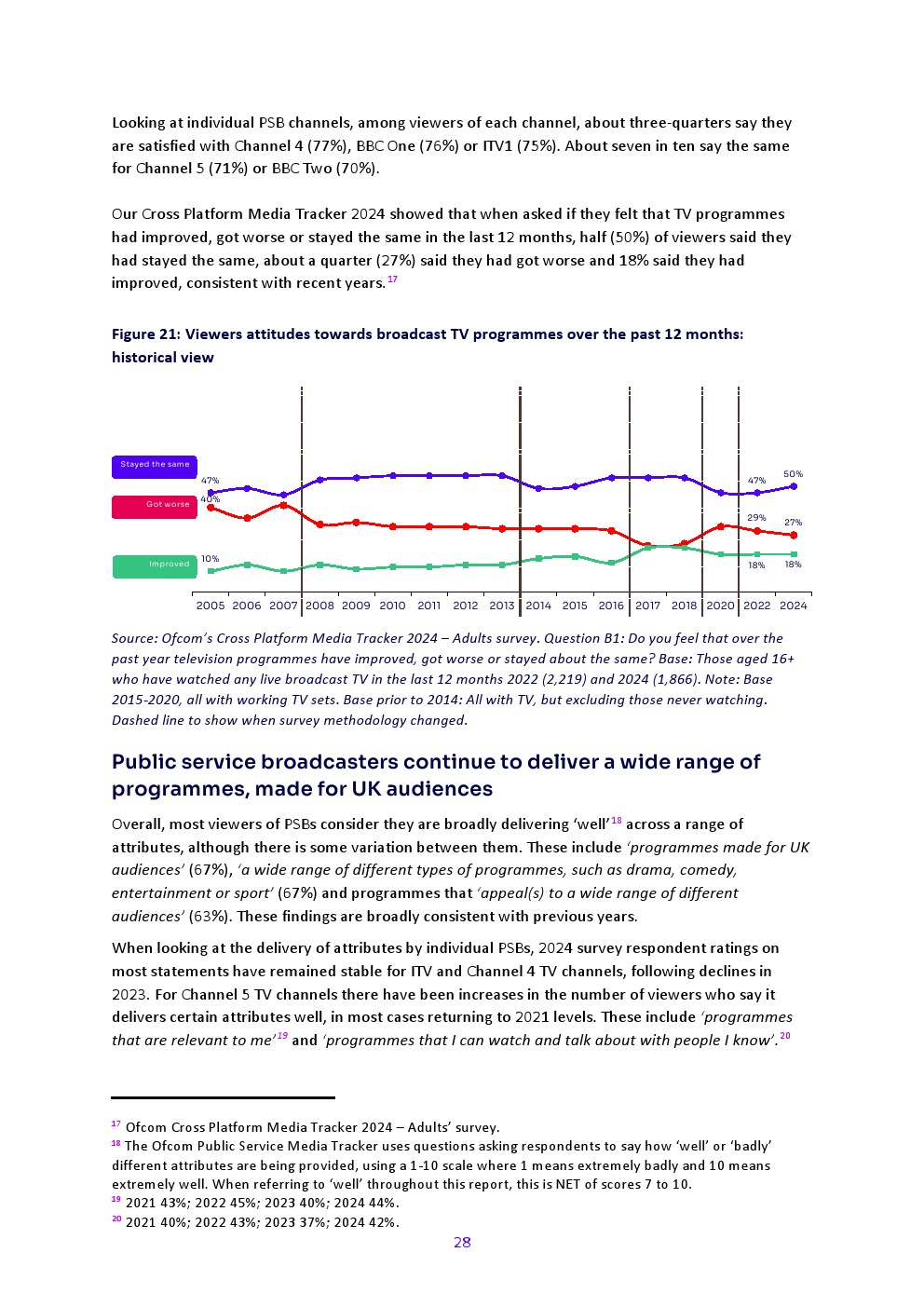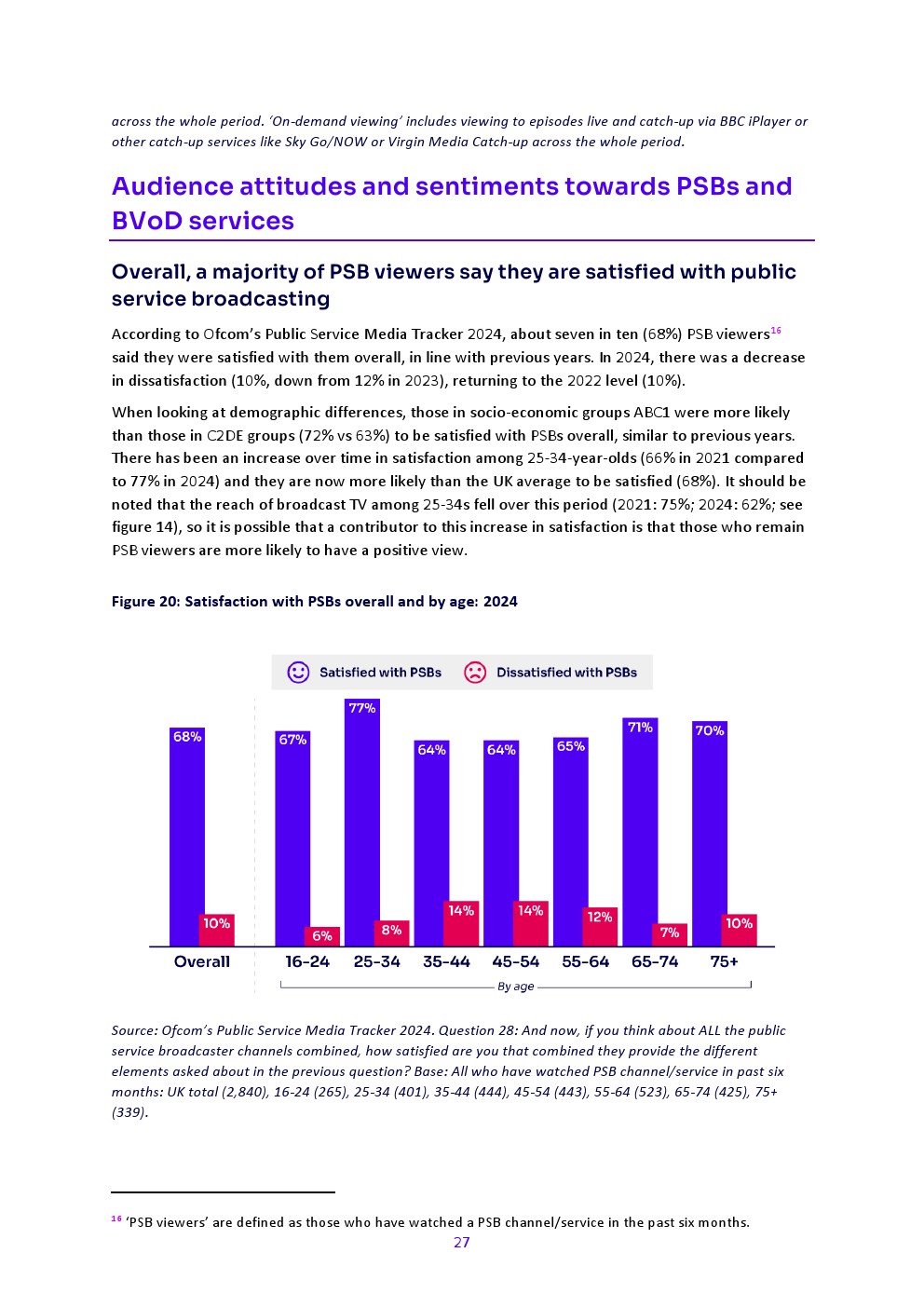 根据Ofcom“2024年公共媒体追踪调查”,68%的PSB观众表示总体满意,与往年持平。