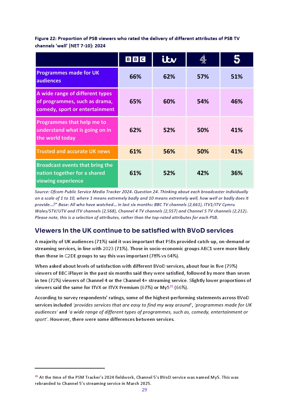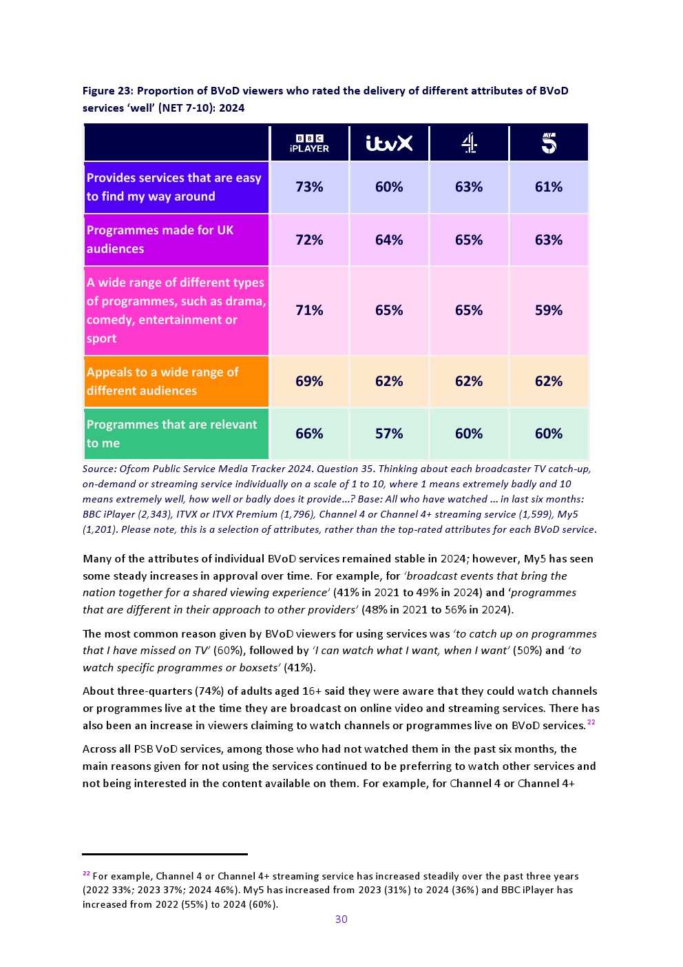 大多数英国观众(71%)认为PSB提供回看、点播或流媒体服务很重要(2023年为71%);社会经济群体ABC1中认为重要者比例高于C2DE群体(78% vs 64%)。