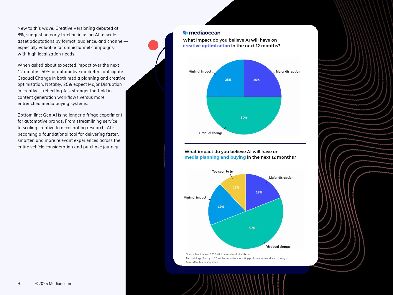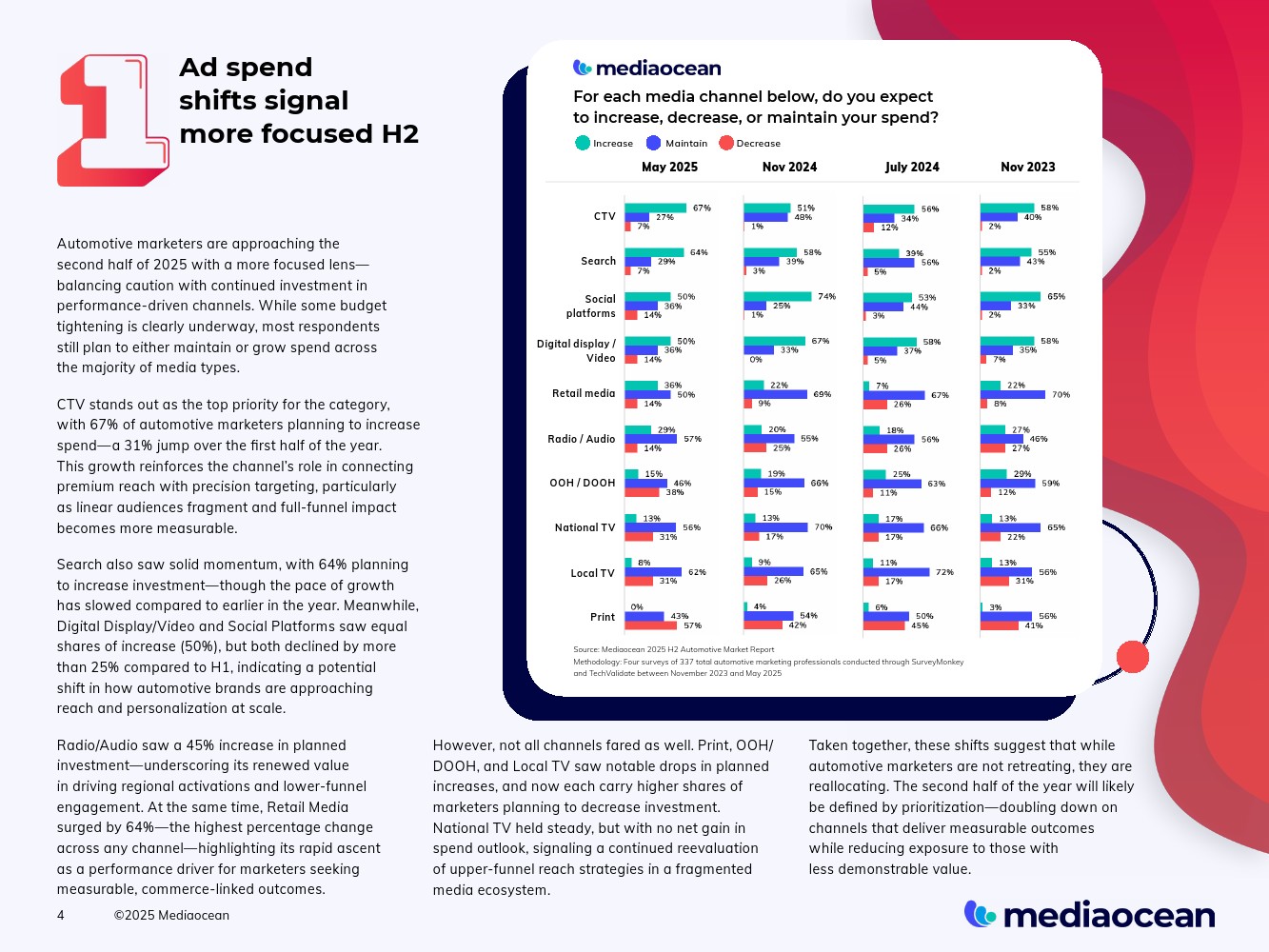 汽车营销人员正以更专注的目光接近2025年下半年——保持谨慎,继续投资于以业绩为导向的渠道。虽然一些预算紧缩正在进行中,但大多数受访者仍计划维持或增加大多数媒体类型的支出。