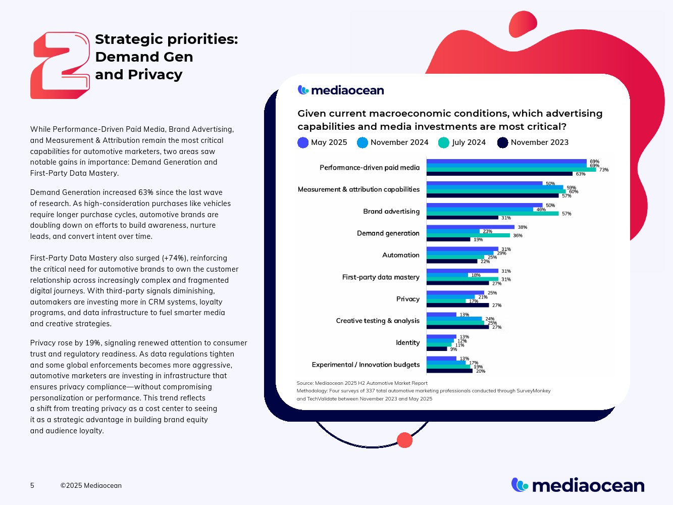 搜索引擎也有强劲的增长势头,64%的公司计划增加投资——尽管增长速度与今年早些时候相比有所放缓。与此同时,数字显示/视频和社交平台的份额增长相同(50%),但与上半年相比均下降了25%以上,这表明汽车品牌在大规模接触和个性化方面的潜在转变。