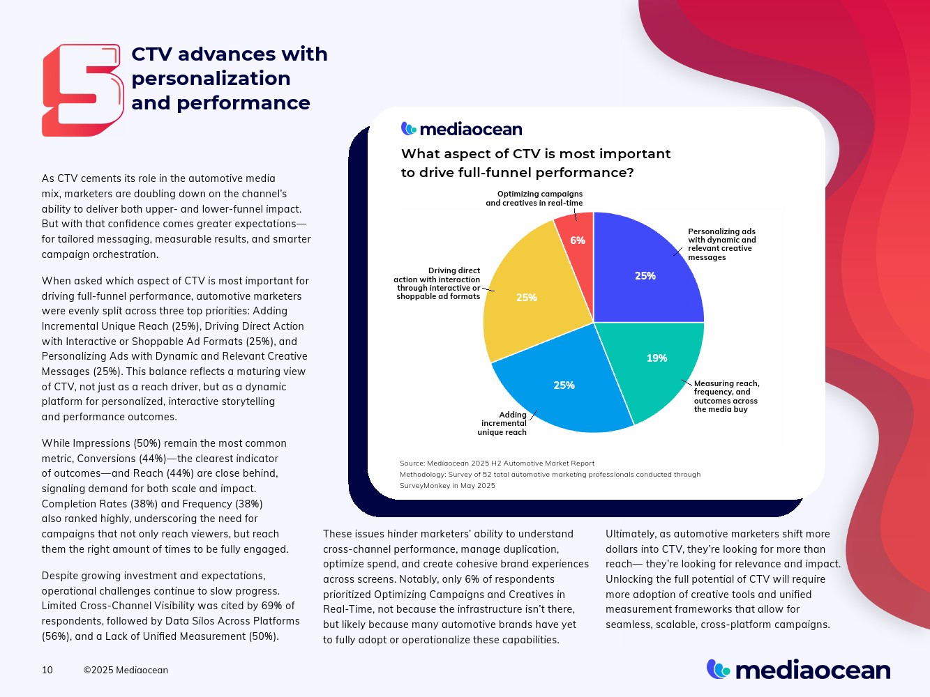 CTV是这一类别的首选,67%的汽车营销人员计划增加支出,比今年上半年增加了31%。这种增长强化了渠道在连接优质受众和精确目标定位方面的作用,特别是在线性受众碎片化和全渠道影响变得更可衡量的情况下。