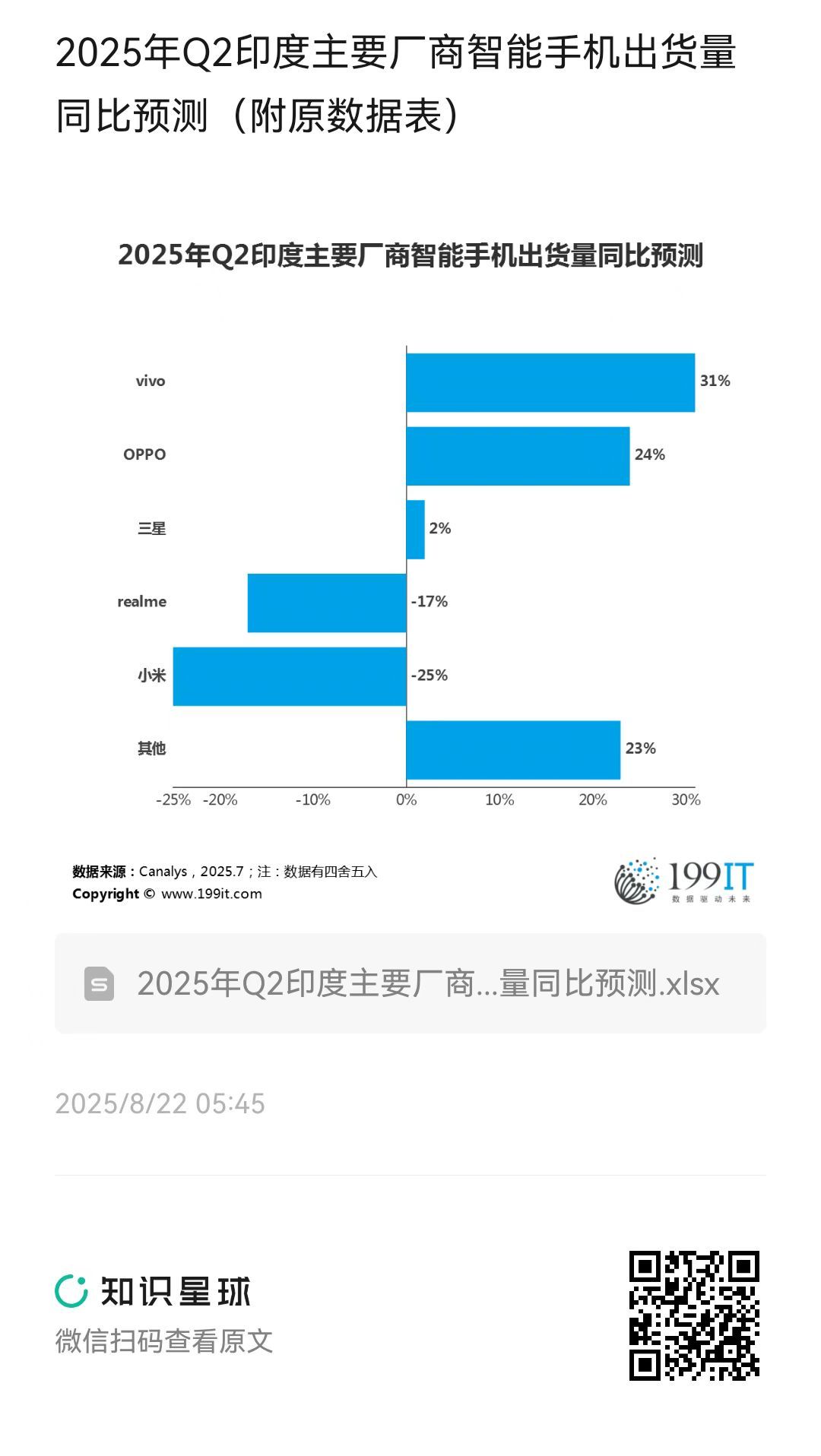 - 2025年Q2全球主要厂商智能手机出货量预测(附原数据表)