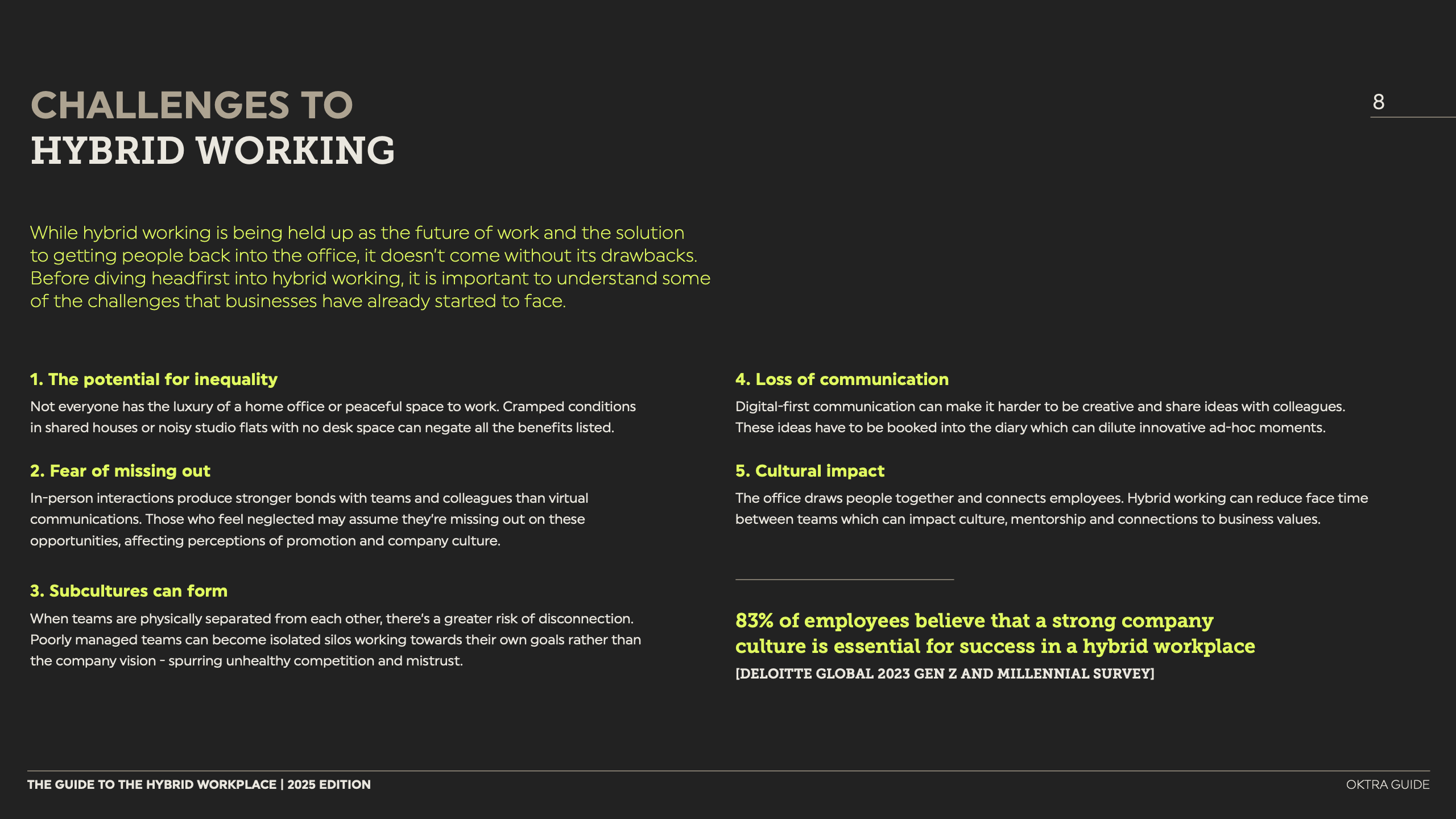 比空间管理更为深刻的挑战,在于企业文化的维系与重塑。德勤的调查显示,83%的员工坚信,强大的企业文化是混合办公模式成功的基石。当物理上的接触减少,如何通过技术与制度设计,维系团队的凝聚力、促进知识共享与创新碰撞,并确保企业价值观的有效传递,已成为决定混合办公模式成败的深层次战略议题。