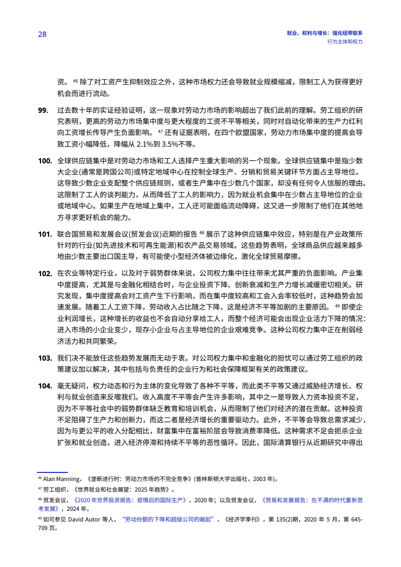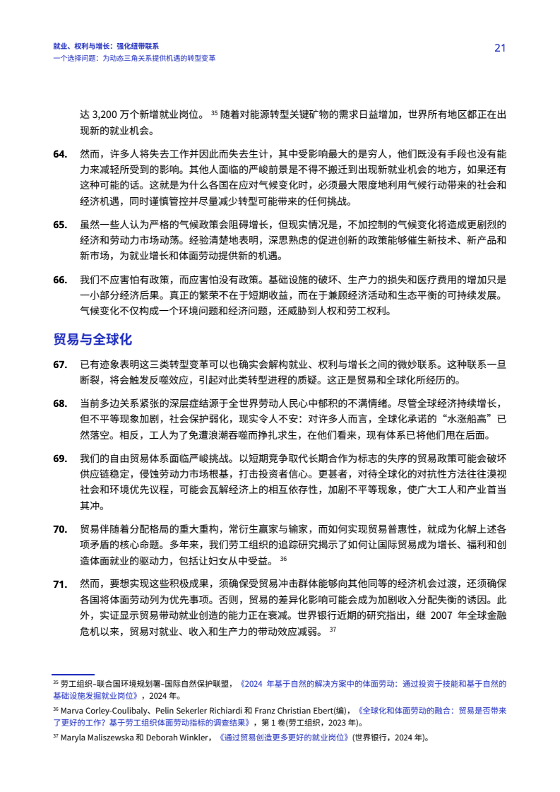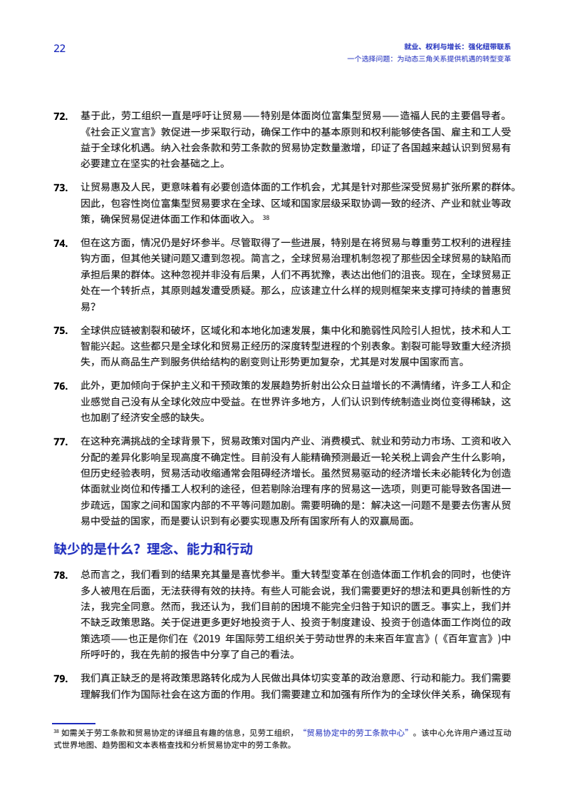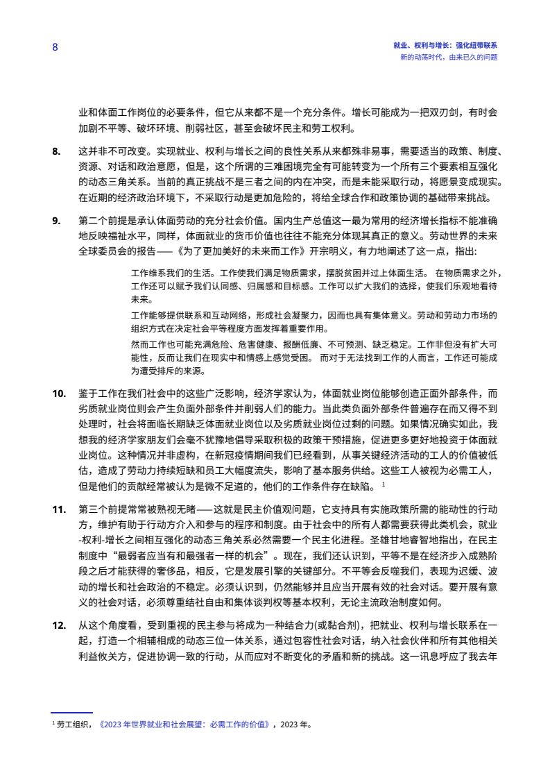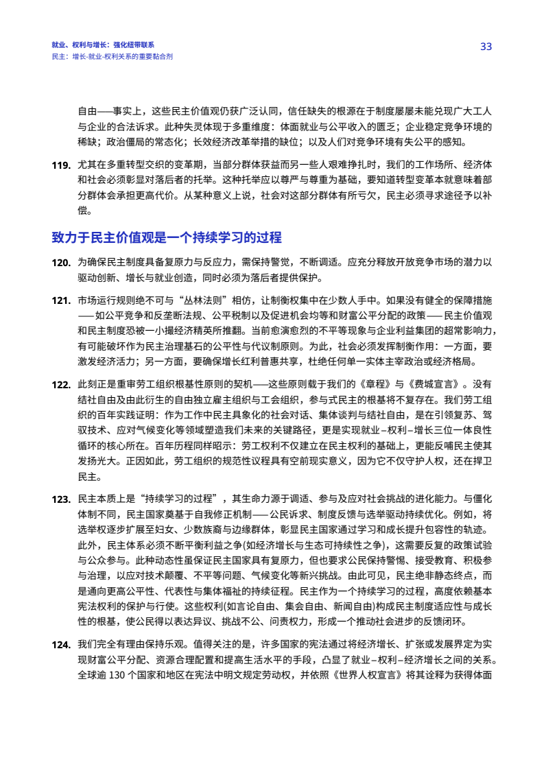 这份报告——我向国际劳工大会提交的第三份报告—重申,社会正义的实现有赖于强化就业、权利与增长之间的纽带联系。本报告还进一步阐明,这种稳固关系由民主价值观和民主制度共同维系—它们确保问责、参与、公平,以及至关重要的民主参与。我们深知:社会对话让人民能够对那些与他们切身相关的问题发声,从而确保他们不再只是被动接受结果,而是主动参与制定关乎人类共同未来的解决方案。