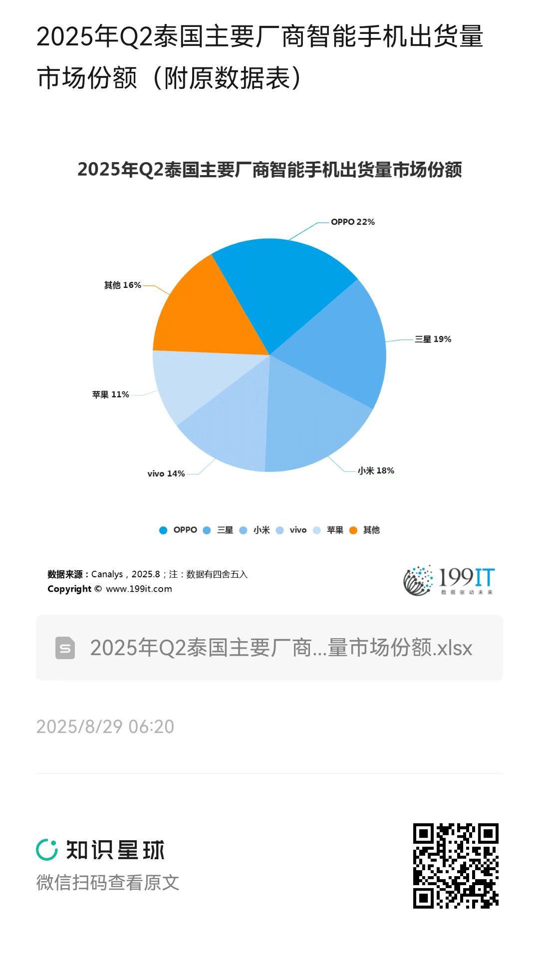 2025年Q2泰国主要厂商智能手机出货量市场份额(附原数据表) ​​​