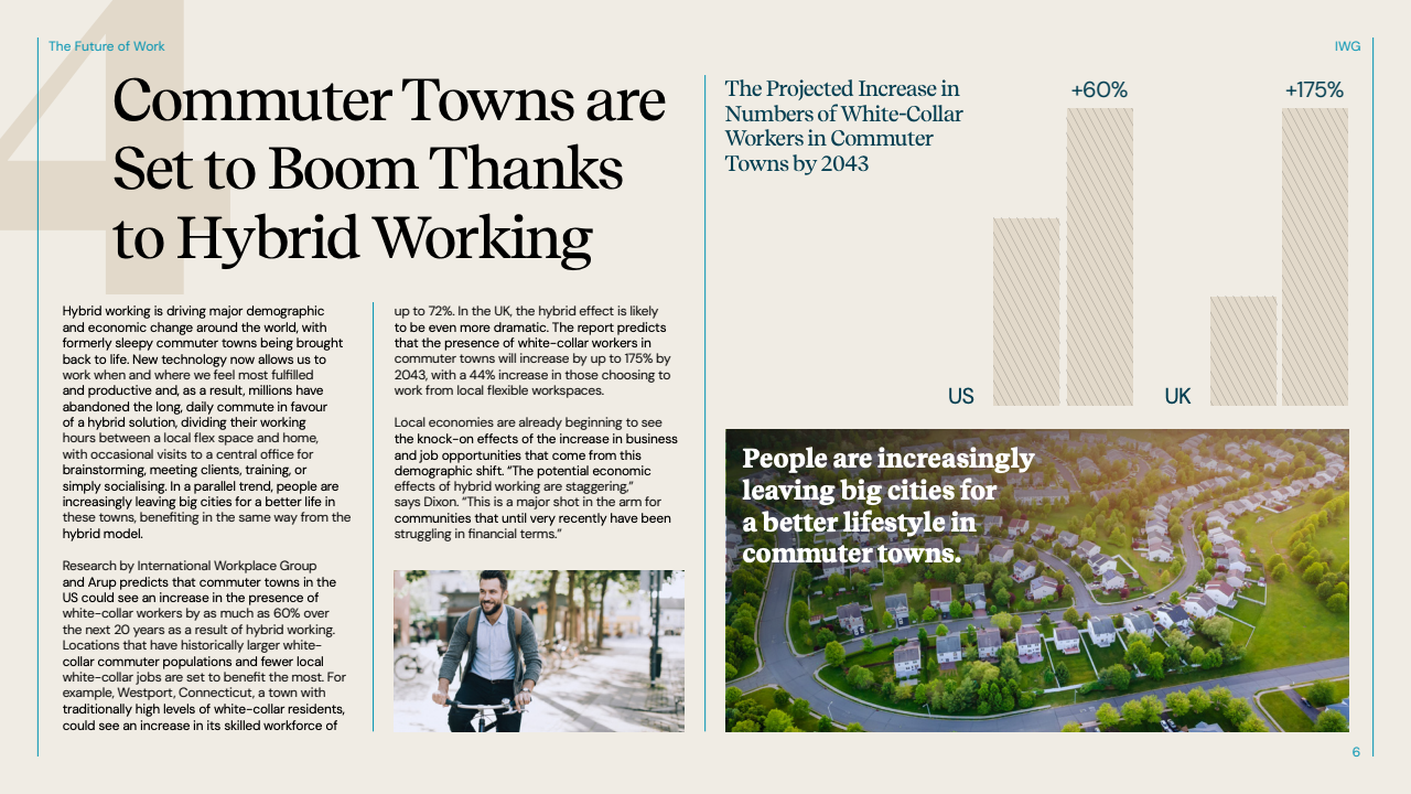 混合办公模式推动了通勤小镇的经济复兴与人口回流。 IWG-Arup模型预测,至2043年美国通勤城镇白领常驻人数可增60%。 英国通勤城镇白领常驻人数可高达175%。 其中44%以上将在本地灵活办公场所工作,带动本地消费与就业。