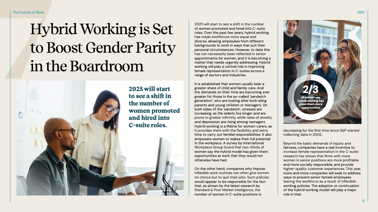 混合办公模式有助于实现C-Suite(高管层)的性别平衡。 IWG调研发现,三分之二的女性认为混合模式带来原本难以获得的职场机会。 僵化坐班政策正导致C-Suite女性占比首次下滑。