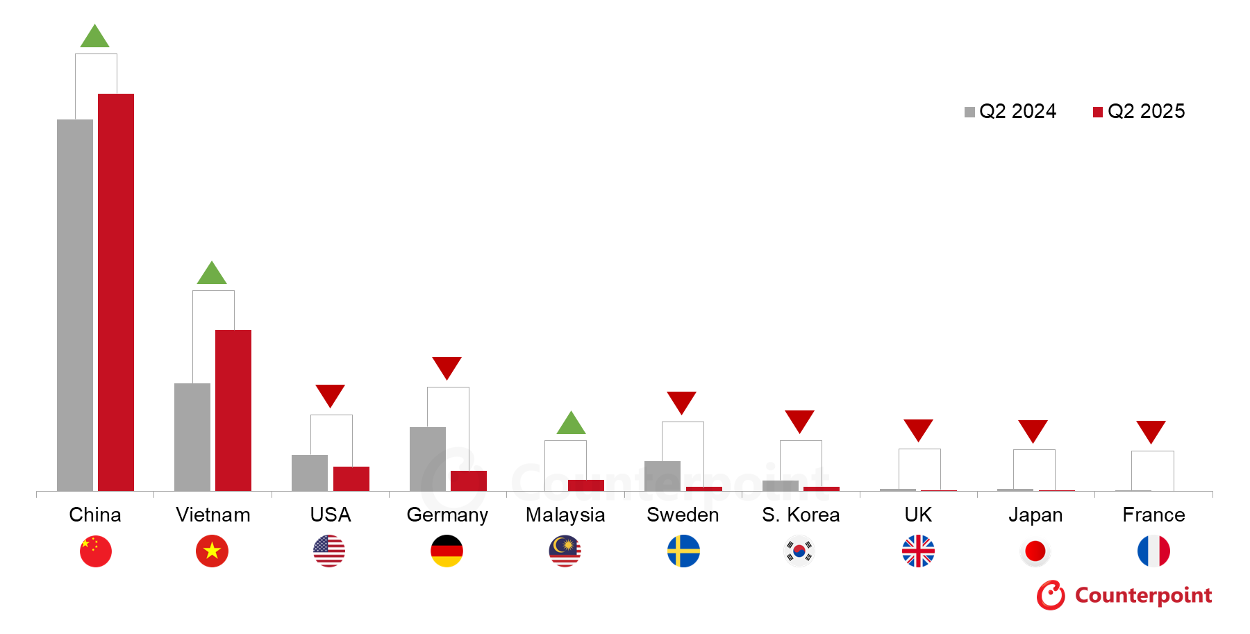 第二季度,中国原始设备制造商的市场份额增长至63%,他们通过本地化生产、更广泛的电动汽车产品线和有竞争力的定价策略,迅速适应了东南亚市场,这表明市场生态系统越来越青睐中国电动汽车战略。越南的VinFast也提高了其市场份额,突显出国家产业政策和产能提升如何转化为市场收益。马来西亚的份额也有所增加。